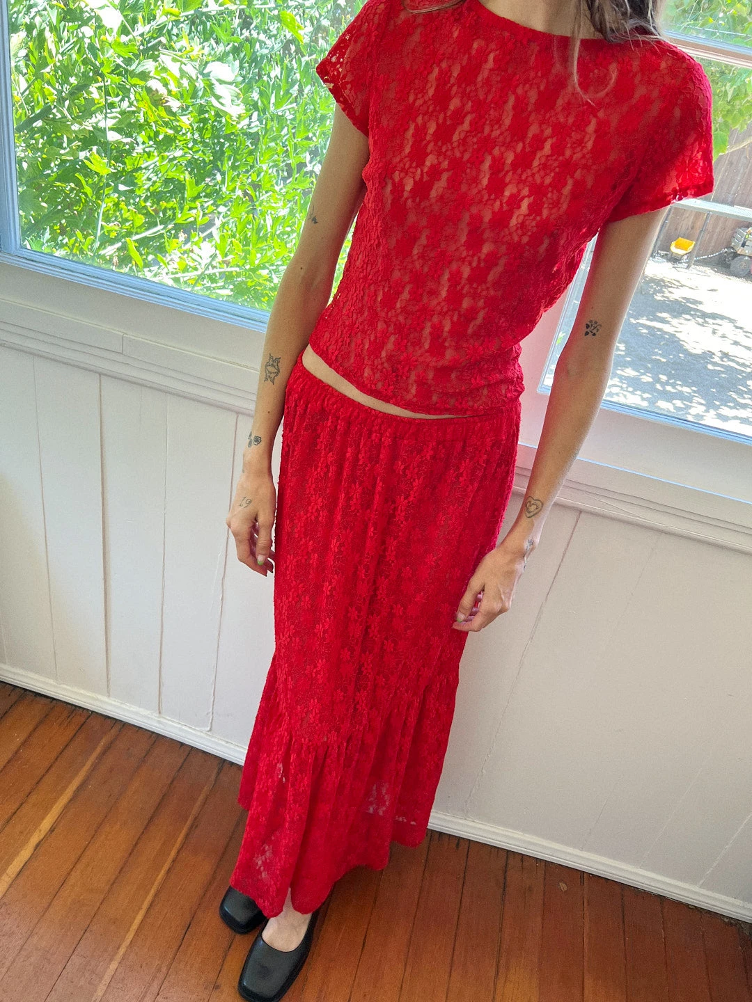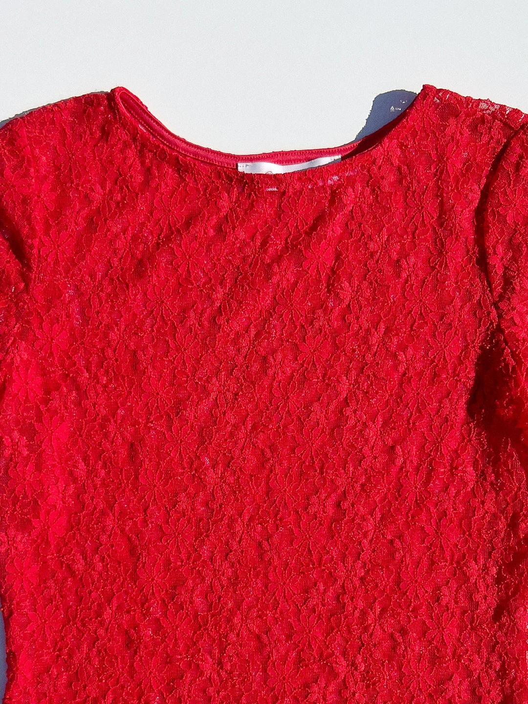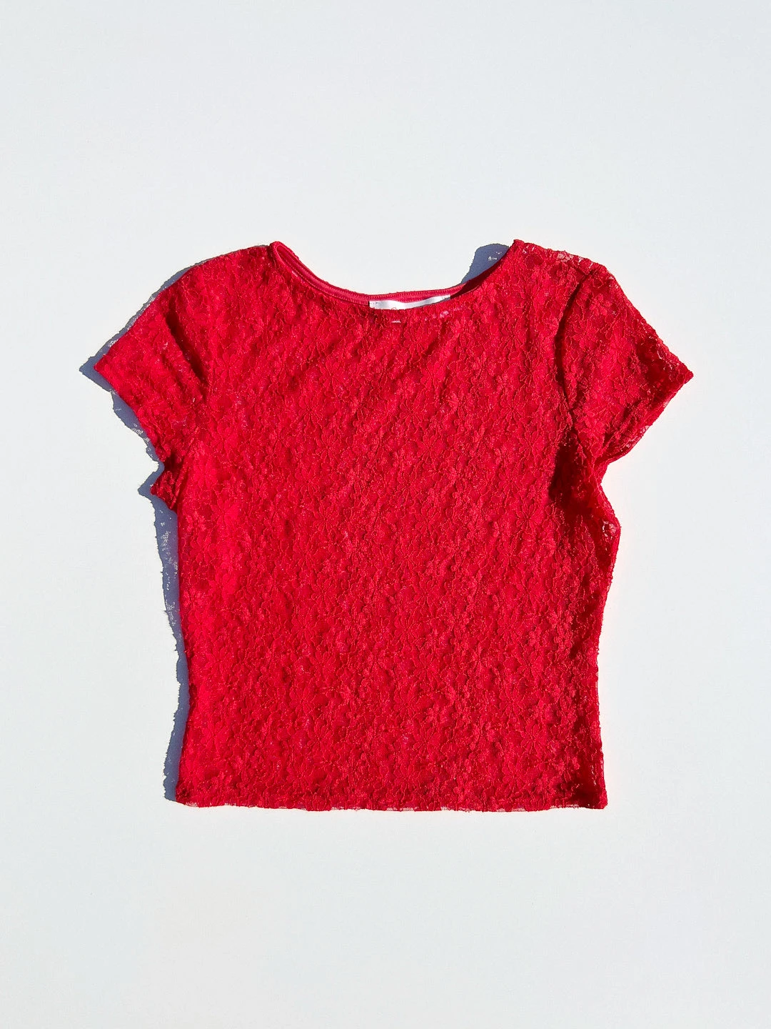 Classic red cropped baby t-shirt in a sheer lace fabric with a slight stretch.
