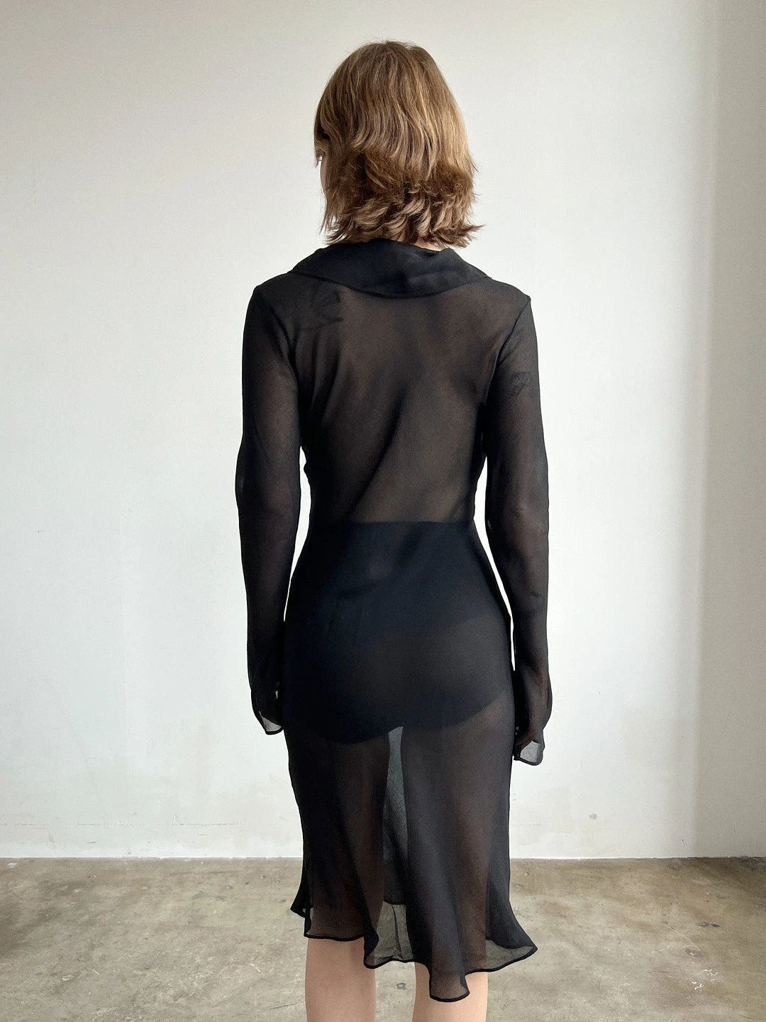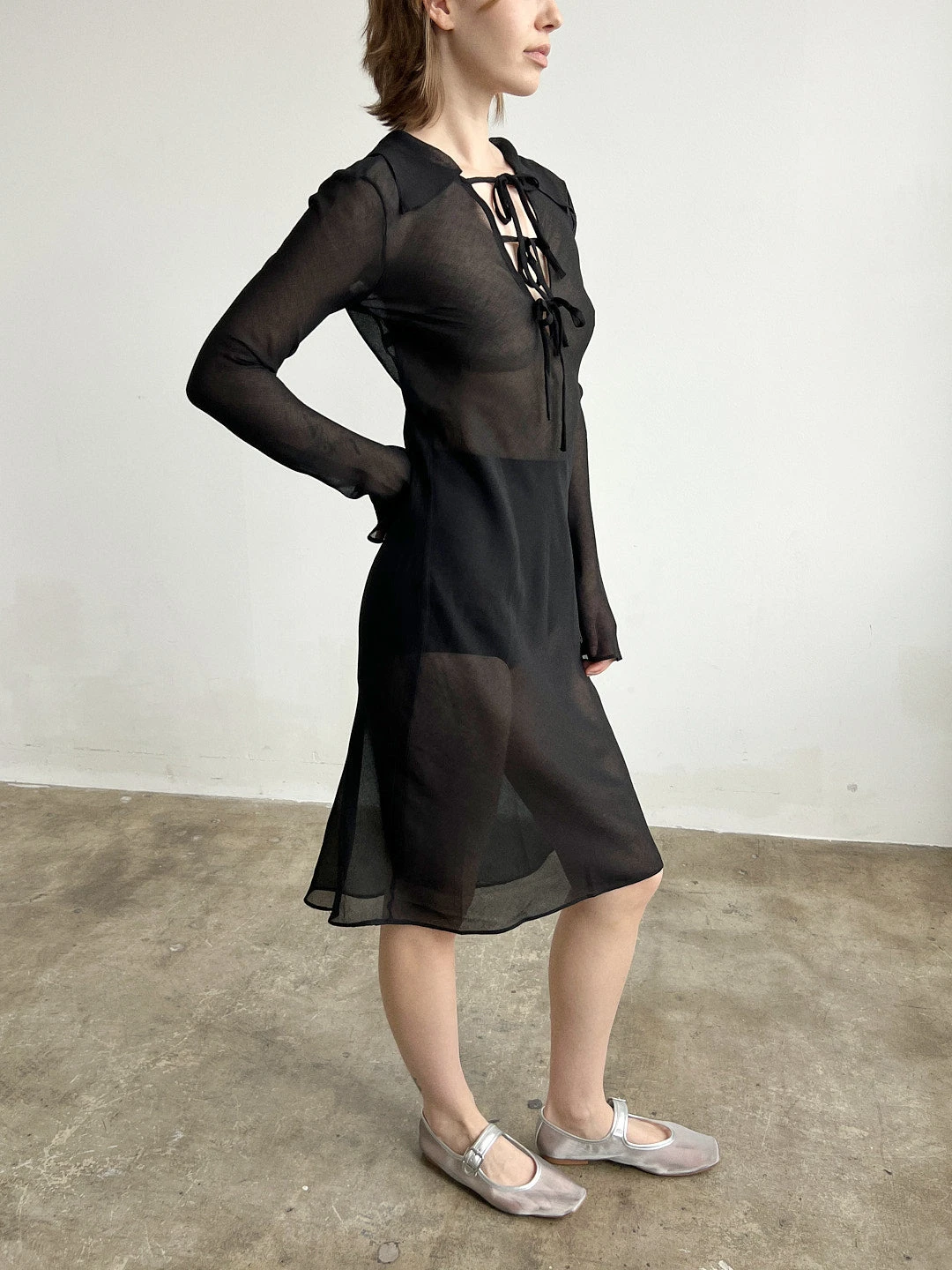 Sheer black tunic that features three tie closures, and slightly flared sleeves.
