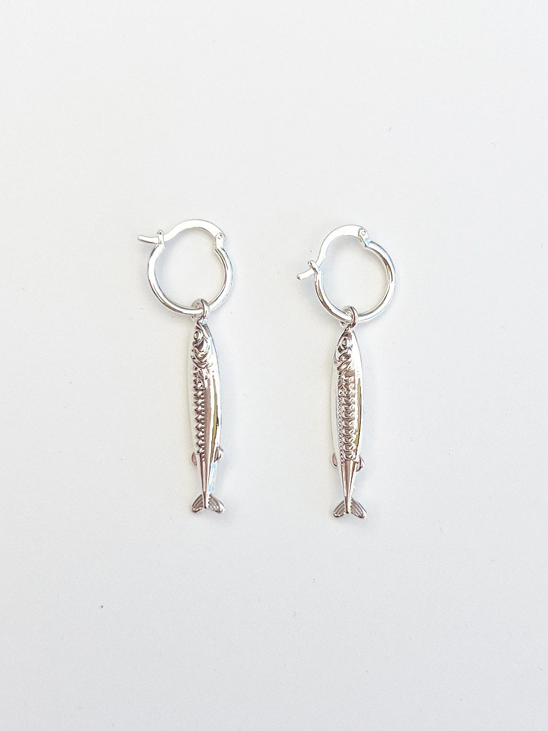 A pair of silver plated hoops with anchovy charms. Includes two earrings.