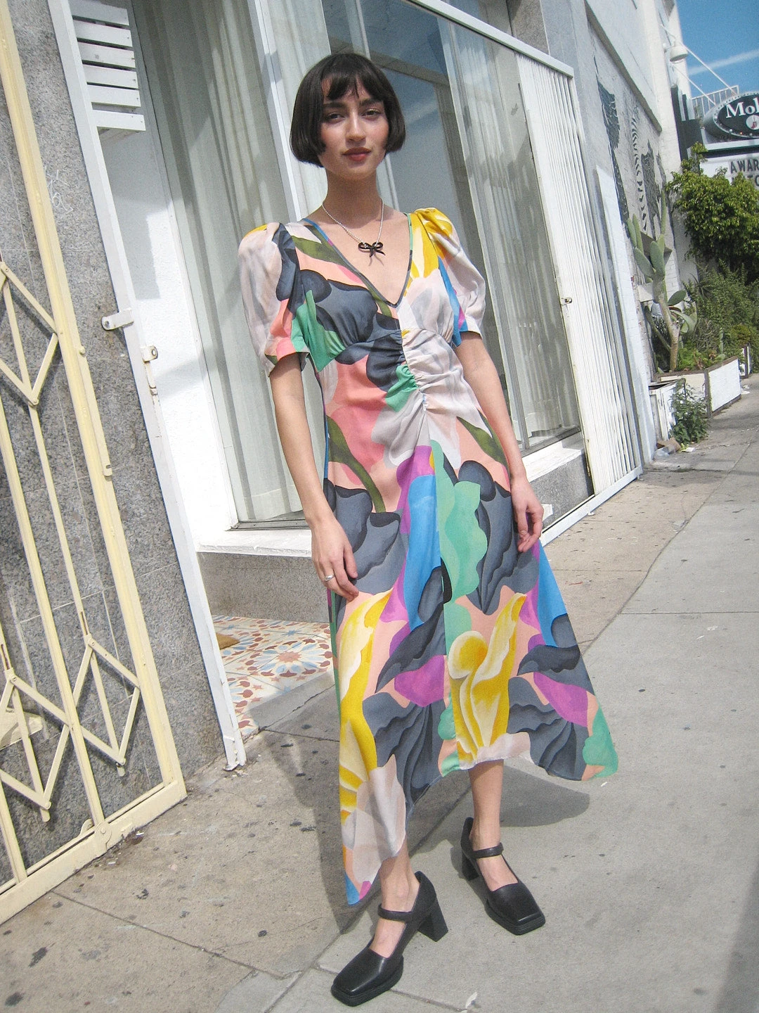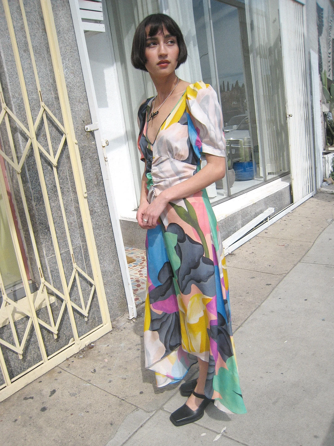 A gorgeous vintage-cut dress with a modern painted floral design. Made with a soft and silky tencel fabric. Features a puff sleeve, gathered bust, drop empire waist and an asymmetrical skirt.