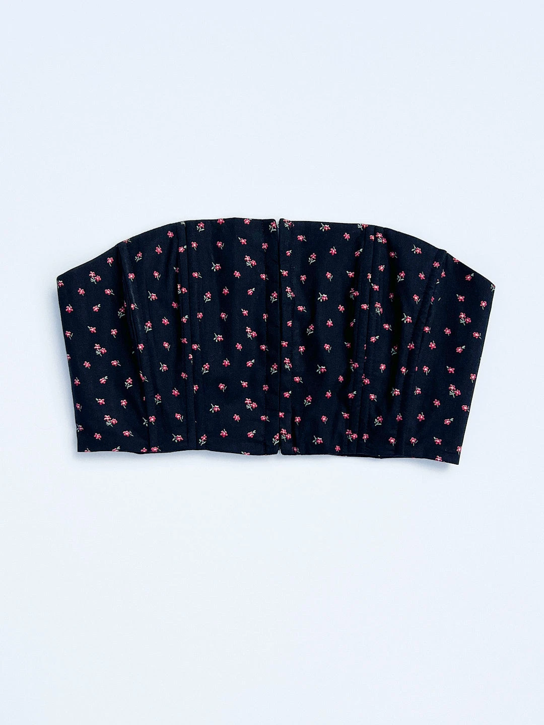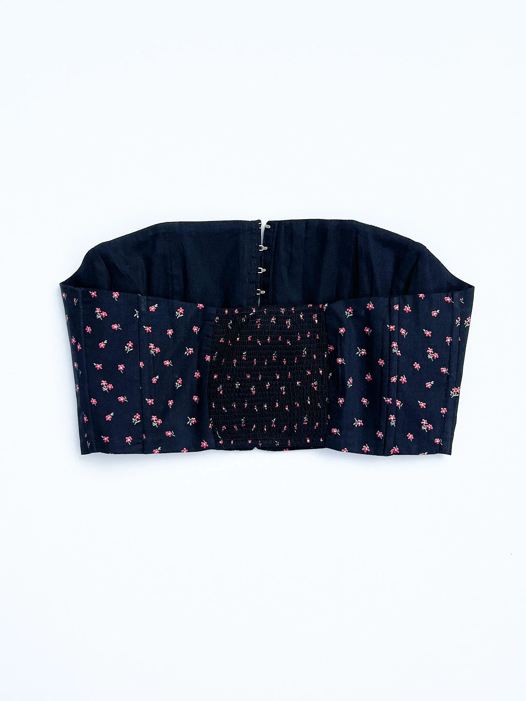 Fully lined cotton bustier with a delicate floral pattern featuring hook & eye closure at front, boning and smocking at back.