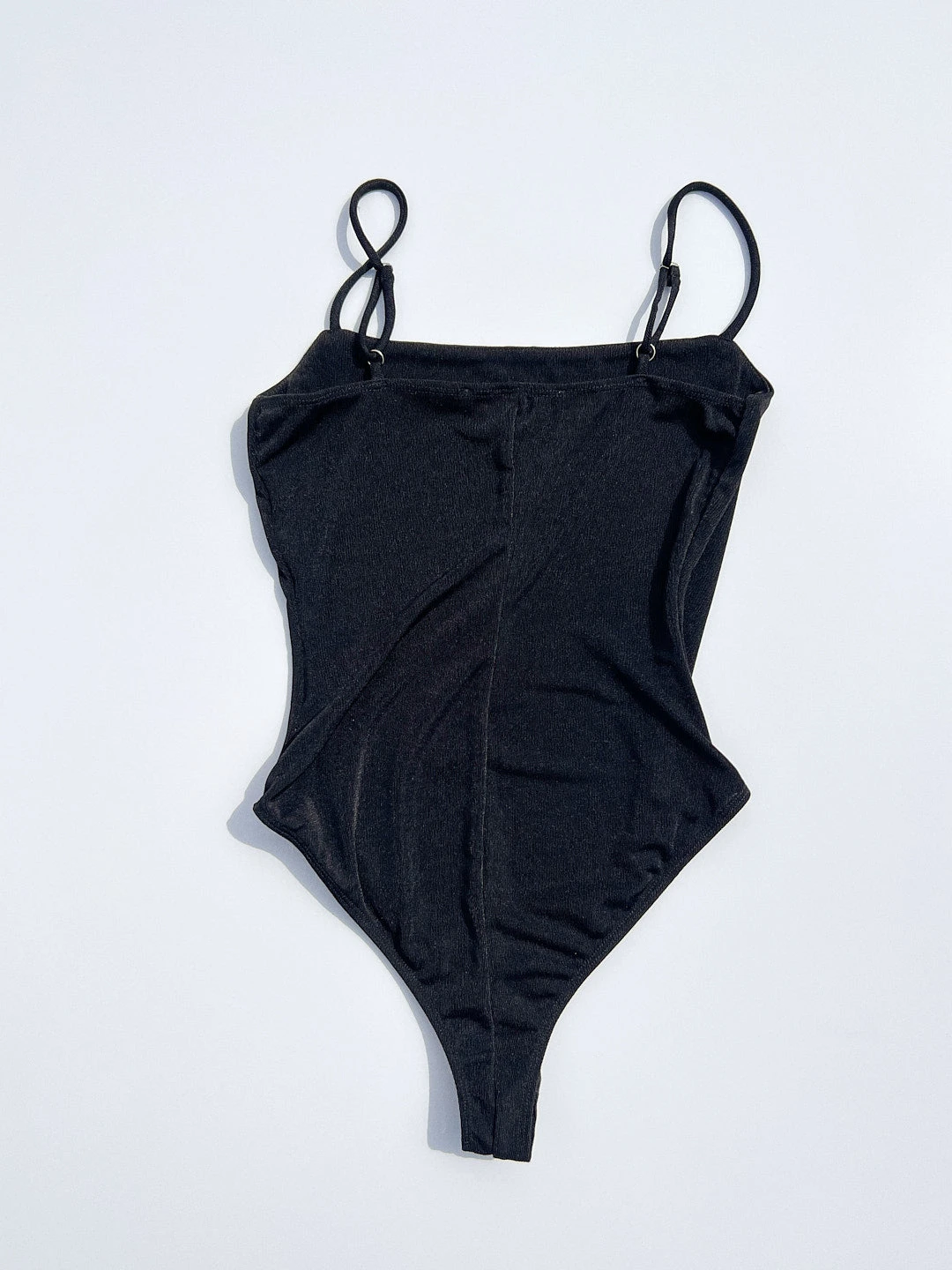 Black slinky spaghetti strap bodysuit with a cheeky cut, snap closure gusset and adjustable straps.