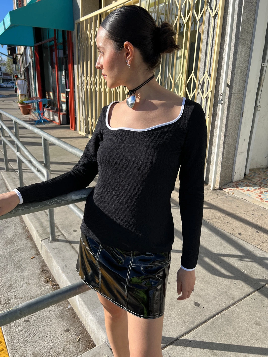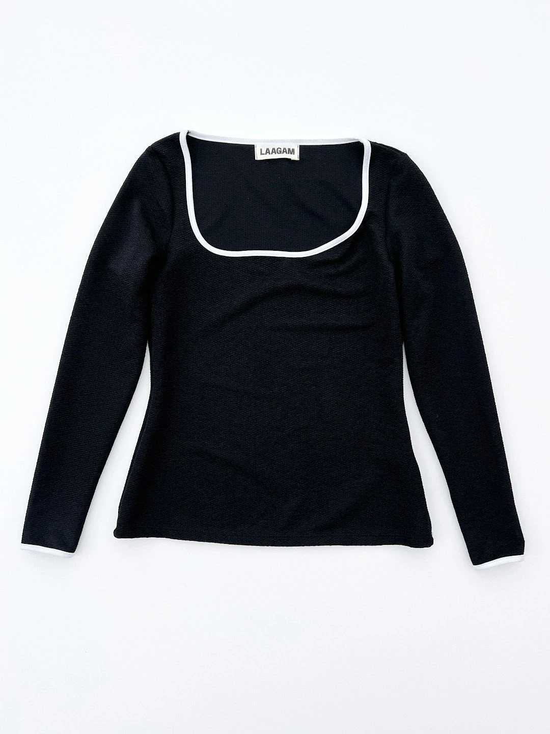 From Spanish label Laagam, the Bourgeois Top is a ’90s inspired black long sleeve shirt with white piping. Fitted look with slight stretch.