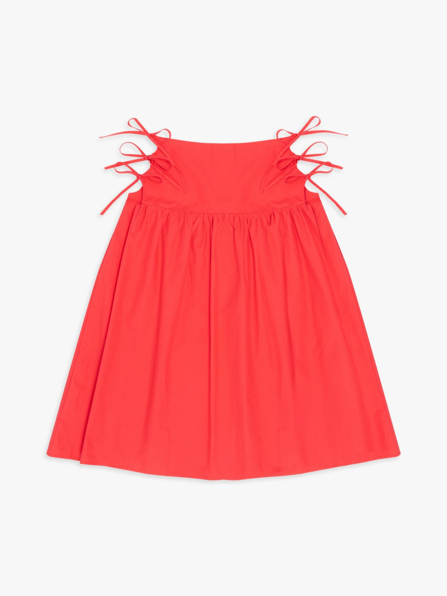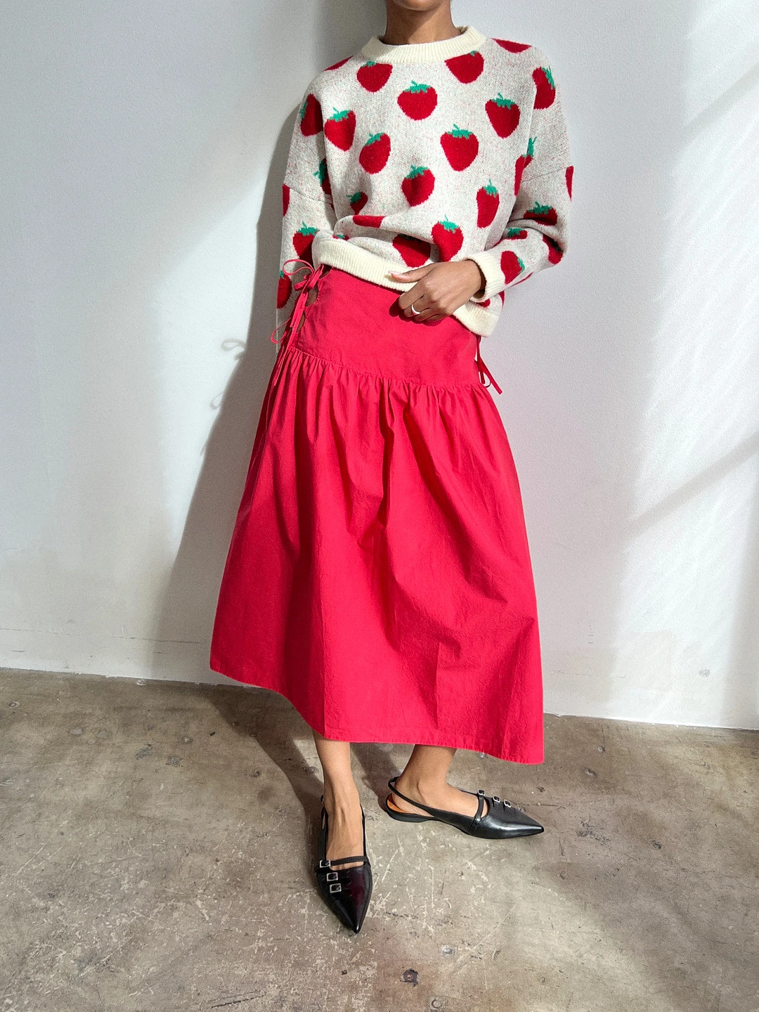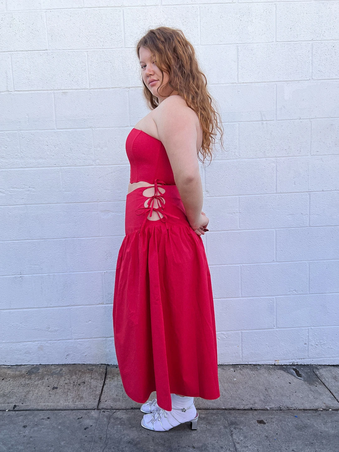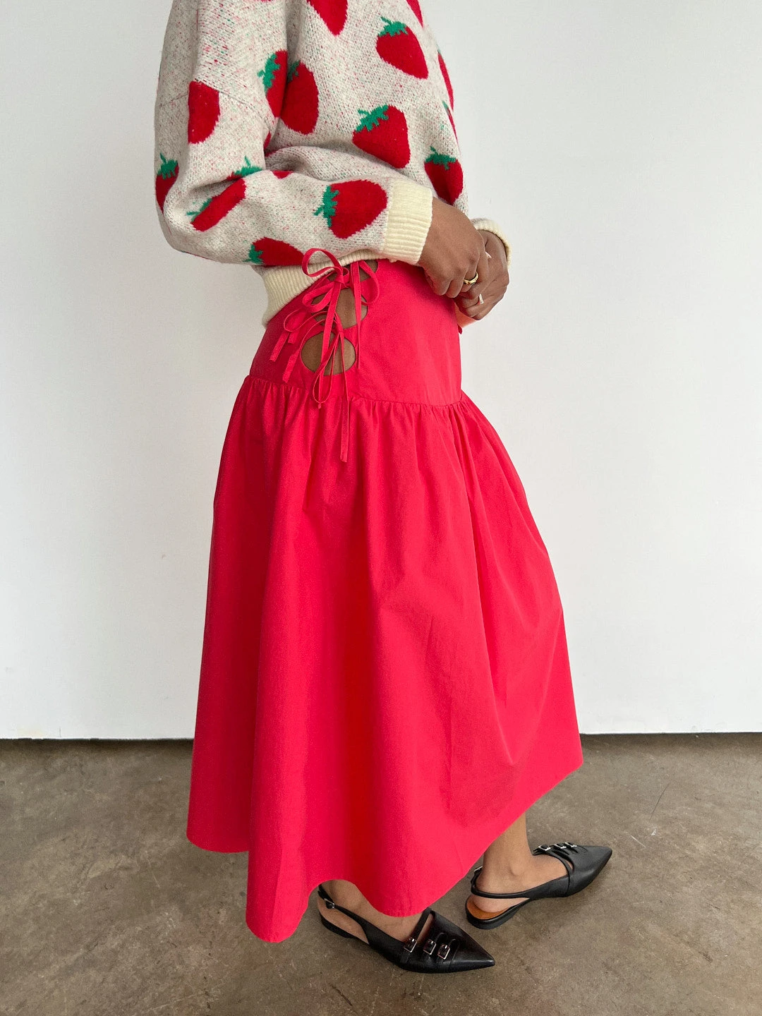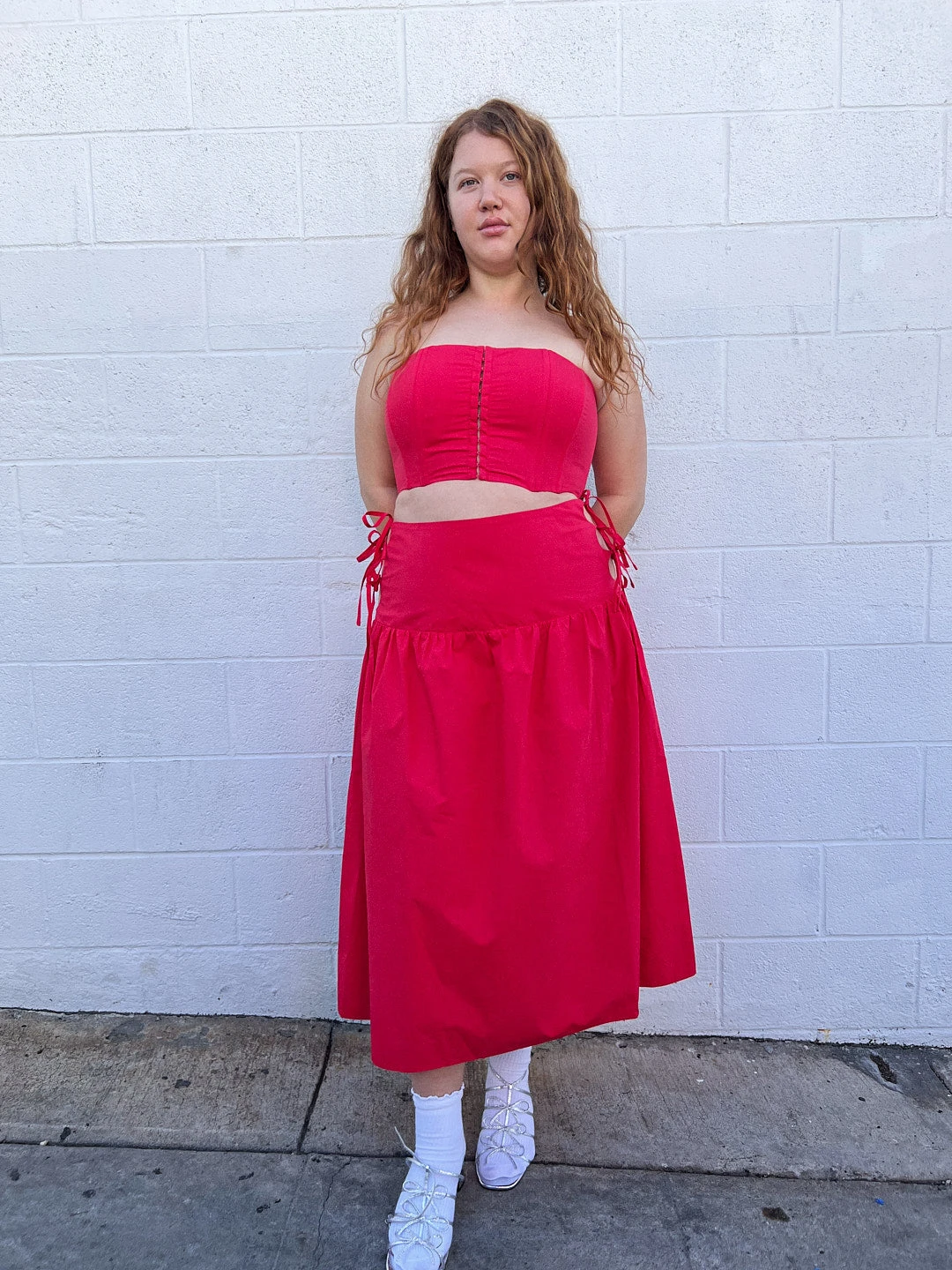 A romantic red skirt with intricate details from NY designer Allina Liu. This midi length skirt features open cutouts ad the waist with adjustable bow ties. Made with cotton poplin with no stretch. If between sizes, recommended to size down.