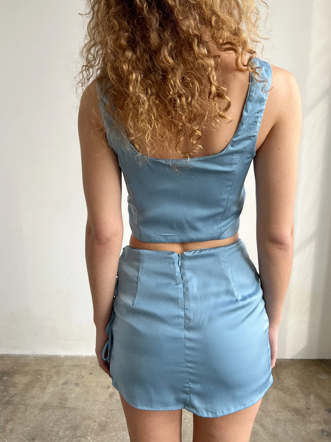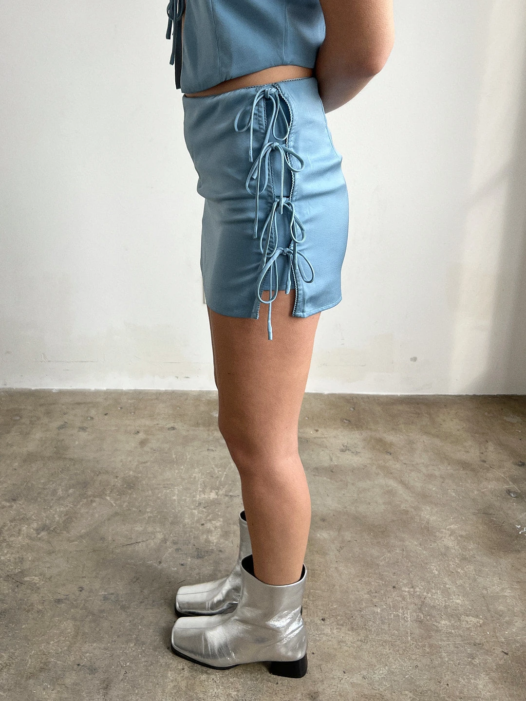 Satin blue mini skort with bow tie detailing on the side and lace detailing and a back zip.
