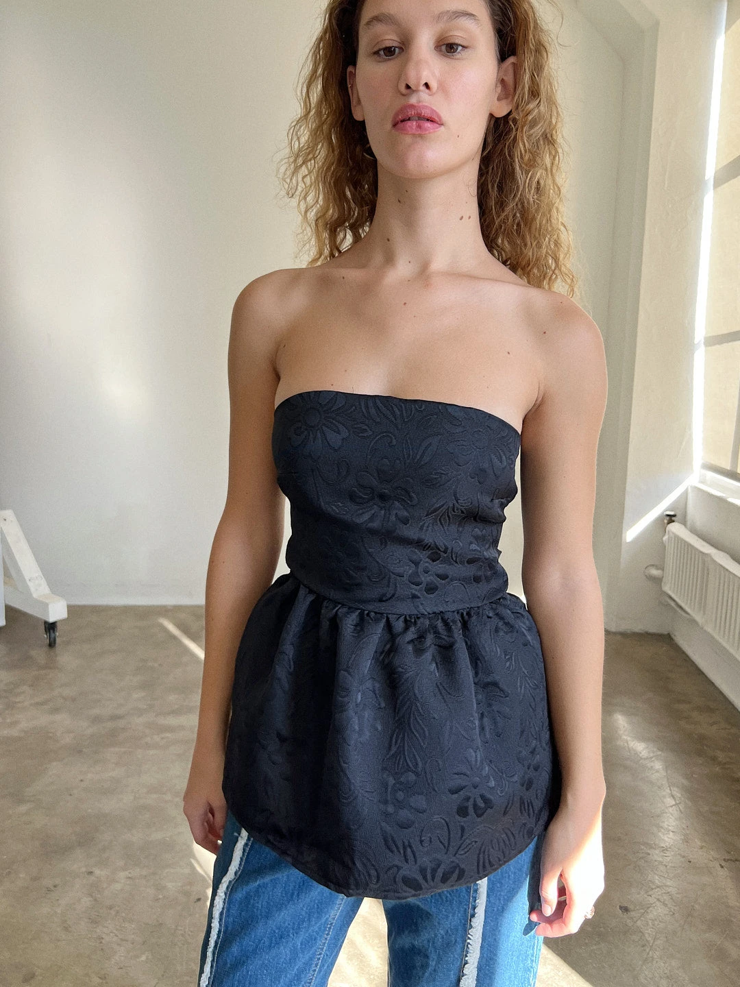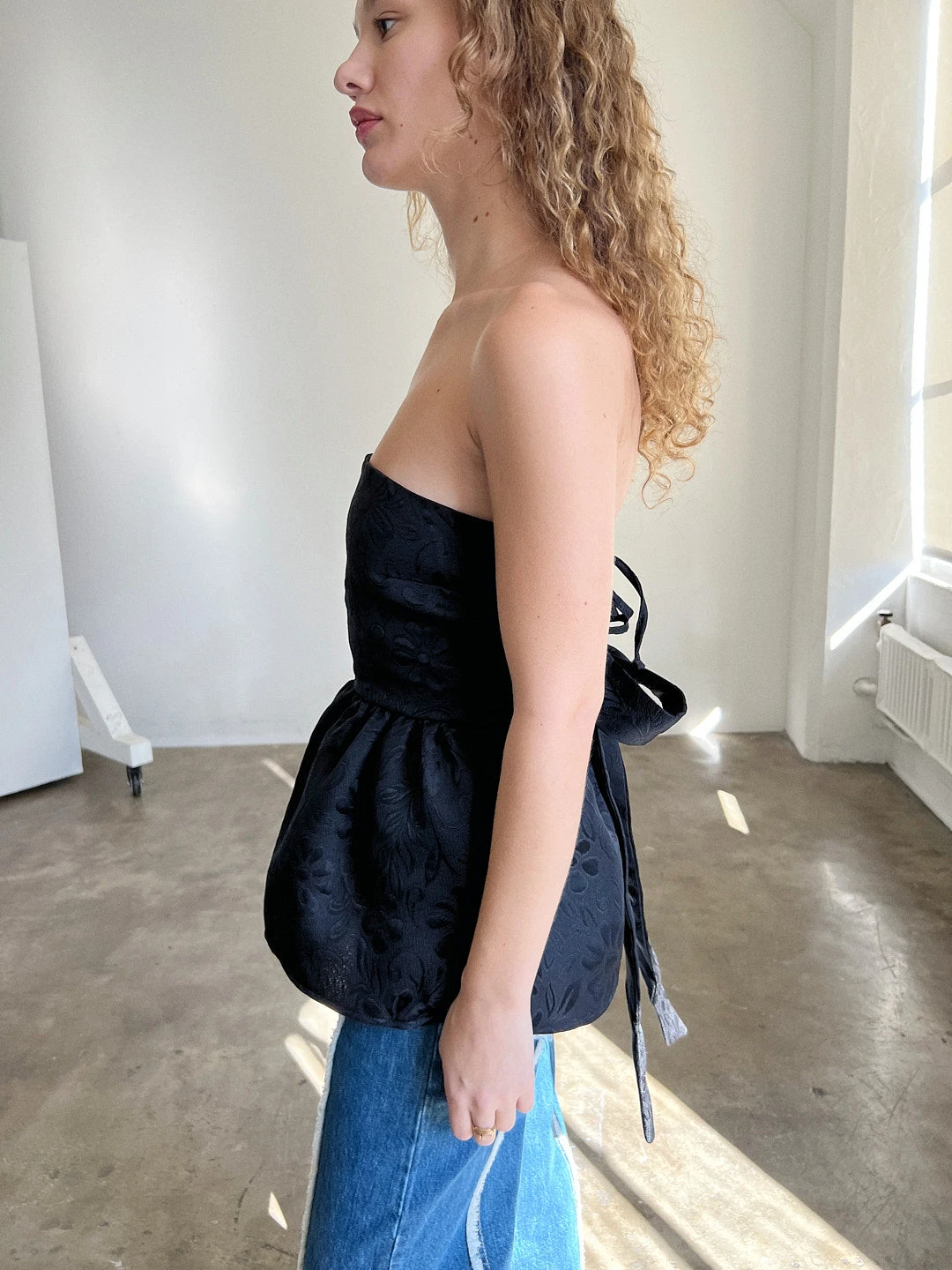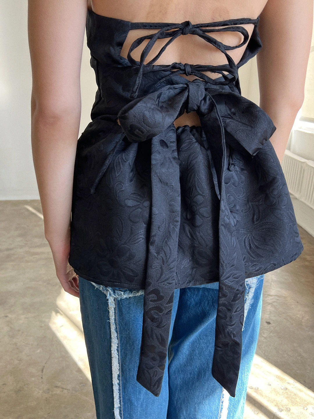 Strapless black top with jacquard texture. Pleated detail on the waist, adjustable back straps and front or back bow.