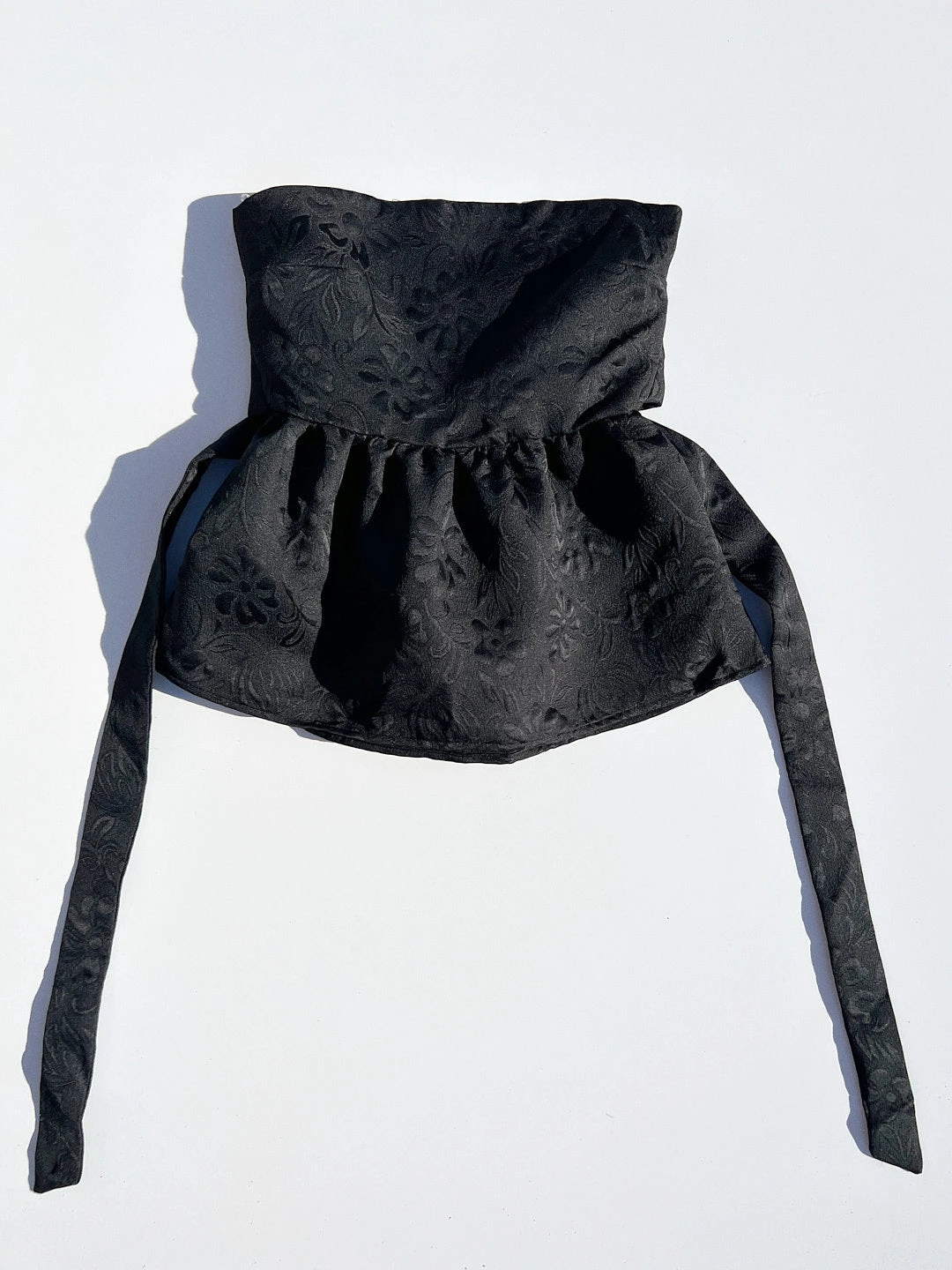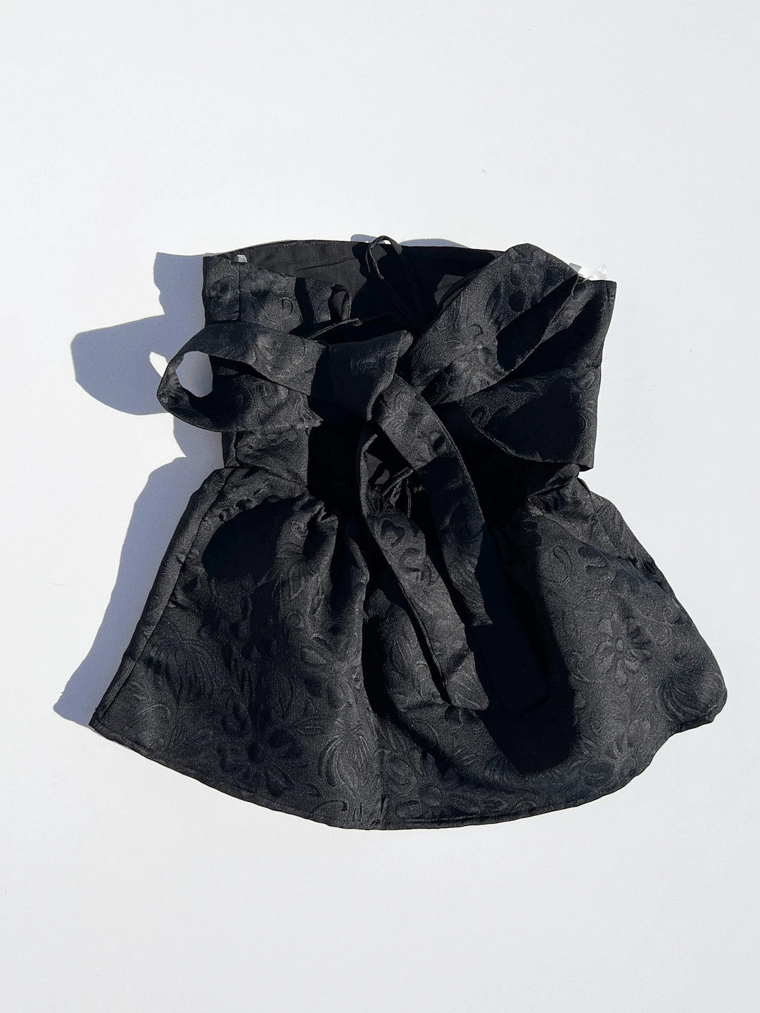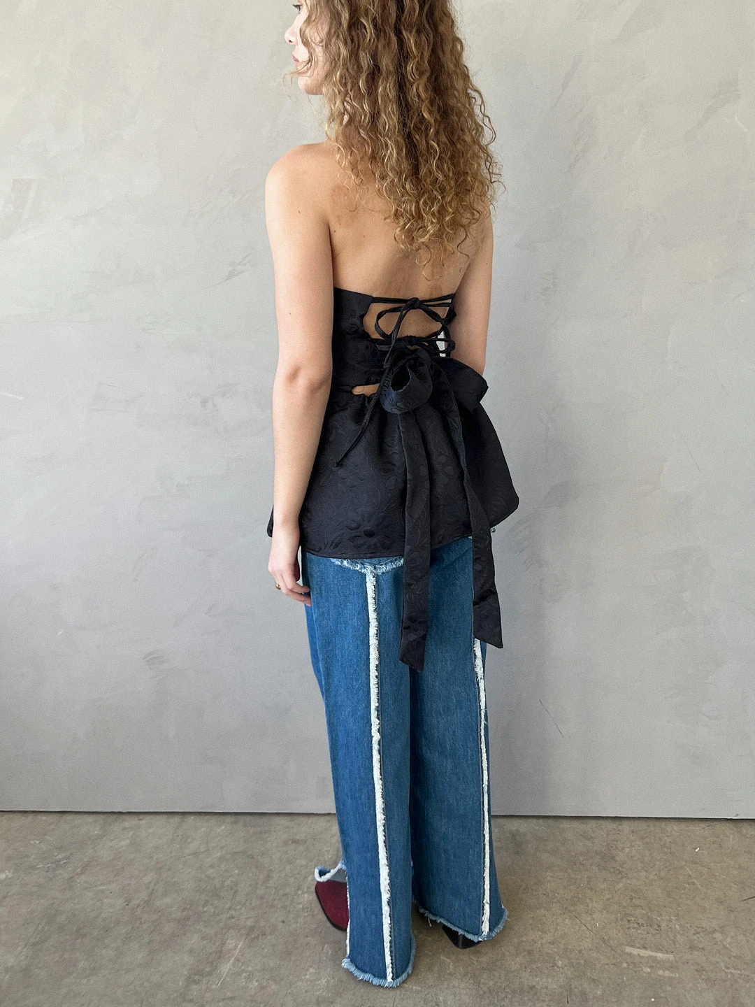 Strapless black top with jacquard texture. Pleated detail on the waist, adjustable back straps and front or back bow.