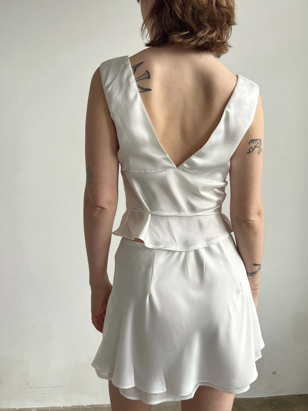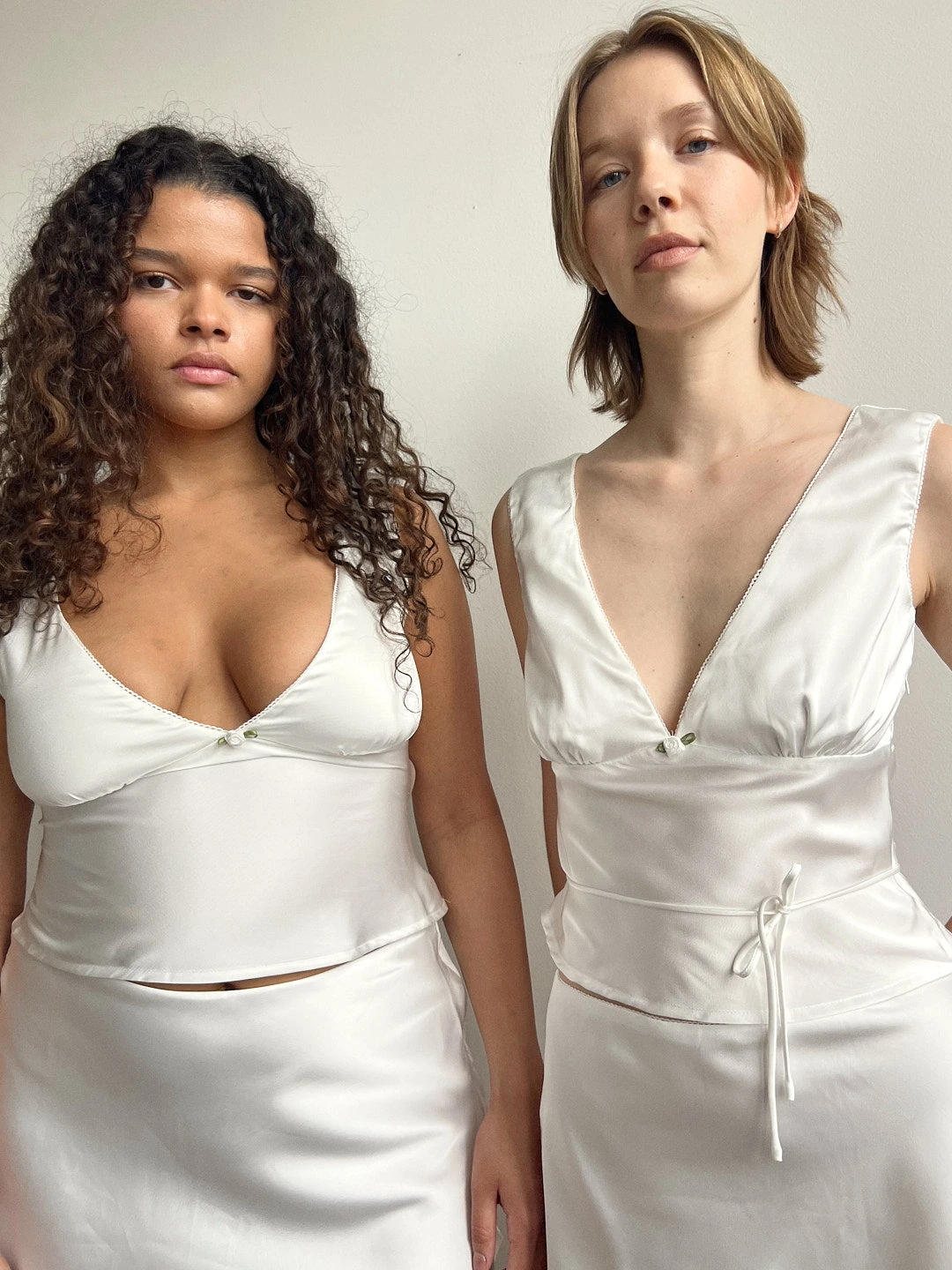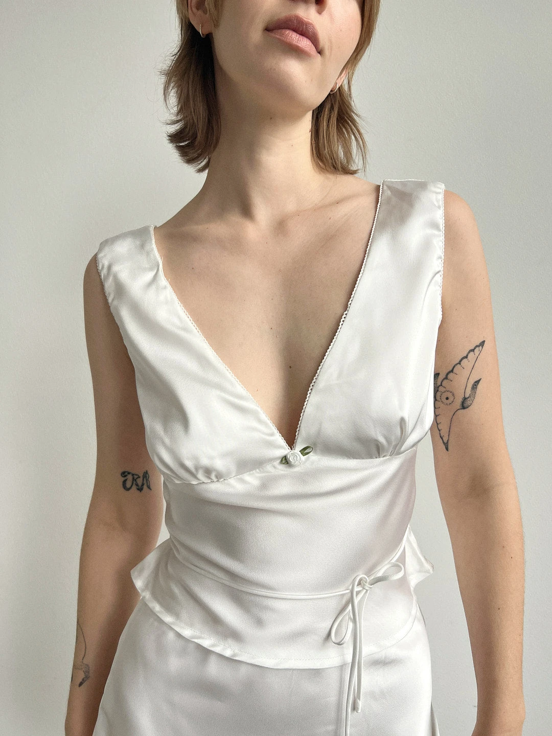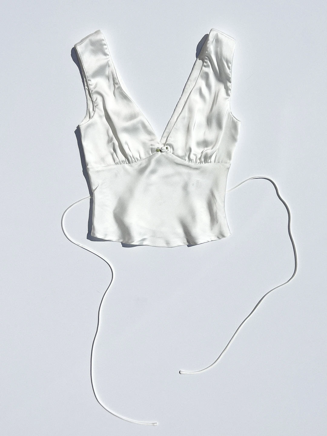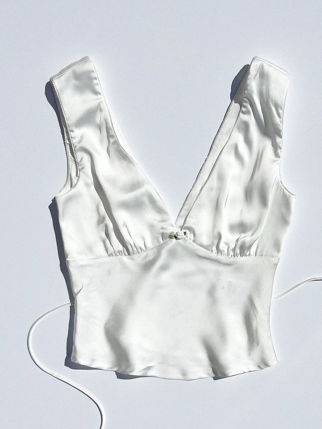 White sleeveless satin bias top with a side sip enclosure, rosette detail and ties along the waist.