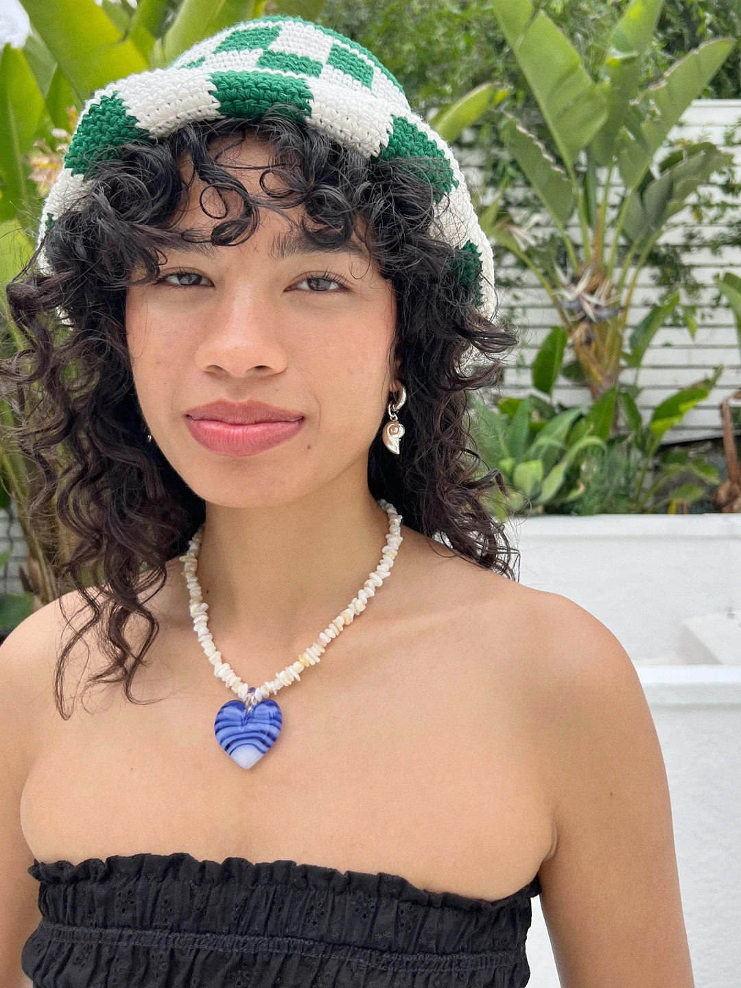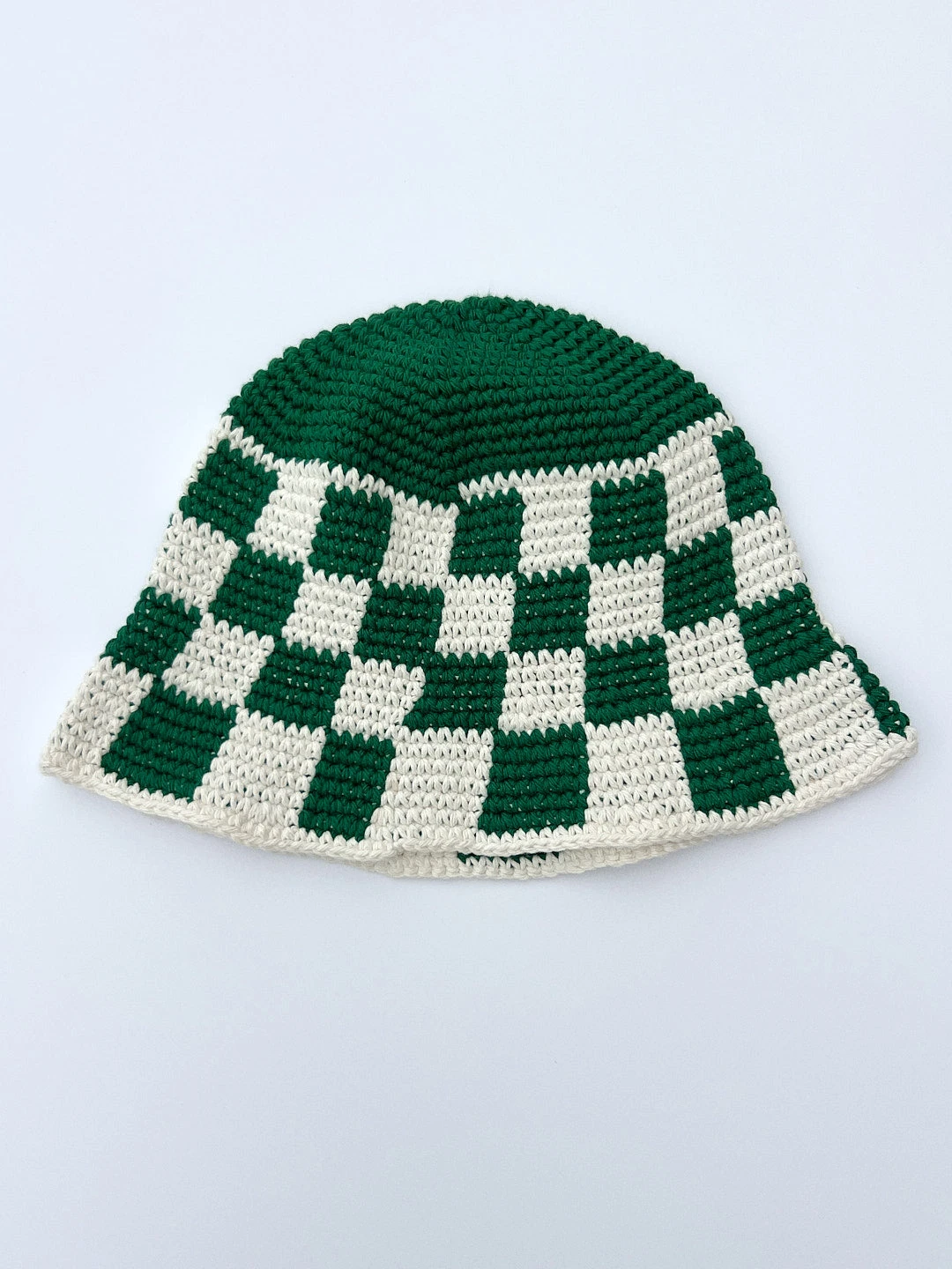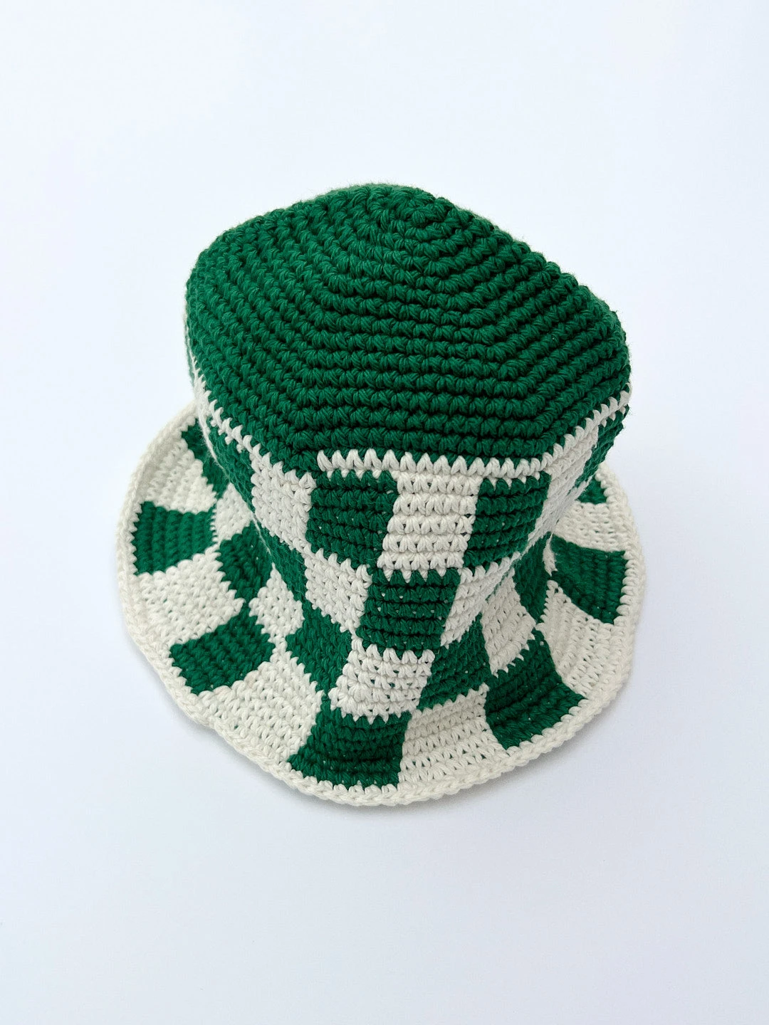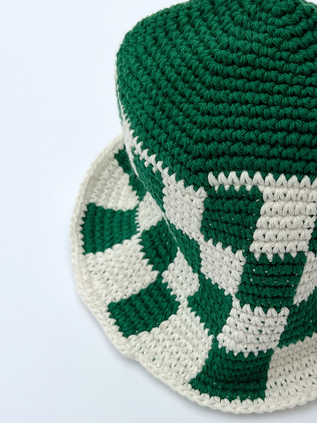 👒 Make a statement in this bold checkered bucket hat! Its cozy ponderosa green & white yarn gives it a relaxed look, while the optional fold-up brim adds extra style!🌲