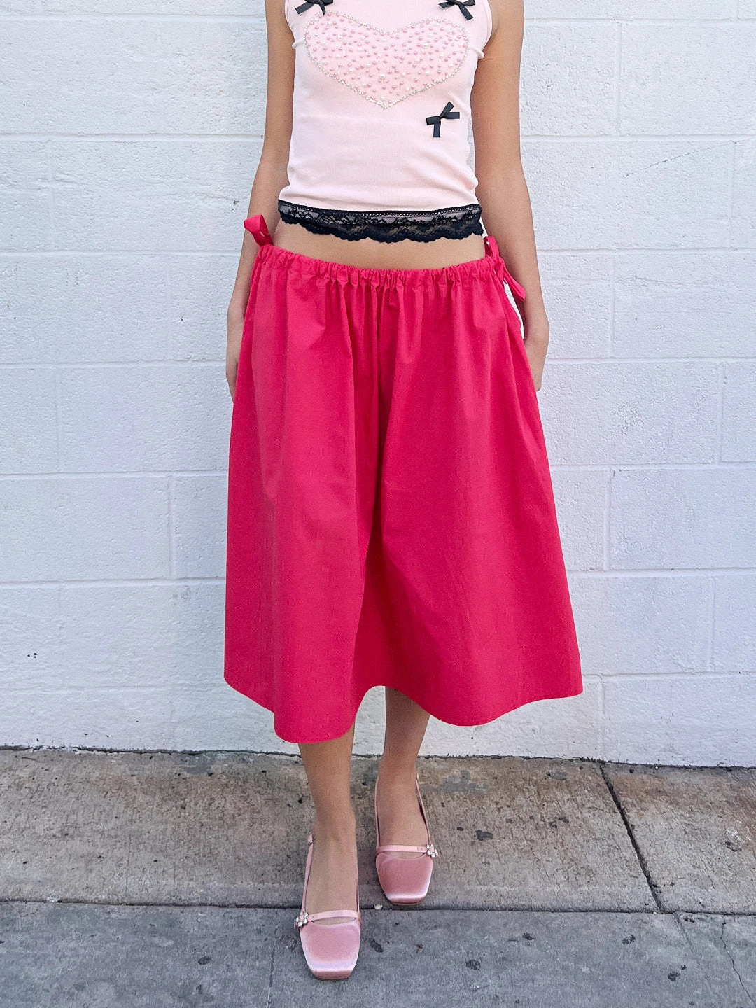 A ballet inspired skirt made in the softest lightweight cotton. Features adjustable side straps to be worn low at the waist with pockets. Lined. Missing your size? We recommend sizing down (or up!). The design of the skirt allows for flexible wearing!