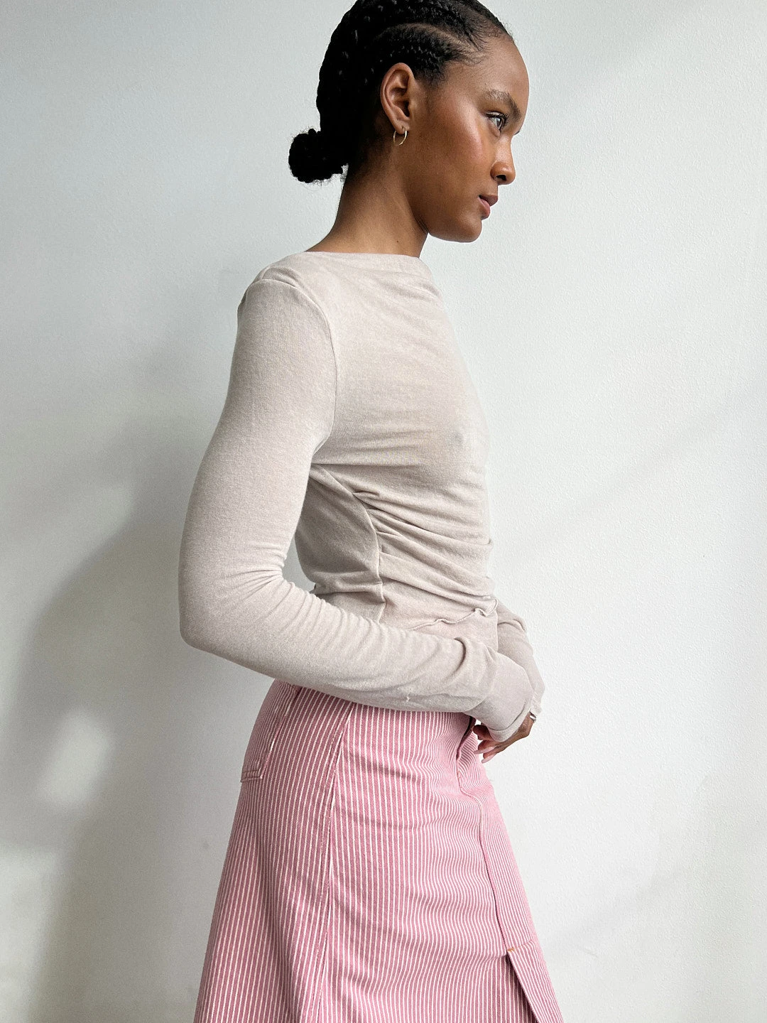 The Drew Top is a light neutral beige draped neck long sleeve top in a super stretchy and semi sheer fabric, featuring an asymmetric hem.