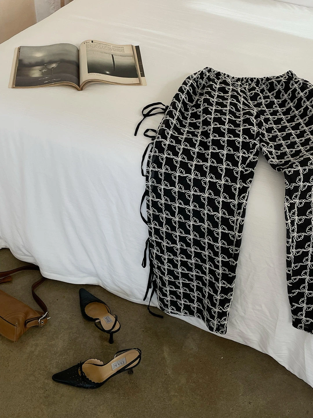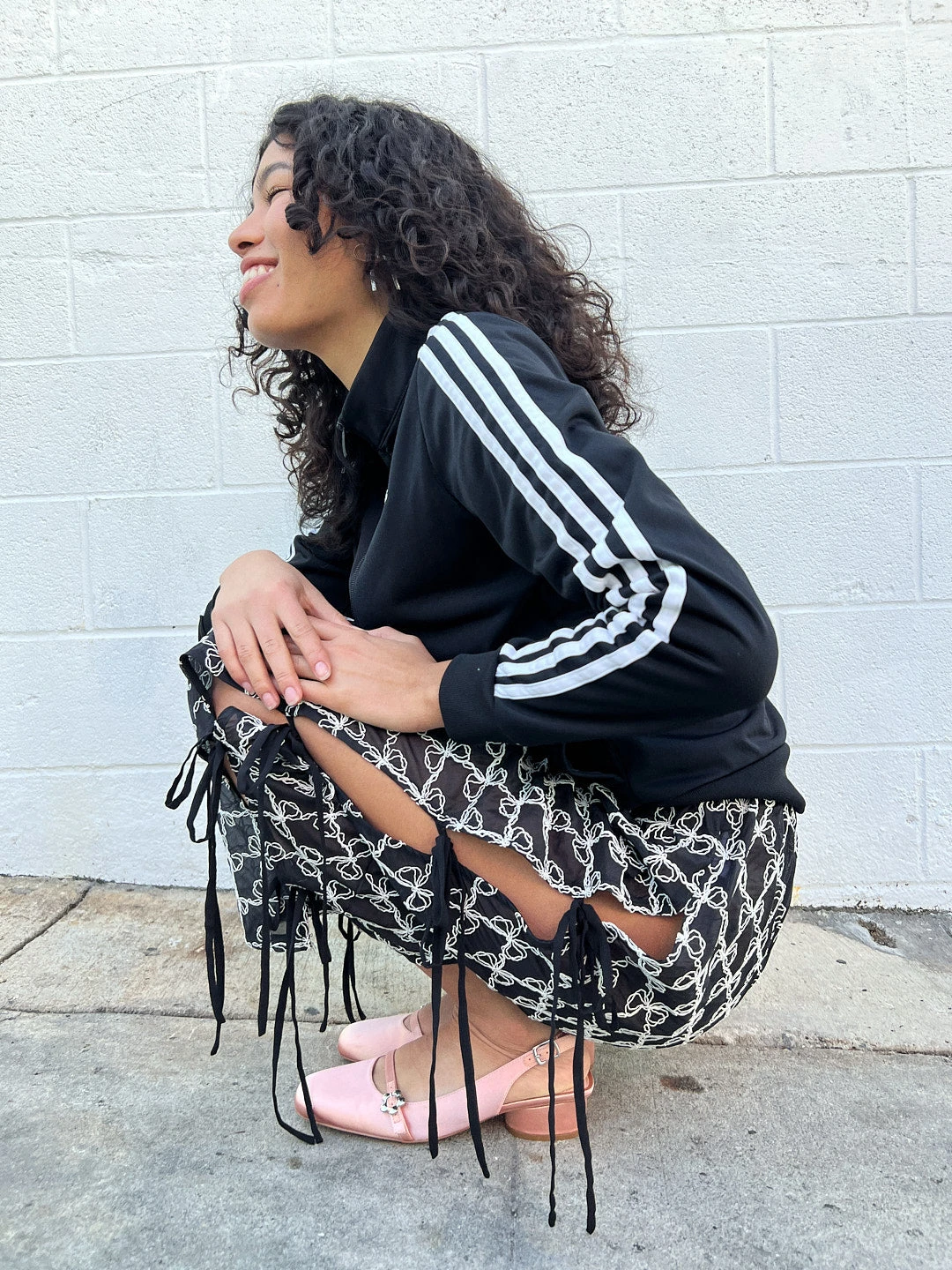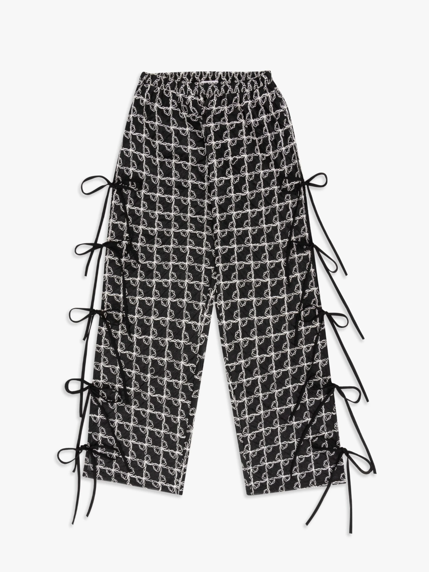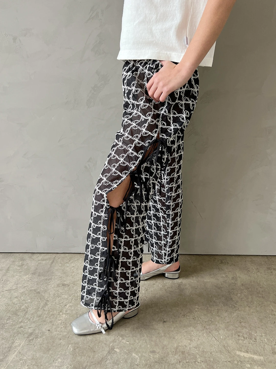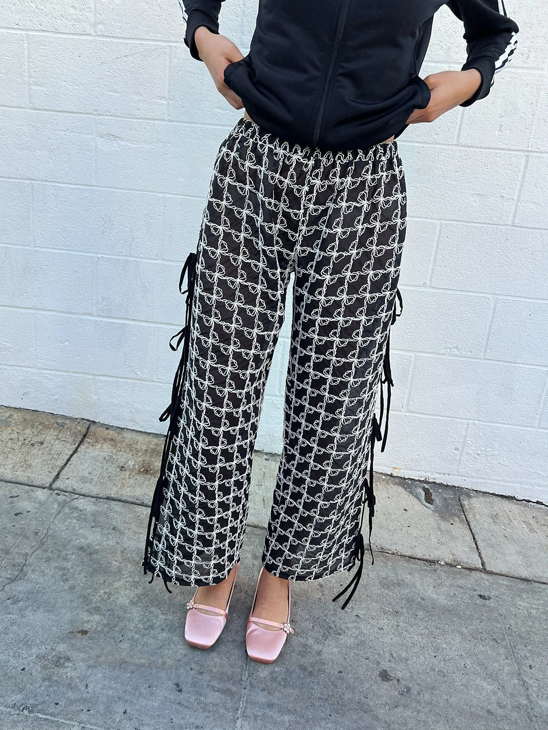 Black high-waisted, sheer silhouette pants embellished with adjustable bows and an elastic waistband. Made with a custom bow embroidered organza designed by LSG.