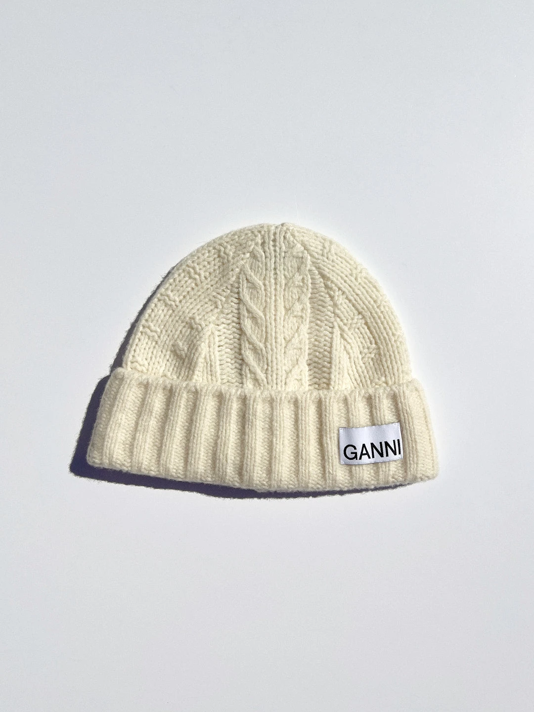 A lightweight recycled wool beanie. Stitched Ganni logo patch at the front.
