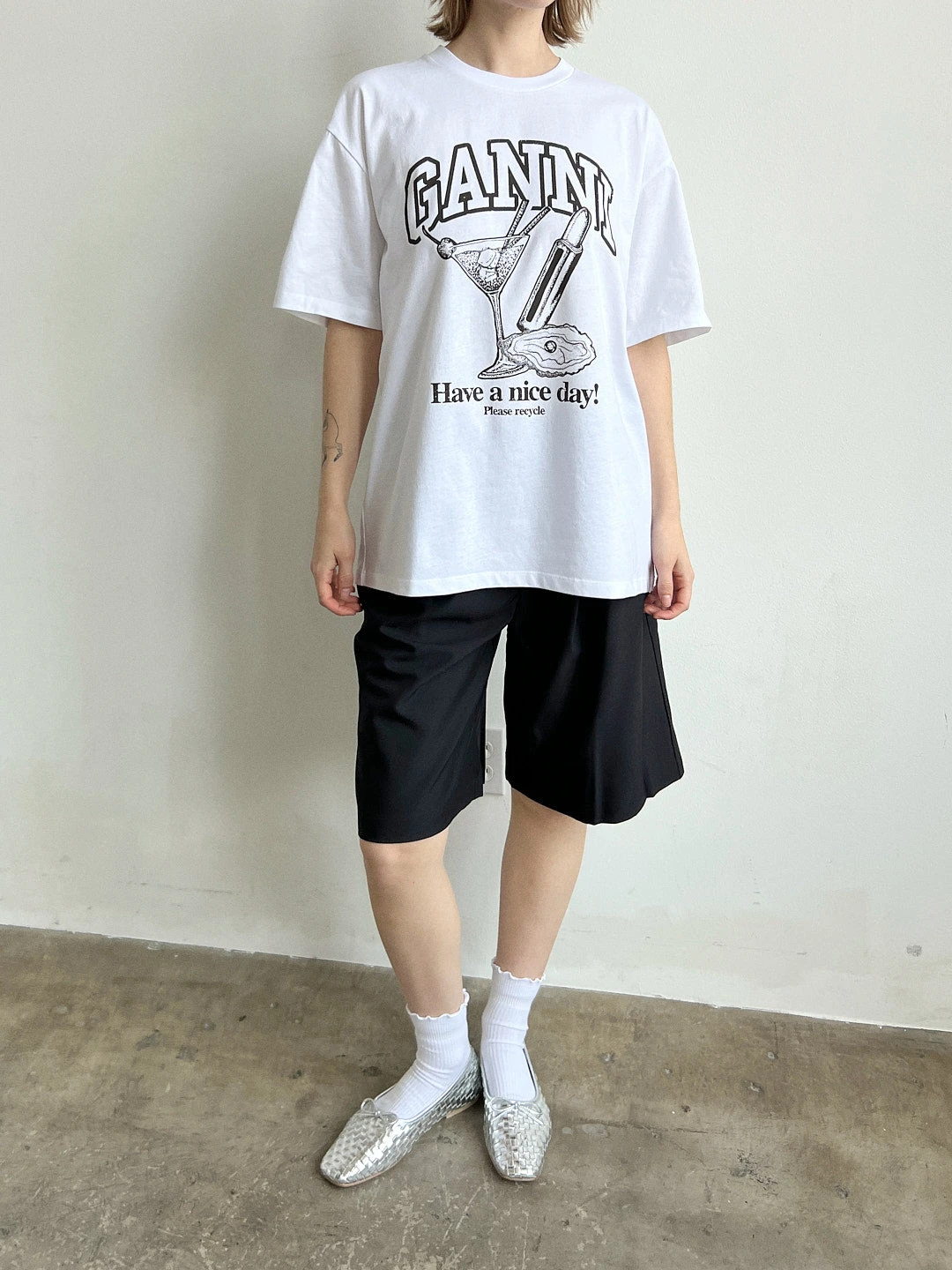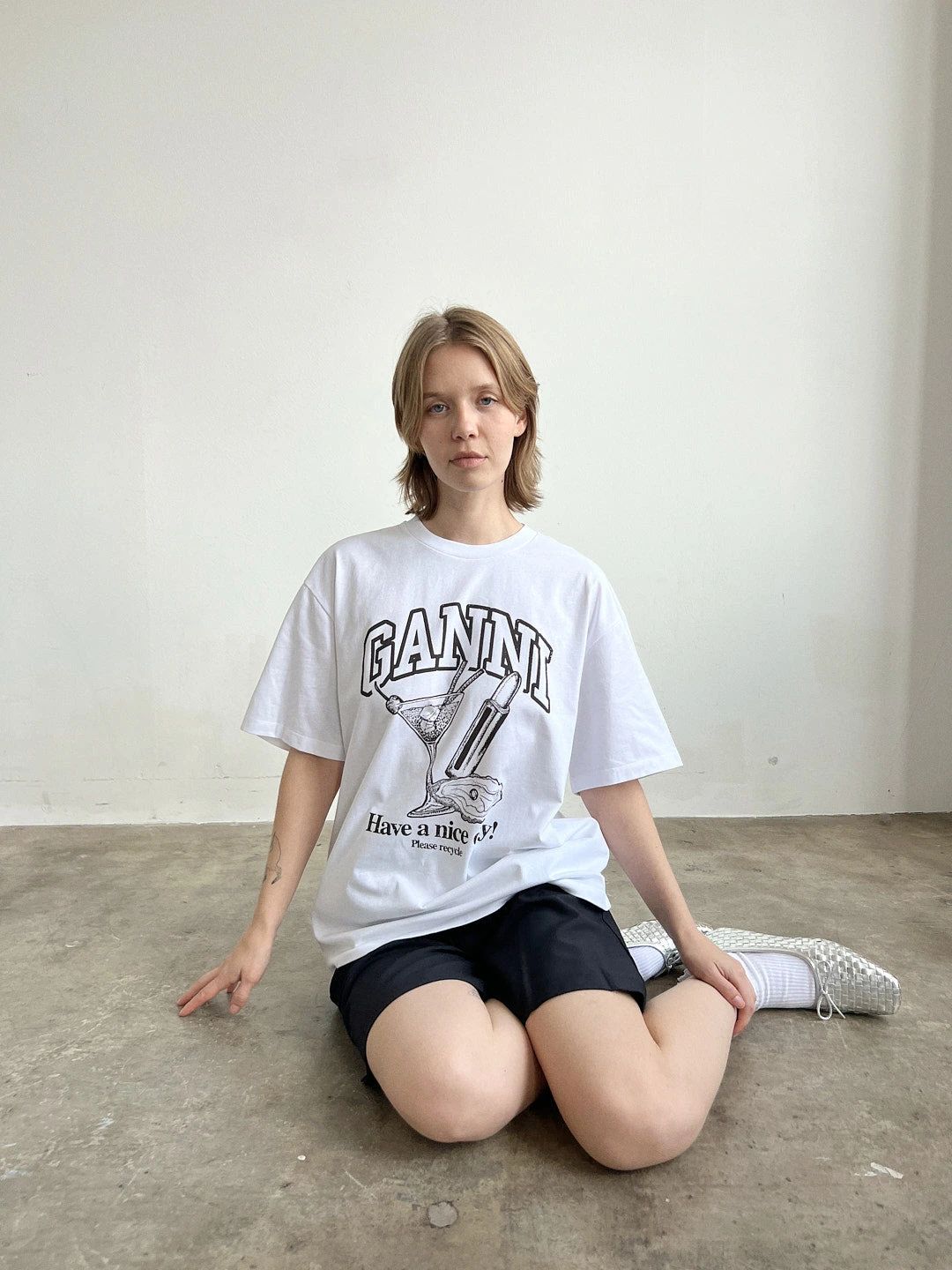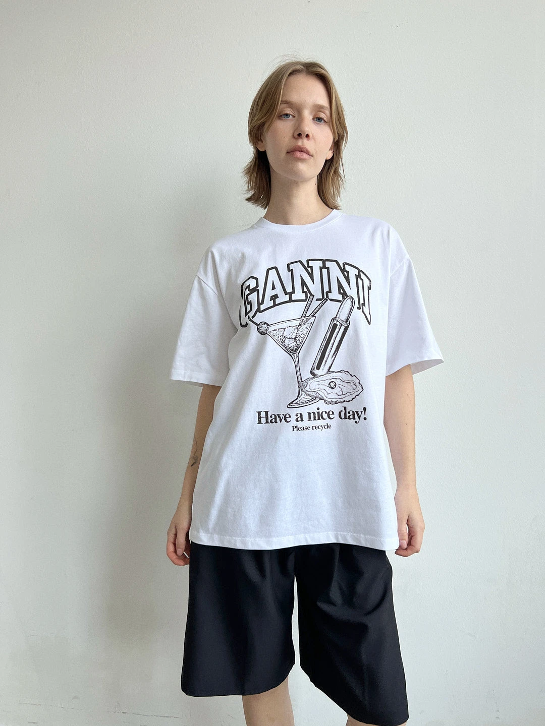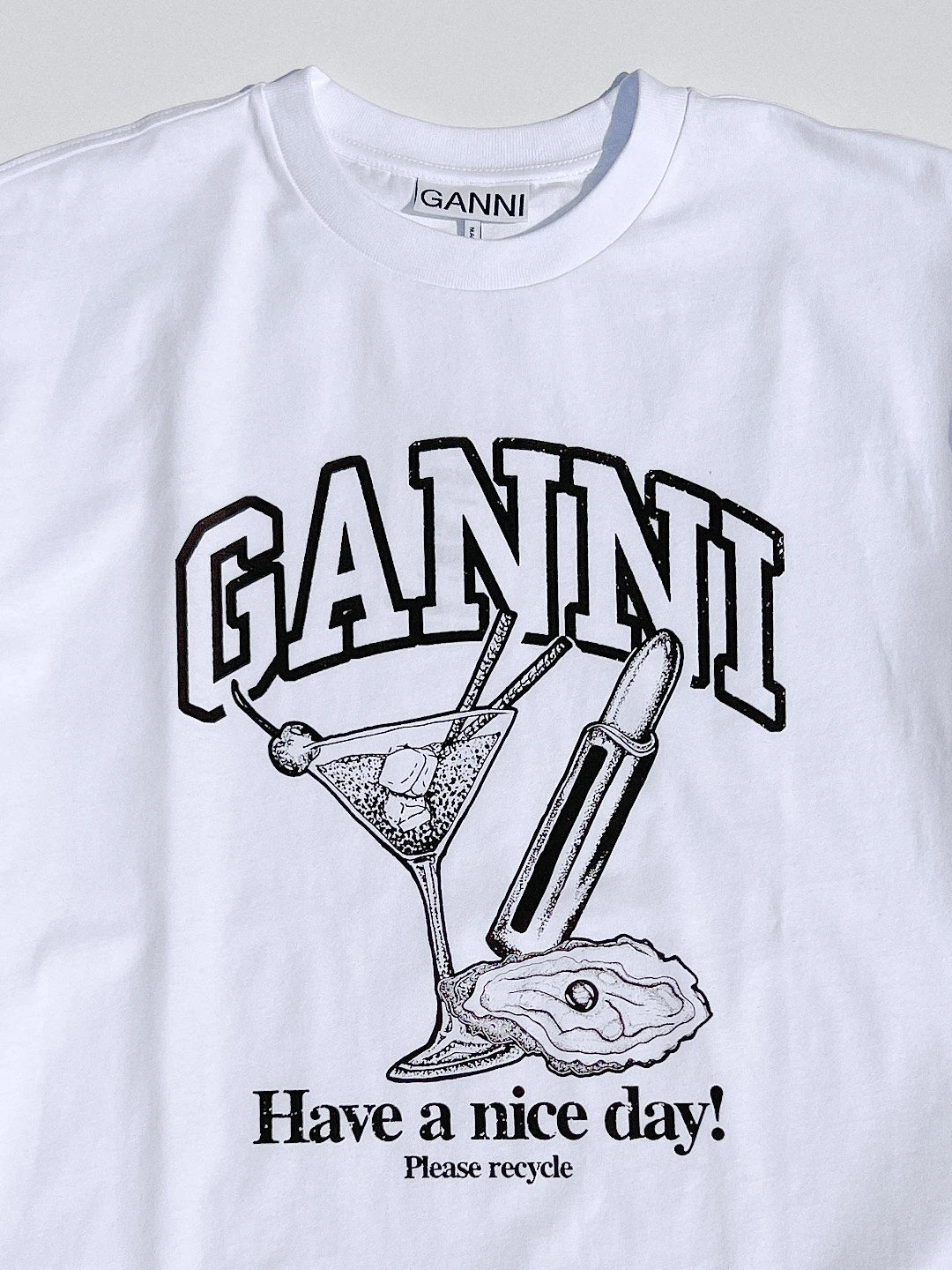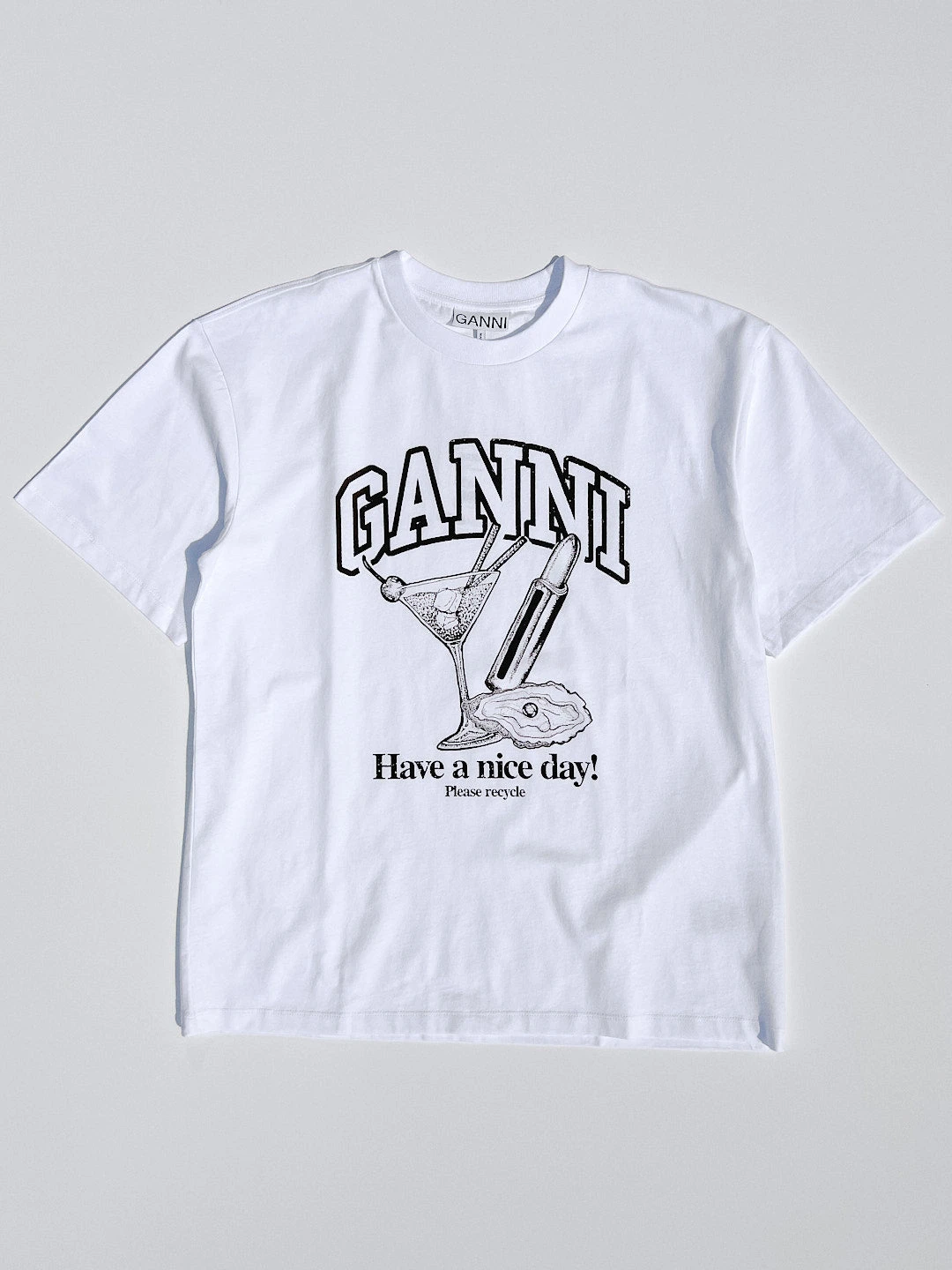A white graphic tee with Ganni’s signature logo and a graphic of lipstick, an oyster, and a martini.