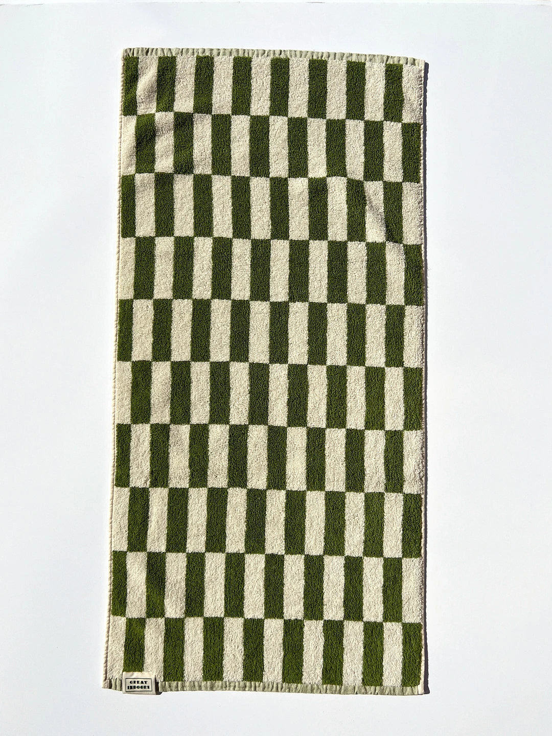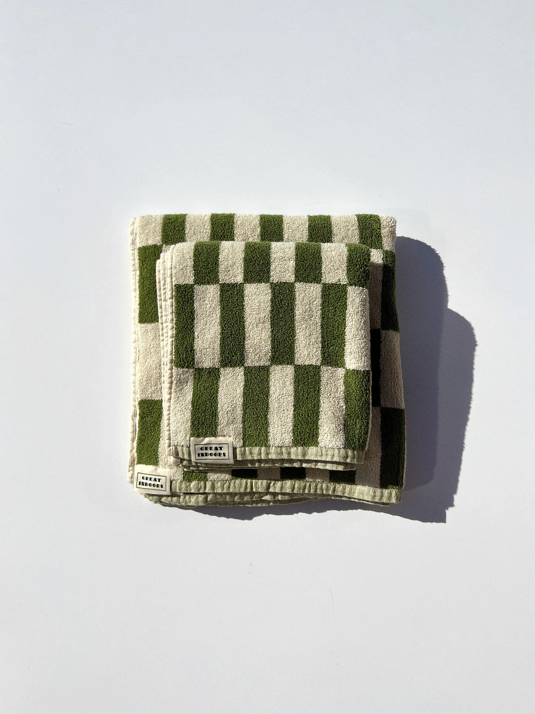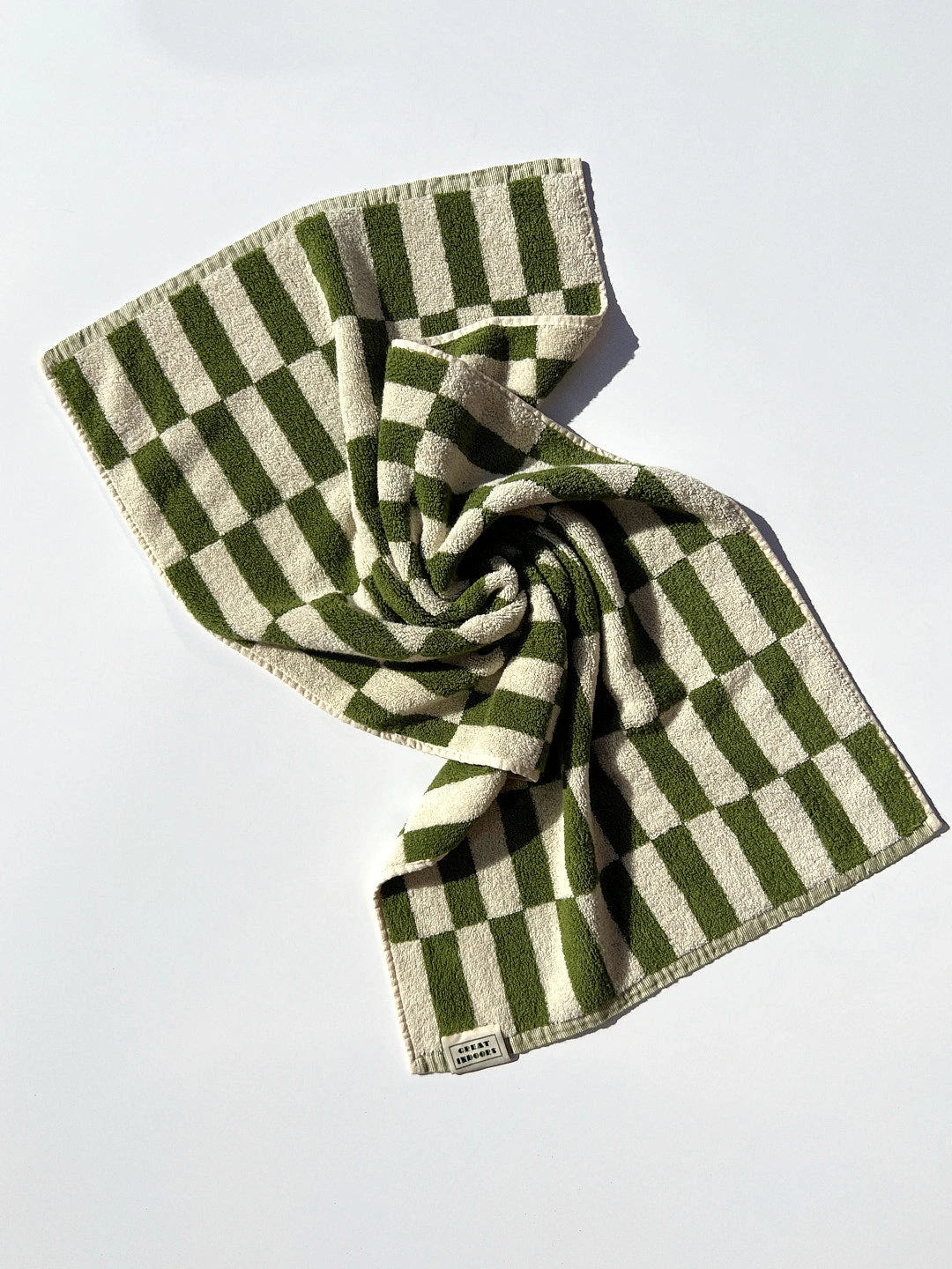 From independent label Great Indoors, a small organic cotton hand towel in an olive green and ivory check design.