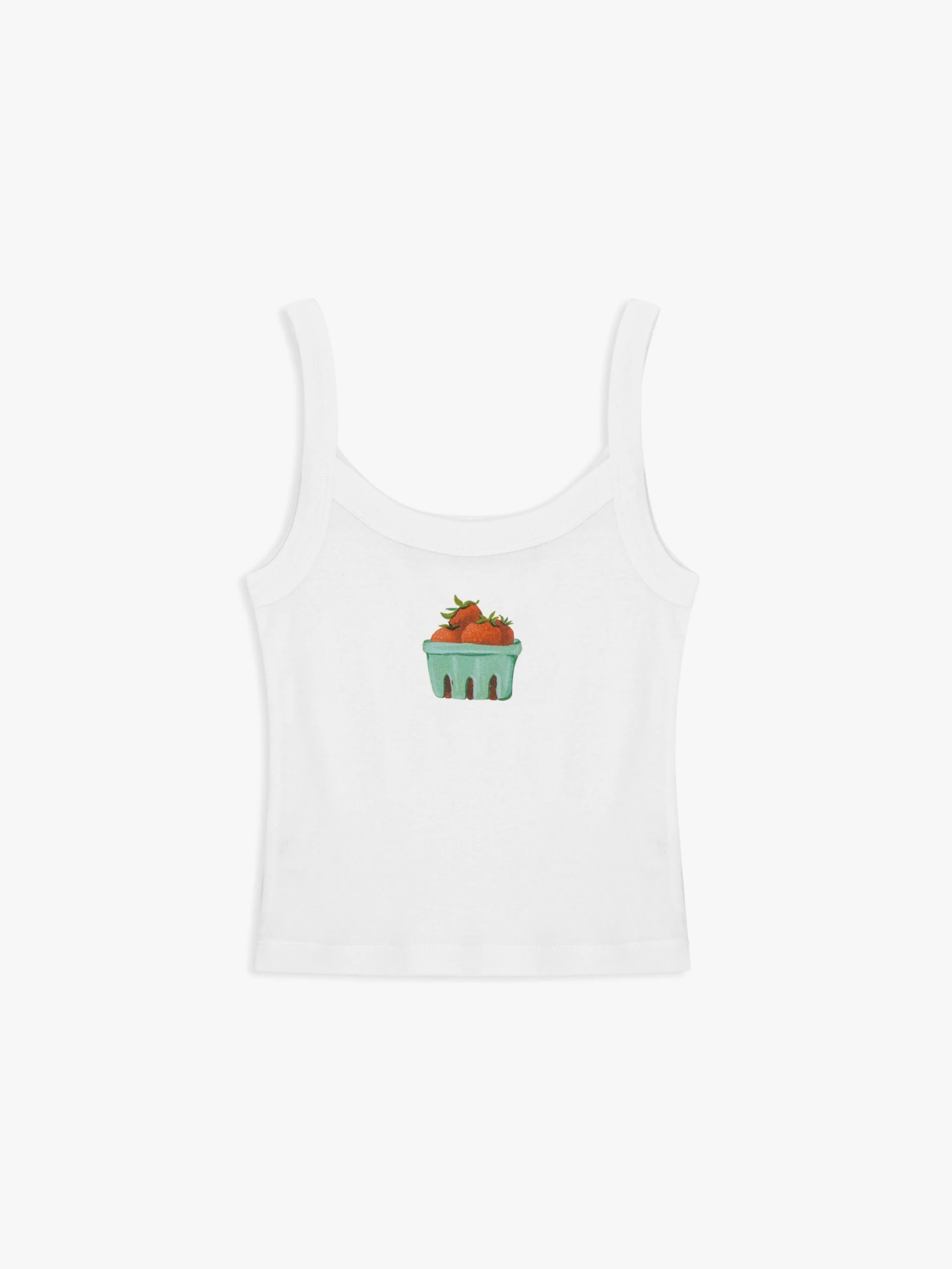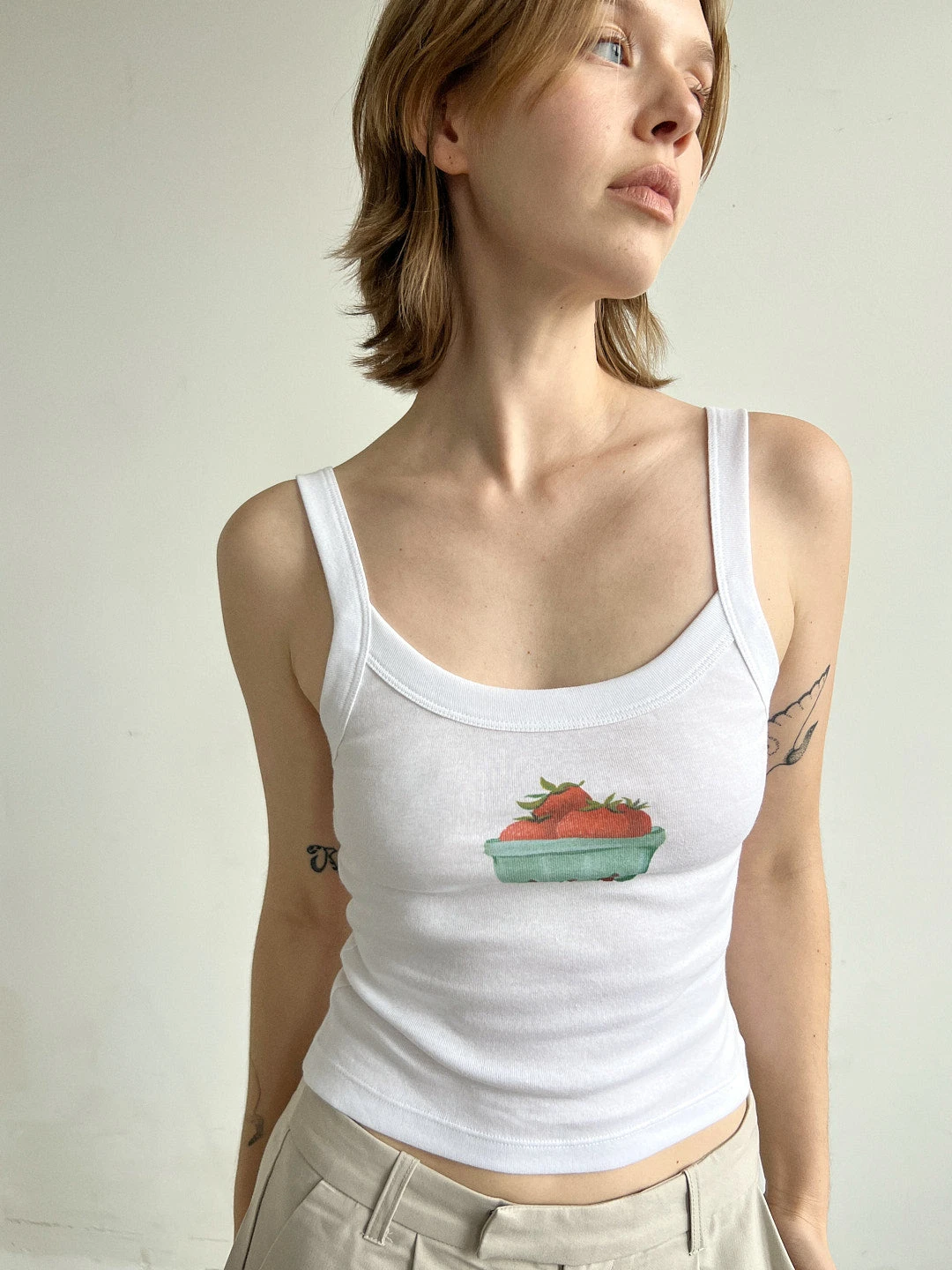 Spaghetti strap tank top in soft, cotton t-shirt fabric featuring strawberries on the front.