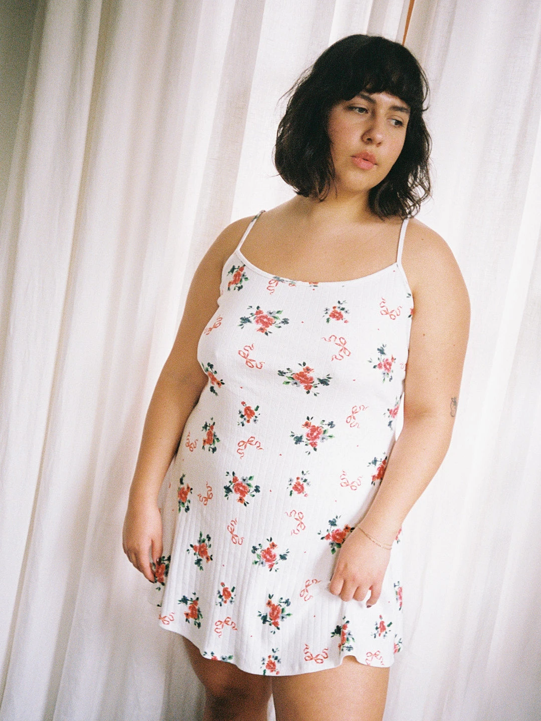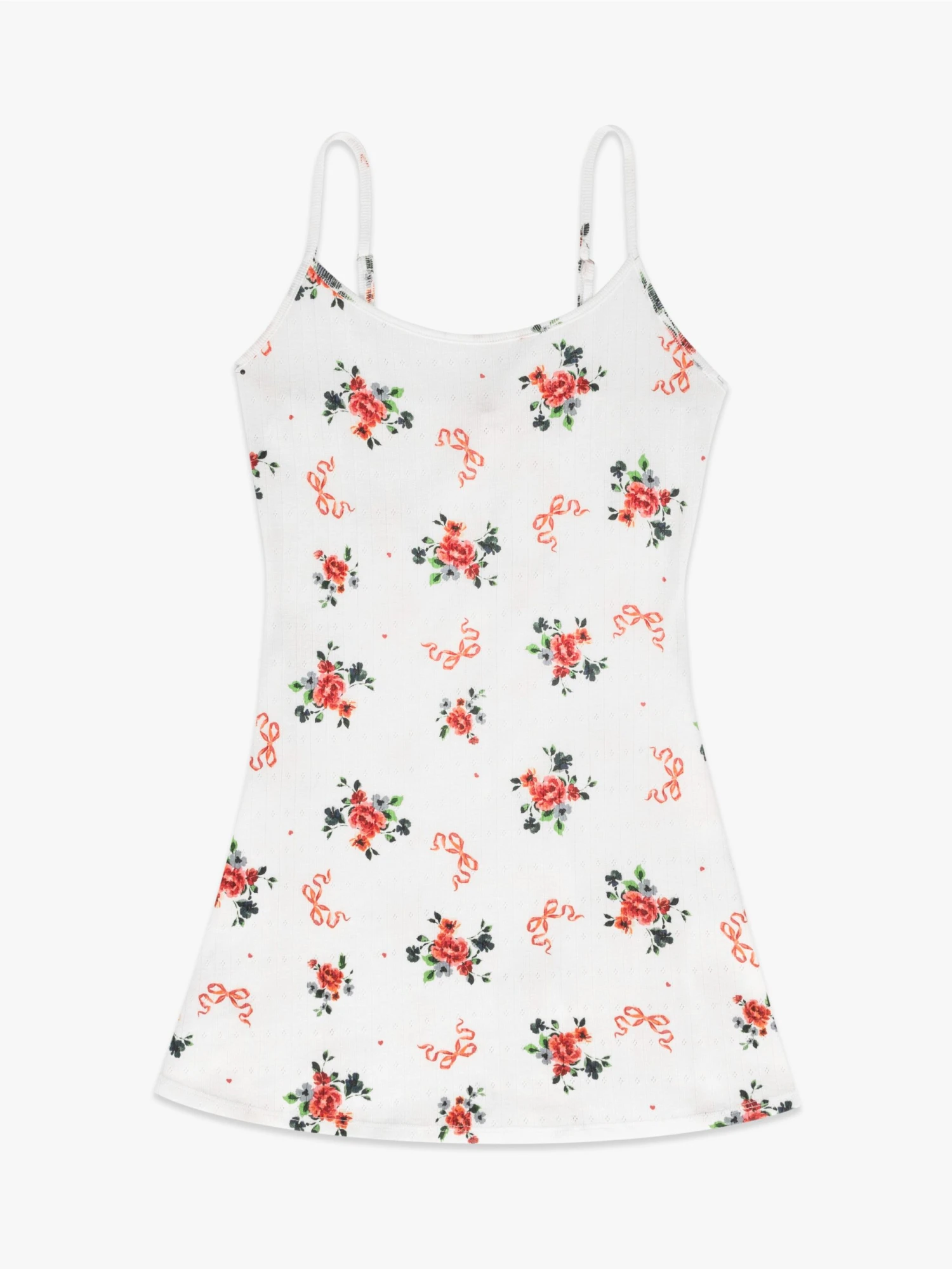 Pointelle mini dress with a bouquet and ribbon print. The Hazel features adjustable spaghetti straps and a slightly flared skirt.