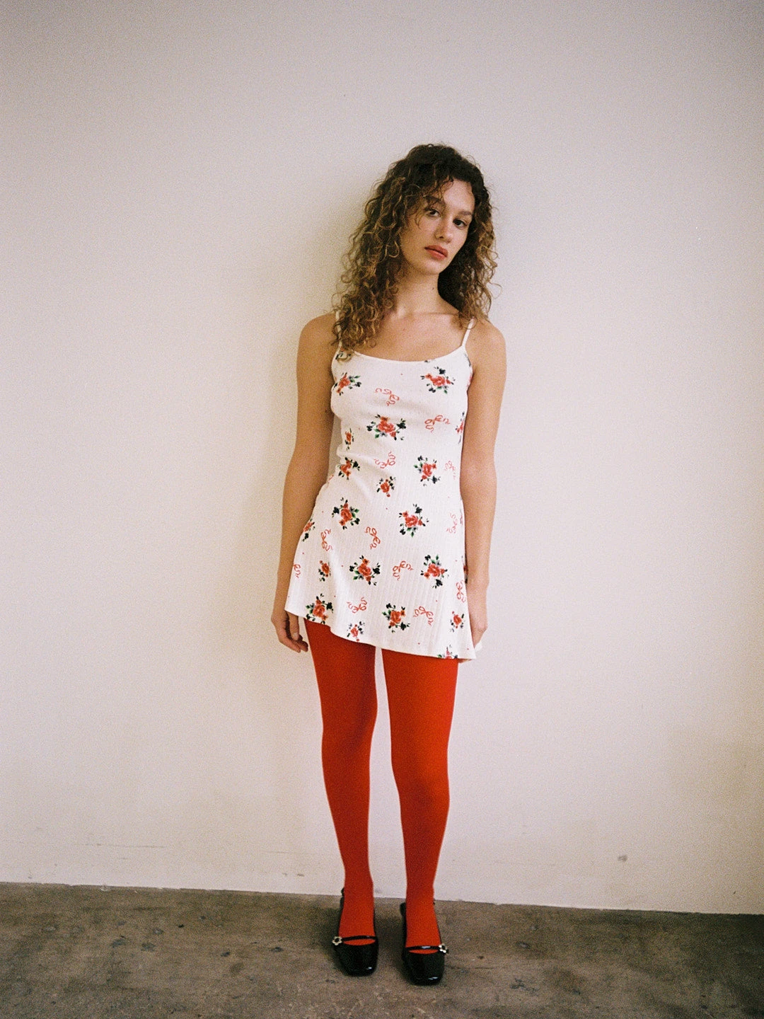 The Hazel Mini Dress boasts an adorable pointelle design, complete with a charming bouquet and ribbon print. Featuring adjustable spaghetti straps and a slightly flared skirt, it’s the perfect blend of playful and stylish.