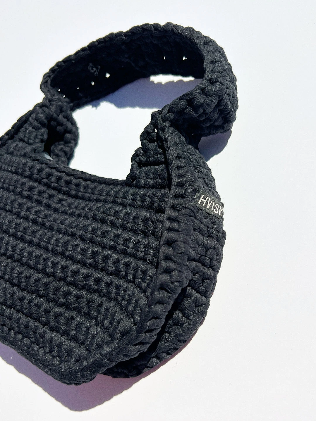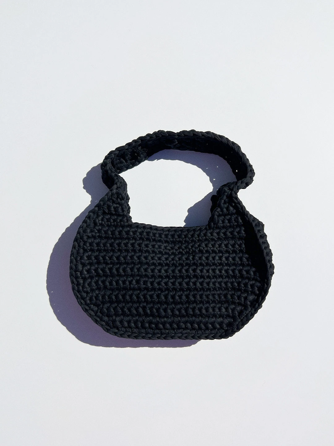 Black crochet shoulder bag containing one compartment.