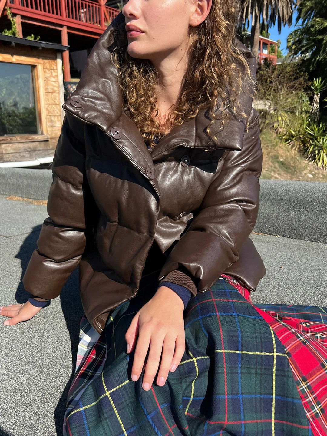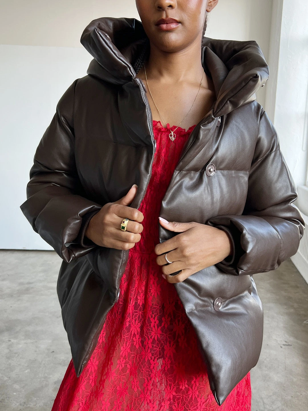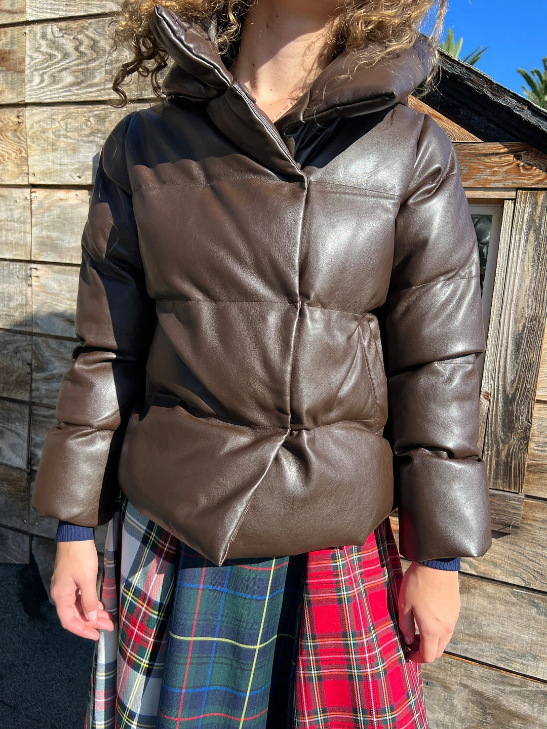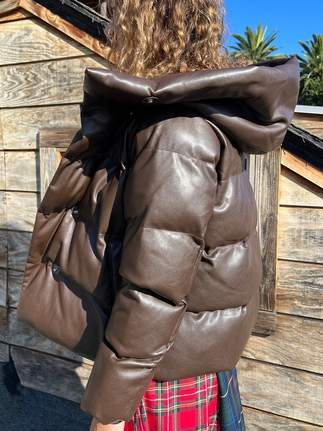 Butter soft vegan leather lightweight and super puffy Patricia Puffer in chocolate.