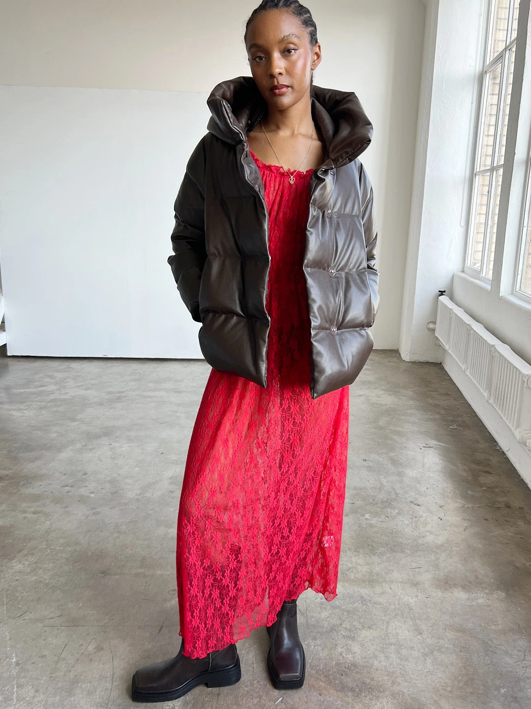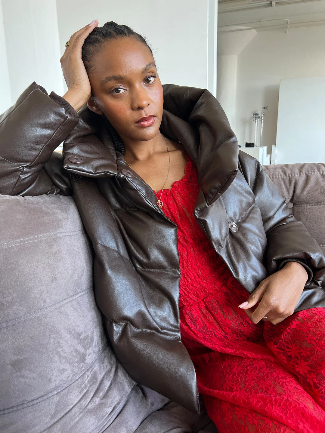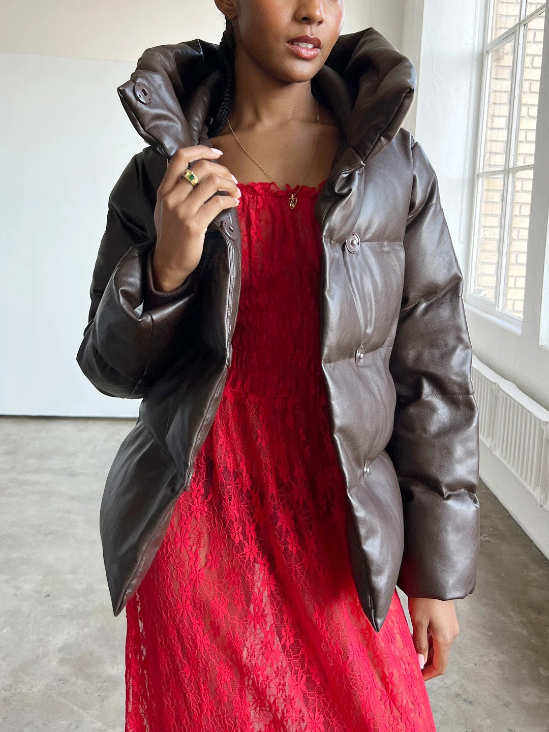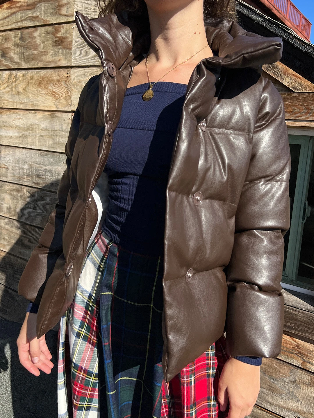Butter soft vegan leather lightweight and super puffy Patricia Puffer in chocolate.