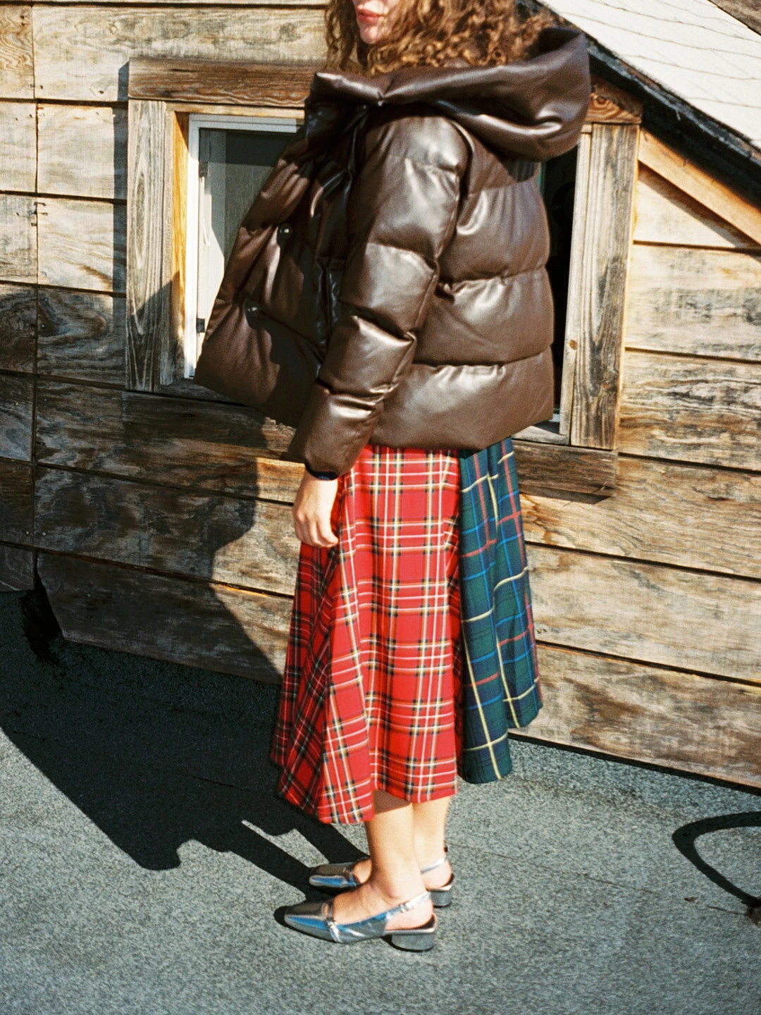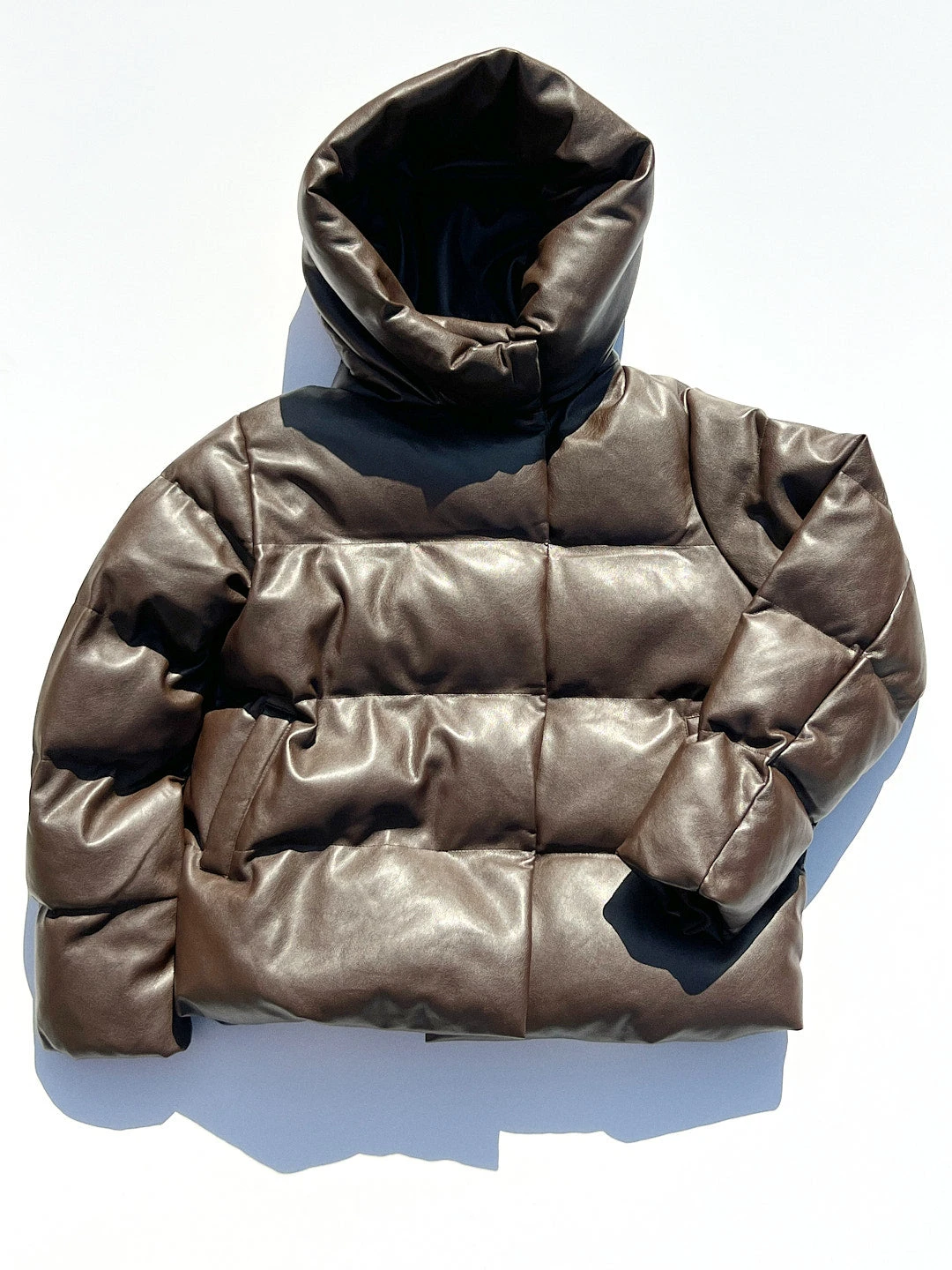 Smooth vegan leather and feather-light, super fluffy Patricia Puffer in chocolate – saving the planet one purchase at a time! (approx 30 water bottles per piece !!).
