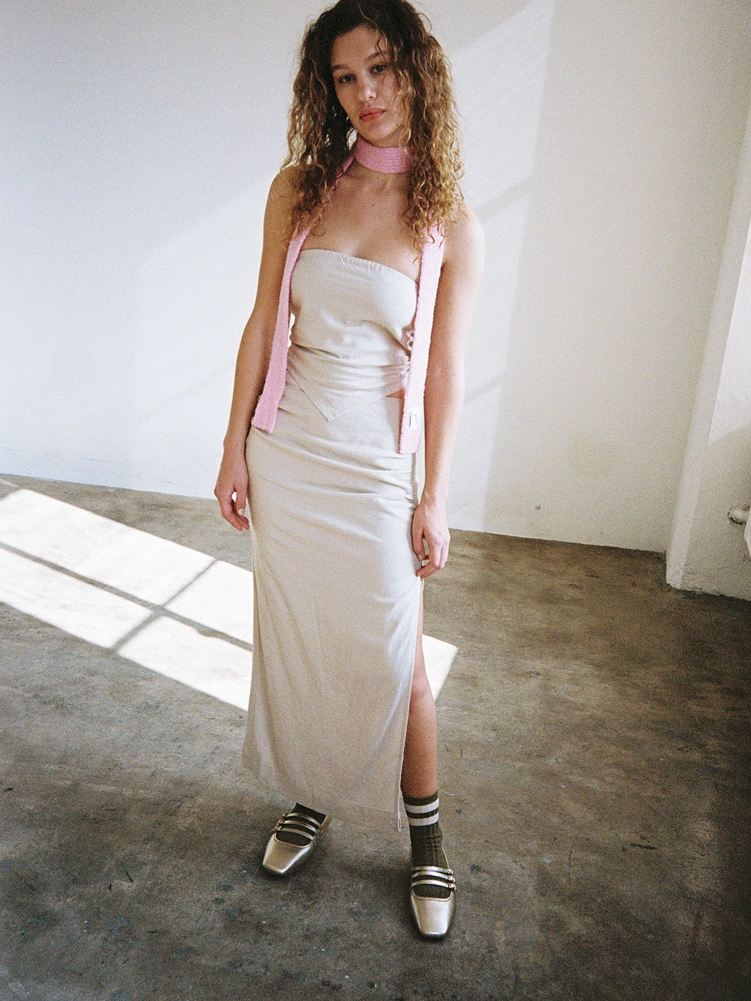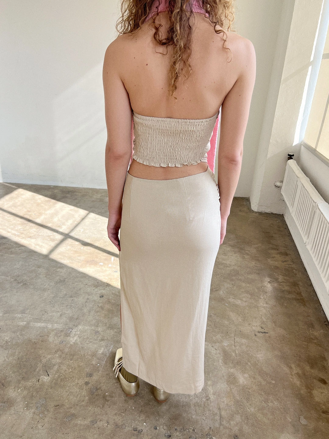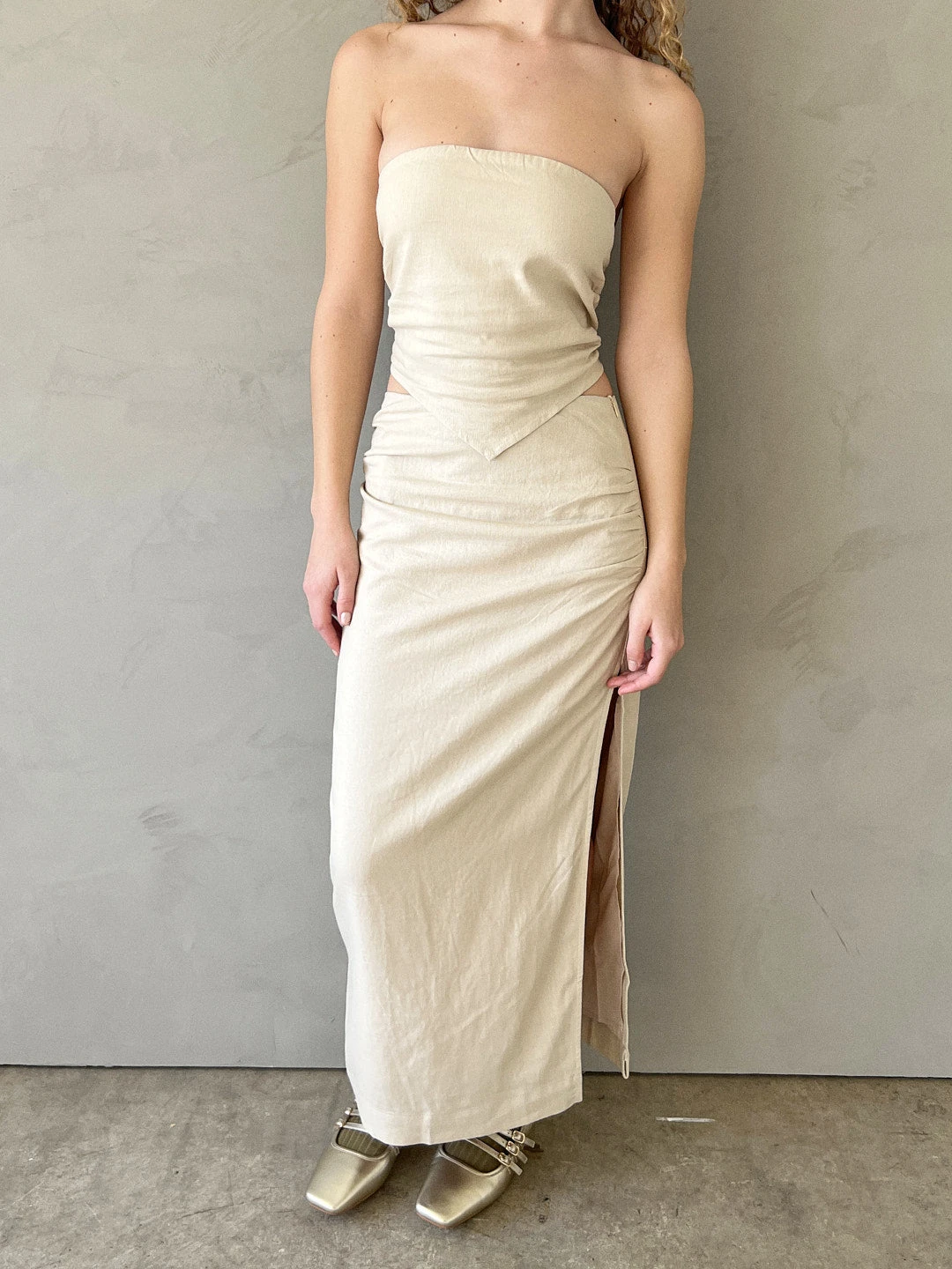 A coordinated set including a handkerchief top with a smocked back and a matching midi skirt with a dramatic side slit.