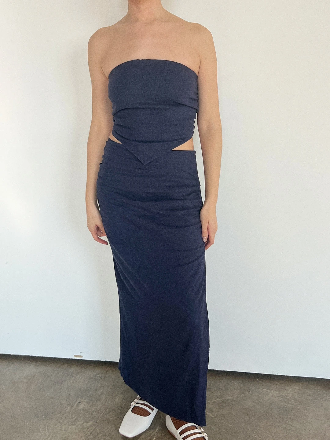 A coordinated set including a white handkerchief top with a smocked back and a matching midi skirt with a dramatic side slit.