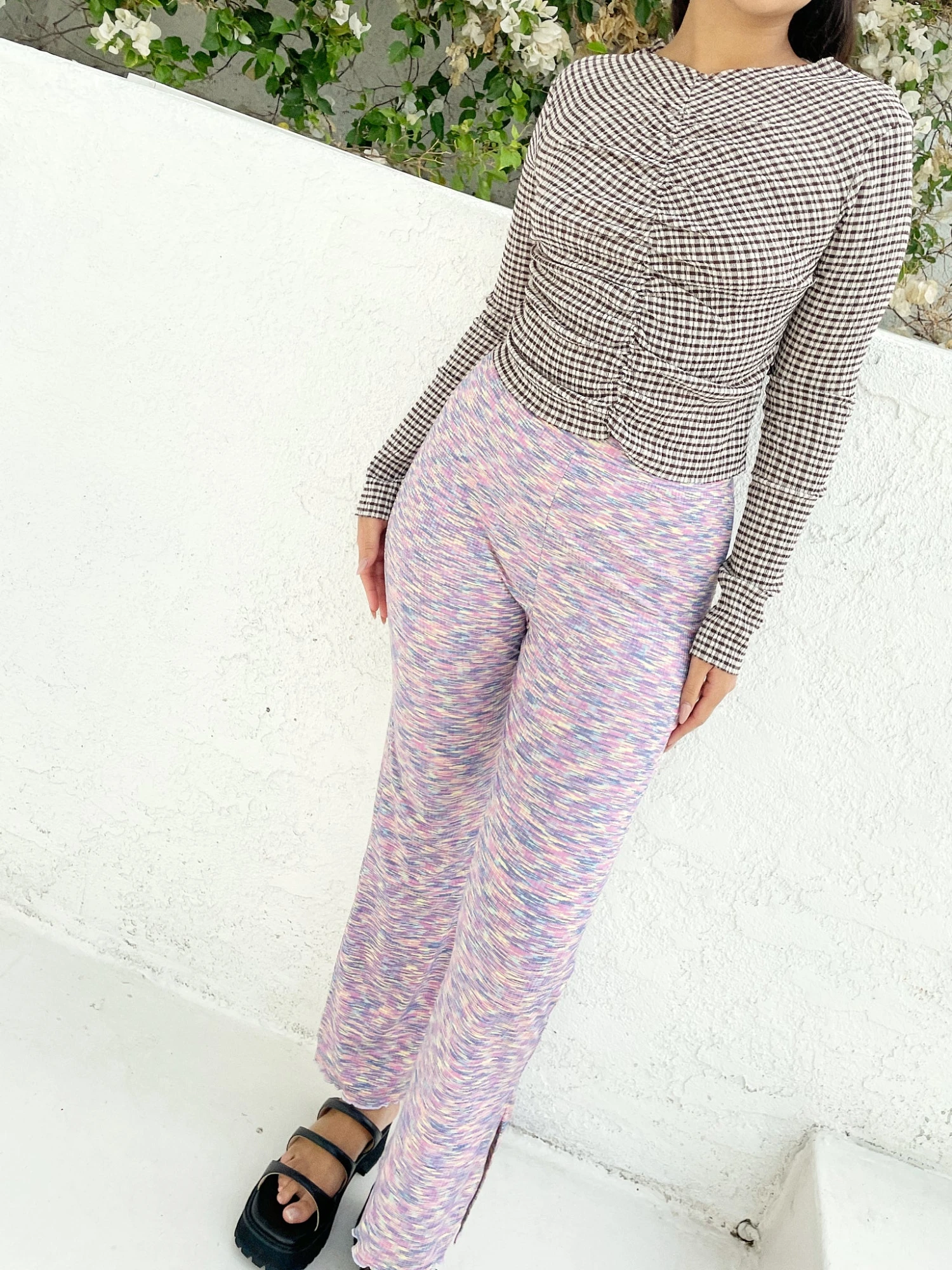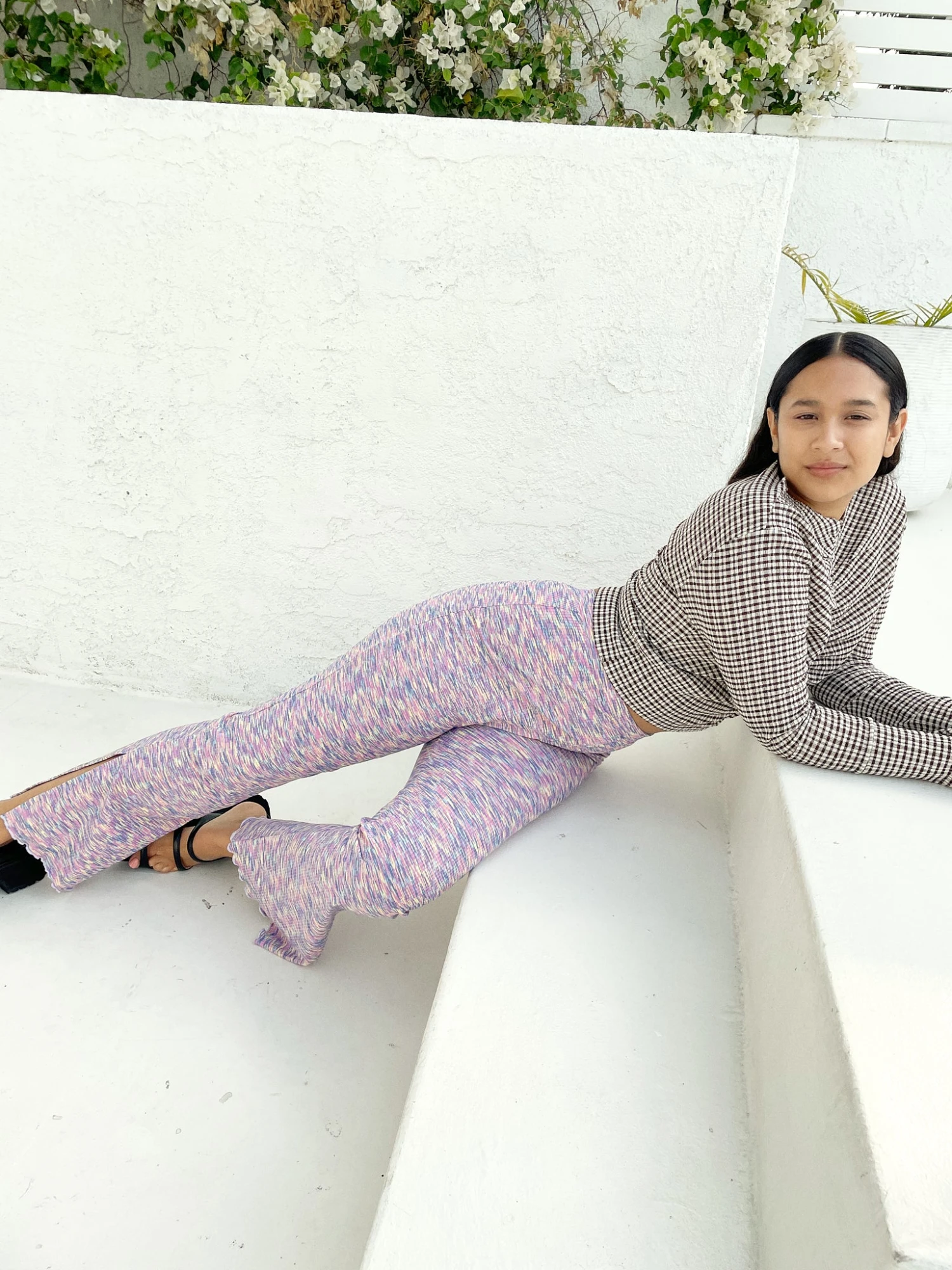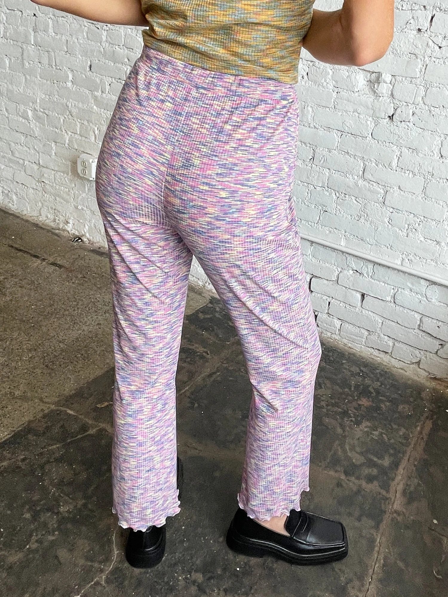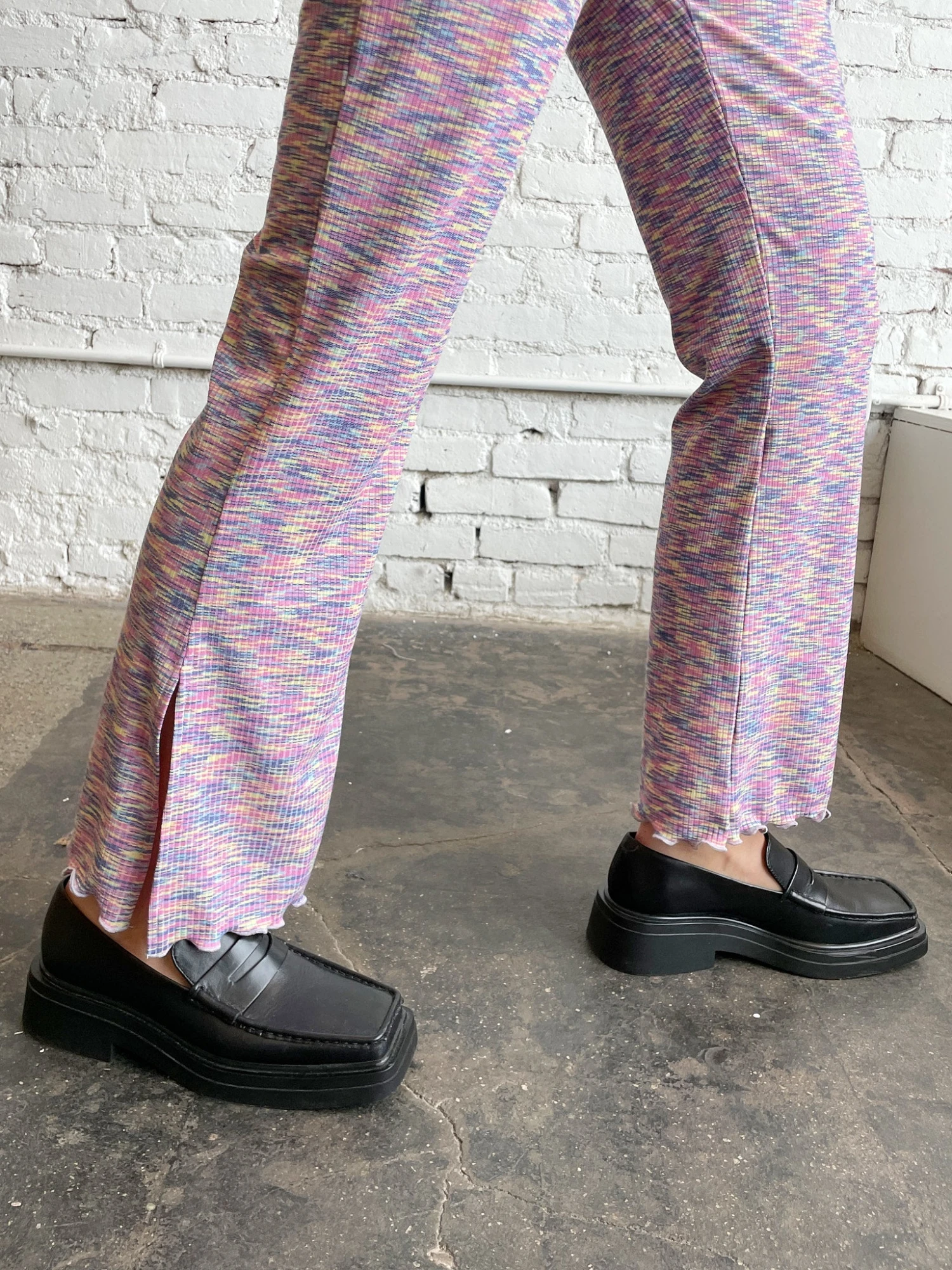 Meet the lounge pant you’ll be wearing in *and* out of the house this season. Space dye flared knit pant with an opening at the ankle.