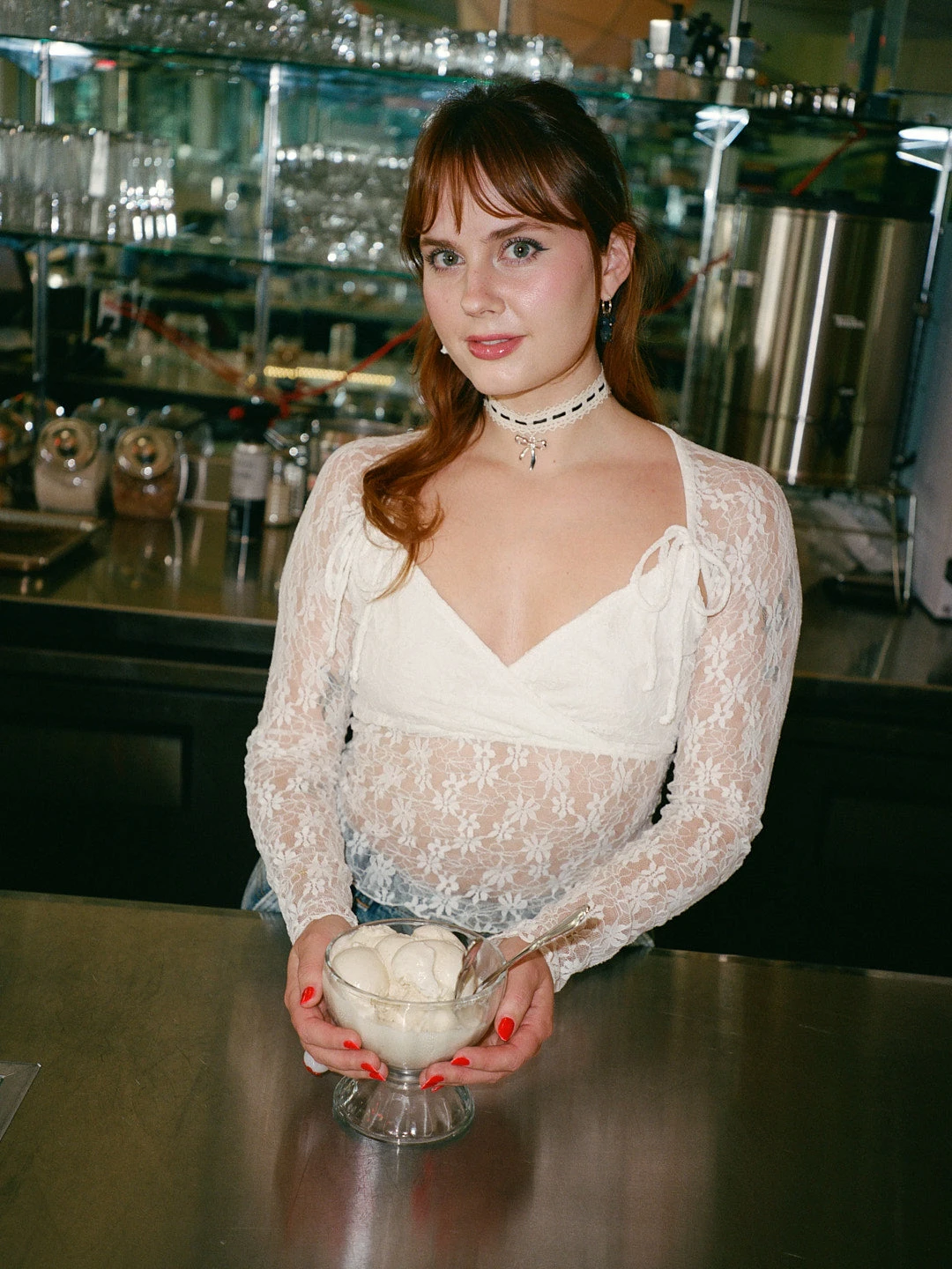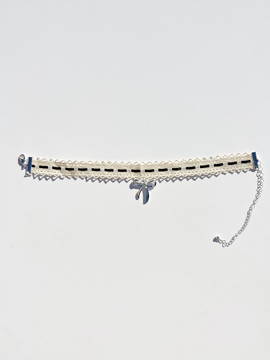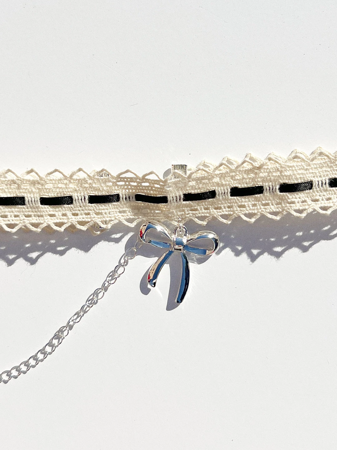 Adorable cream lace choker necklace, features black ribbon details and a silver bow charm.