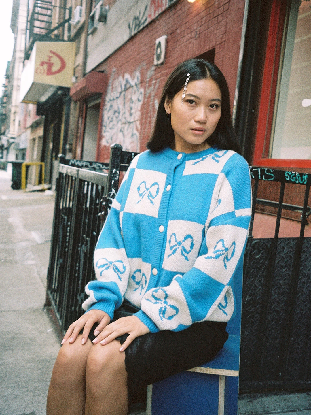 Slightly oversized soft wool blend cardigan in a white and blue check print with bows.