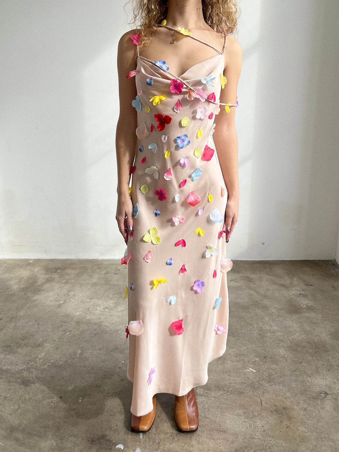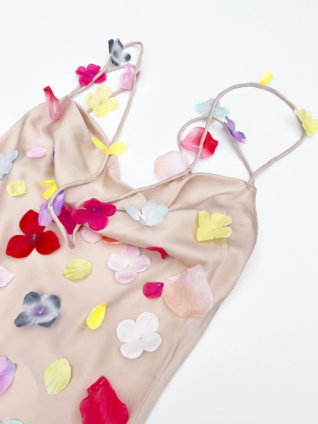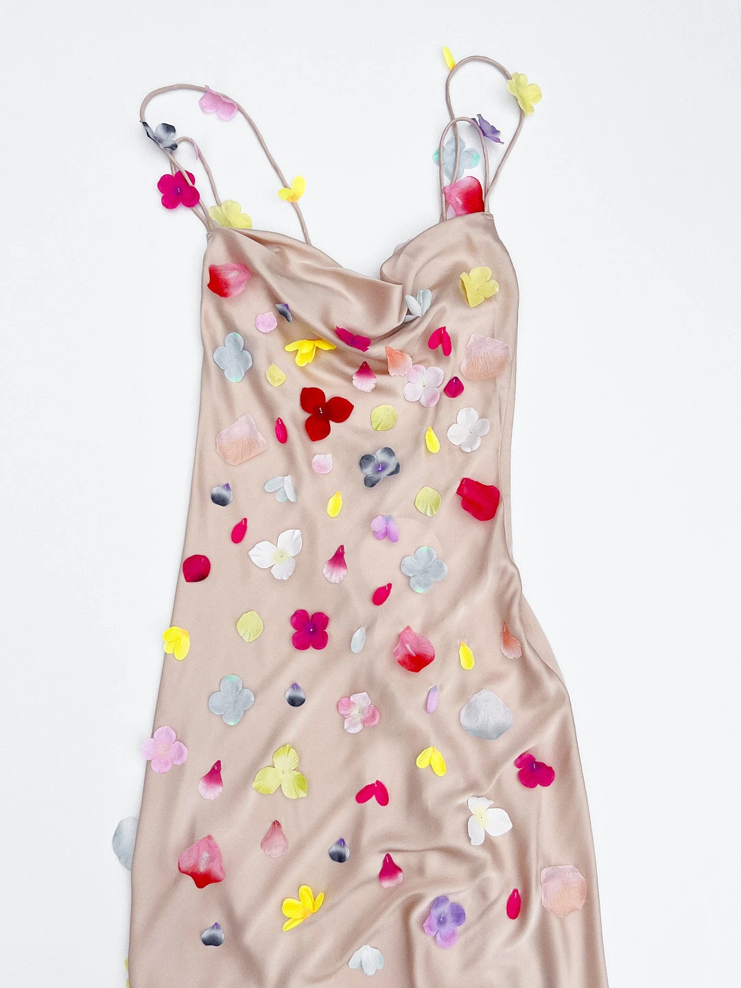 Satin sand colored maxi dress with sewn on flower petals, a scoop neckline, and three versatile straps.