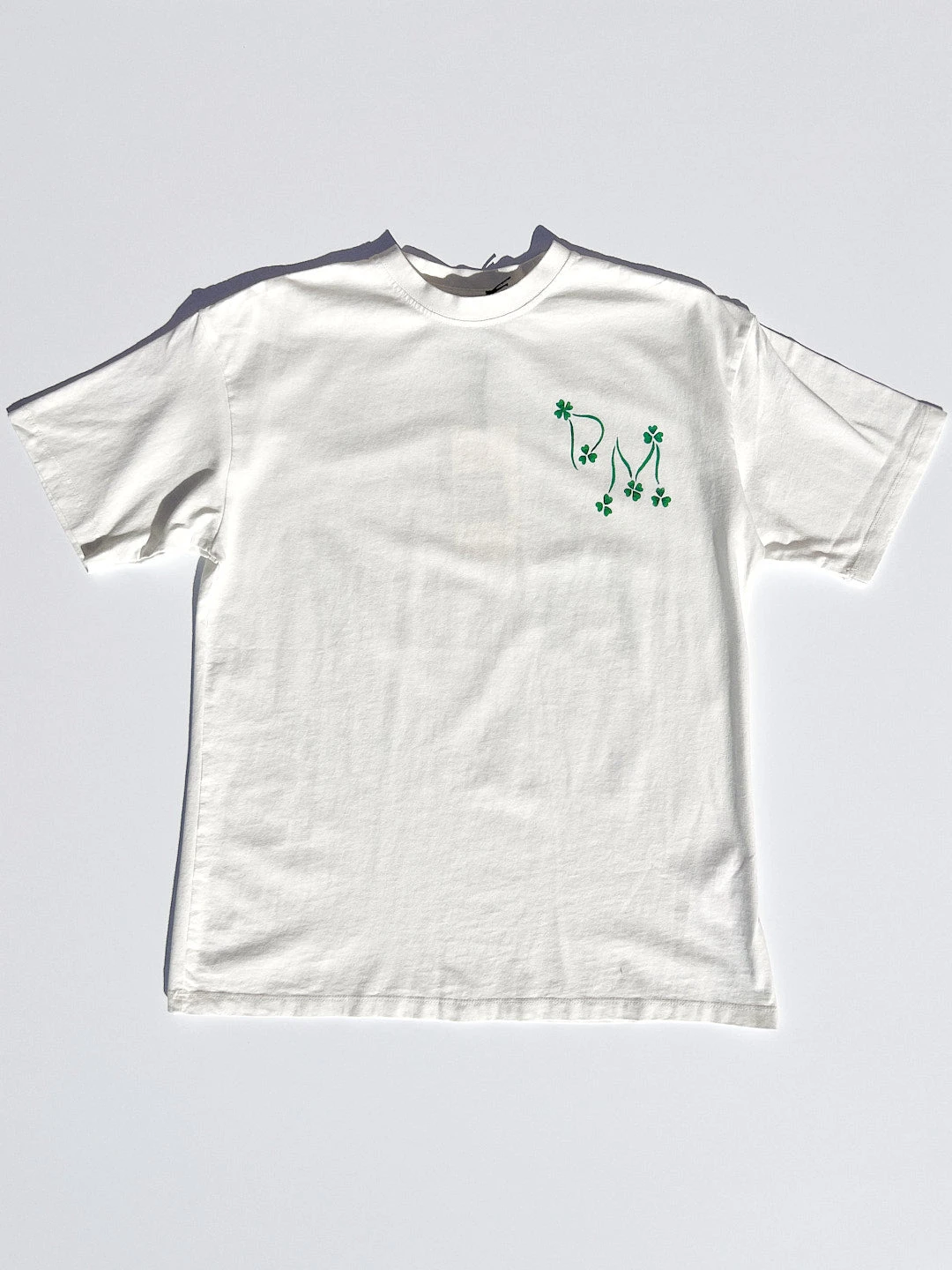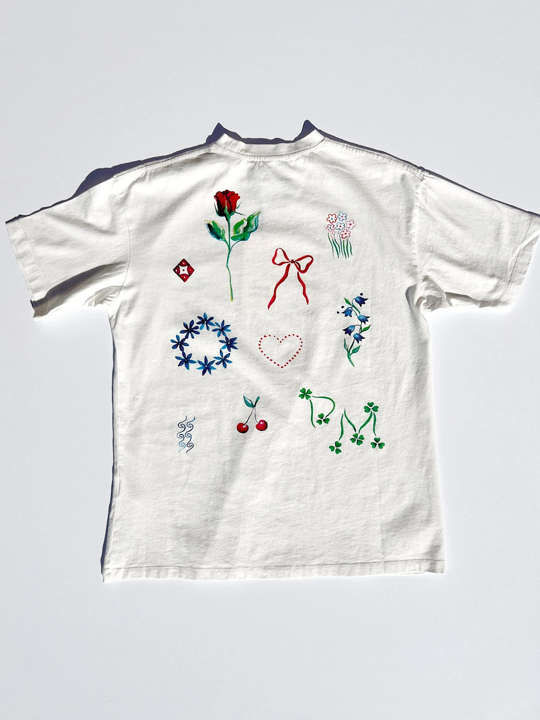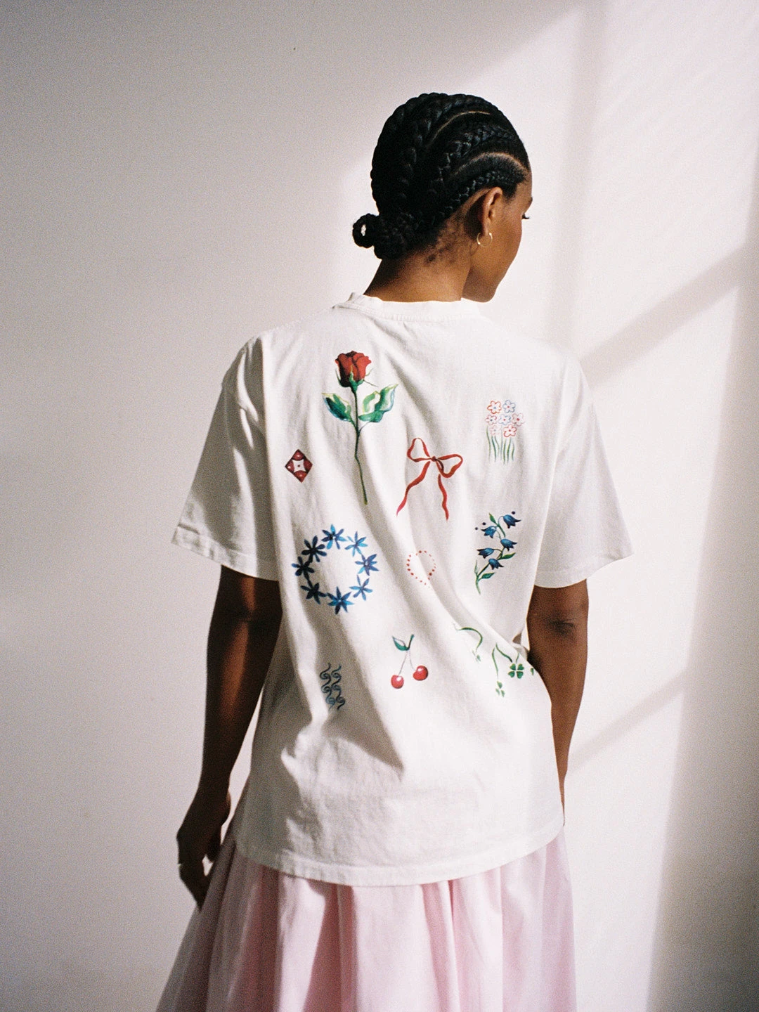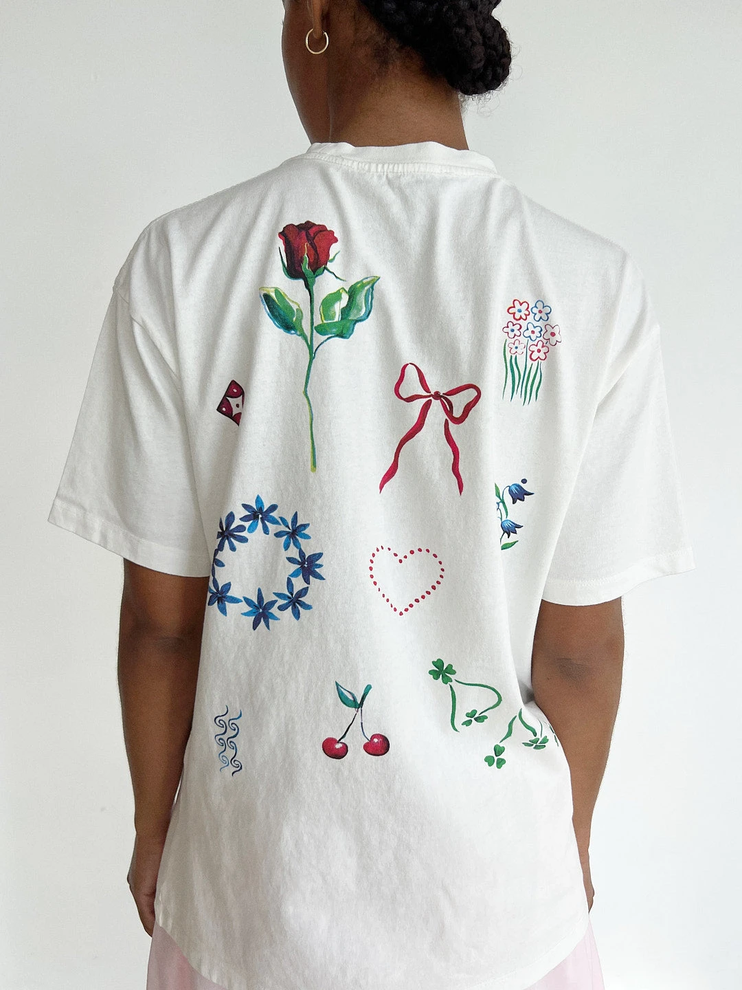 An oversized off white short sleeve tee with uniquely adorable doodle artwork.
