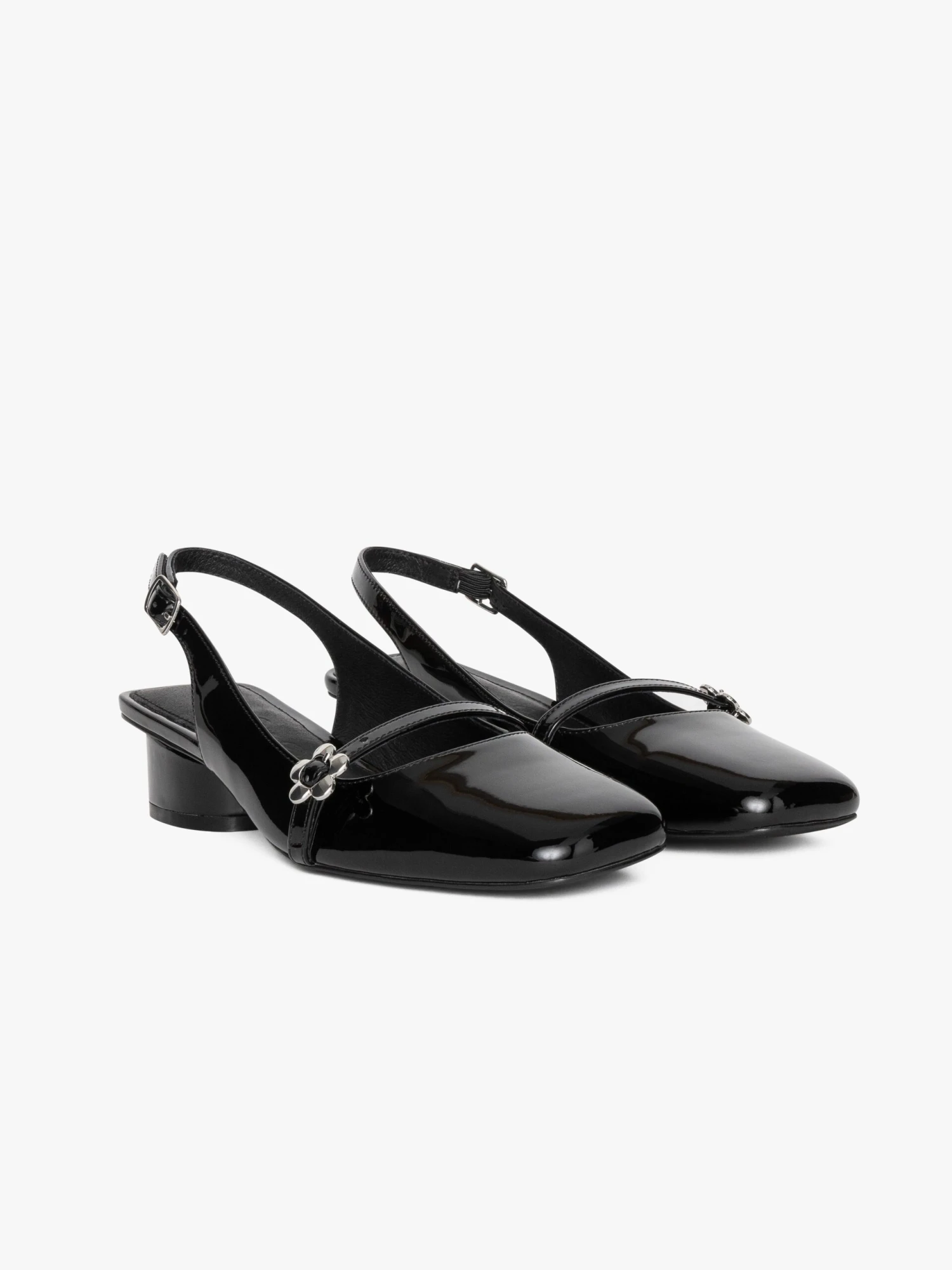 A black patent closed-toe slingback heel with a square toe box and low heel, featuring a strap and silver flower detail across the top of the foot. Suggest to size up if you are in between sizes or have a wider foot.