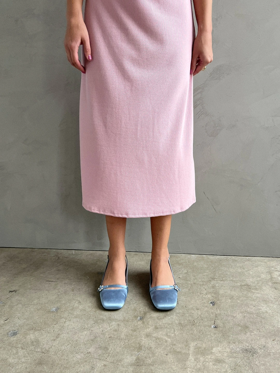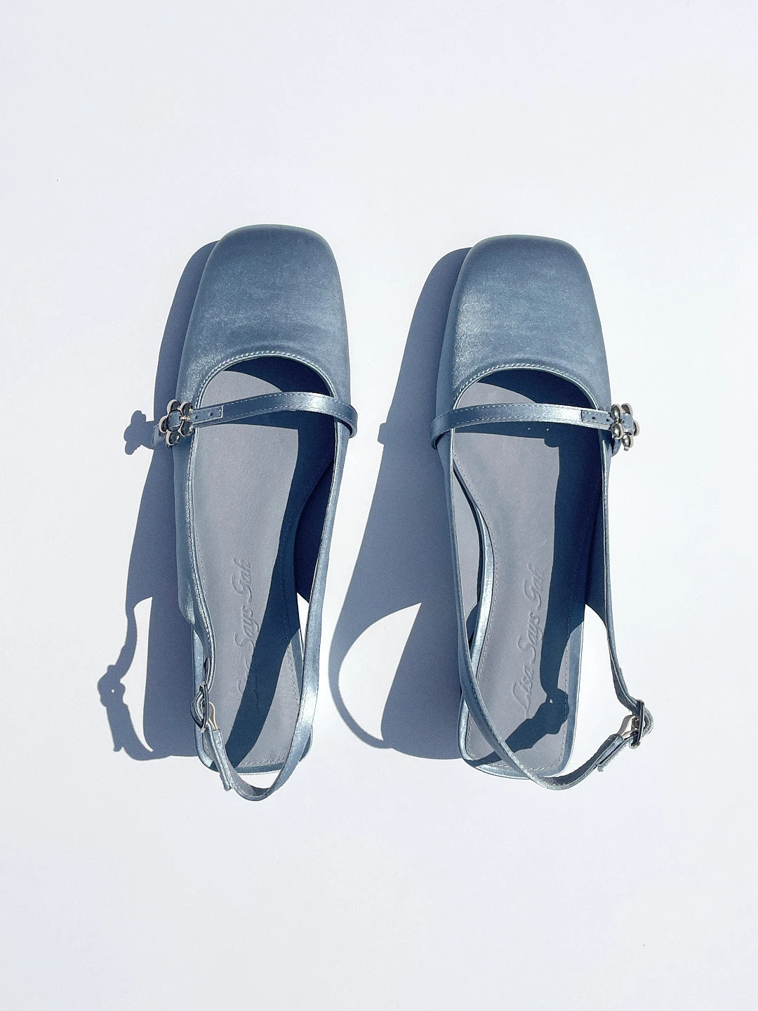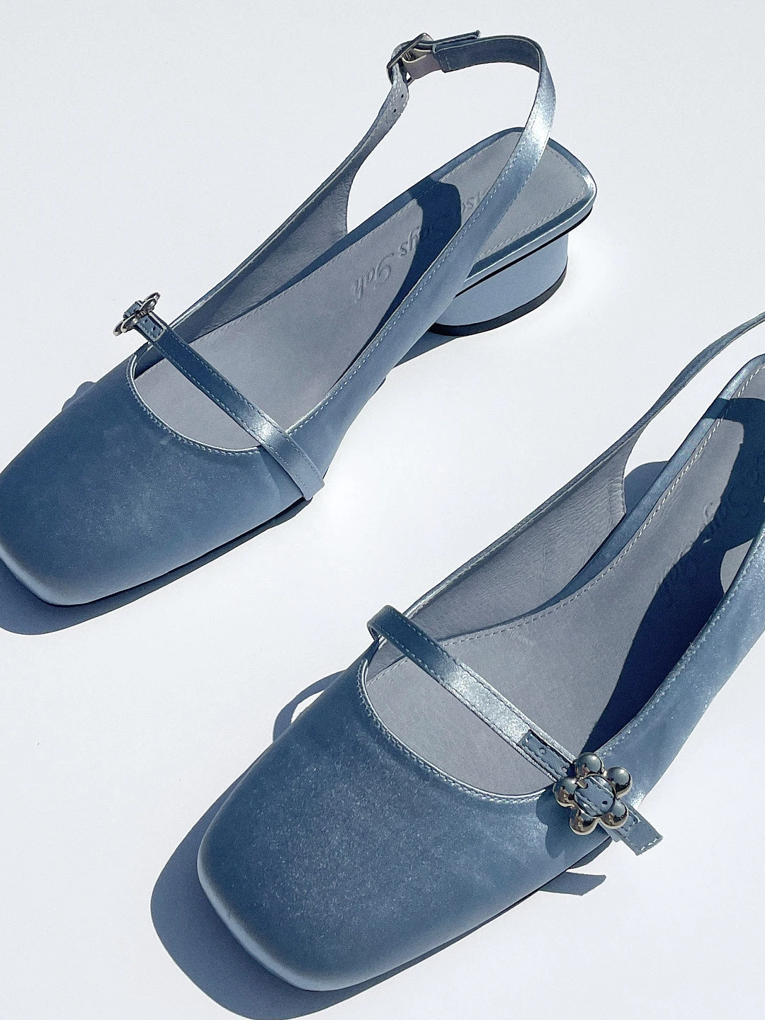 A soft blue closed-toe slingback heel with a square toe box and low heel, featuring a strap and silver flower detail across the top of the foot. Suggest to size up if you are in between sizes or have a wider foot.