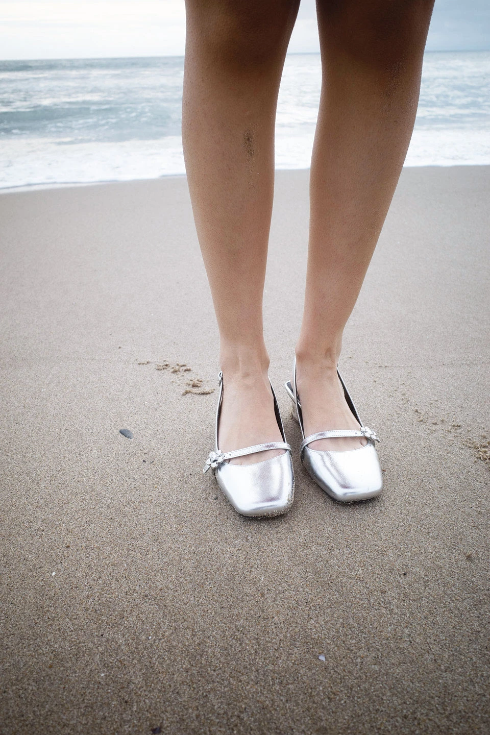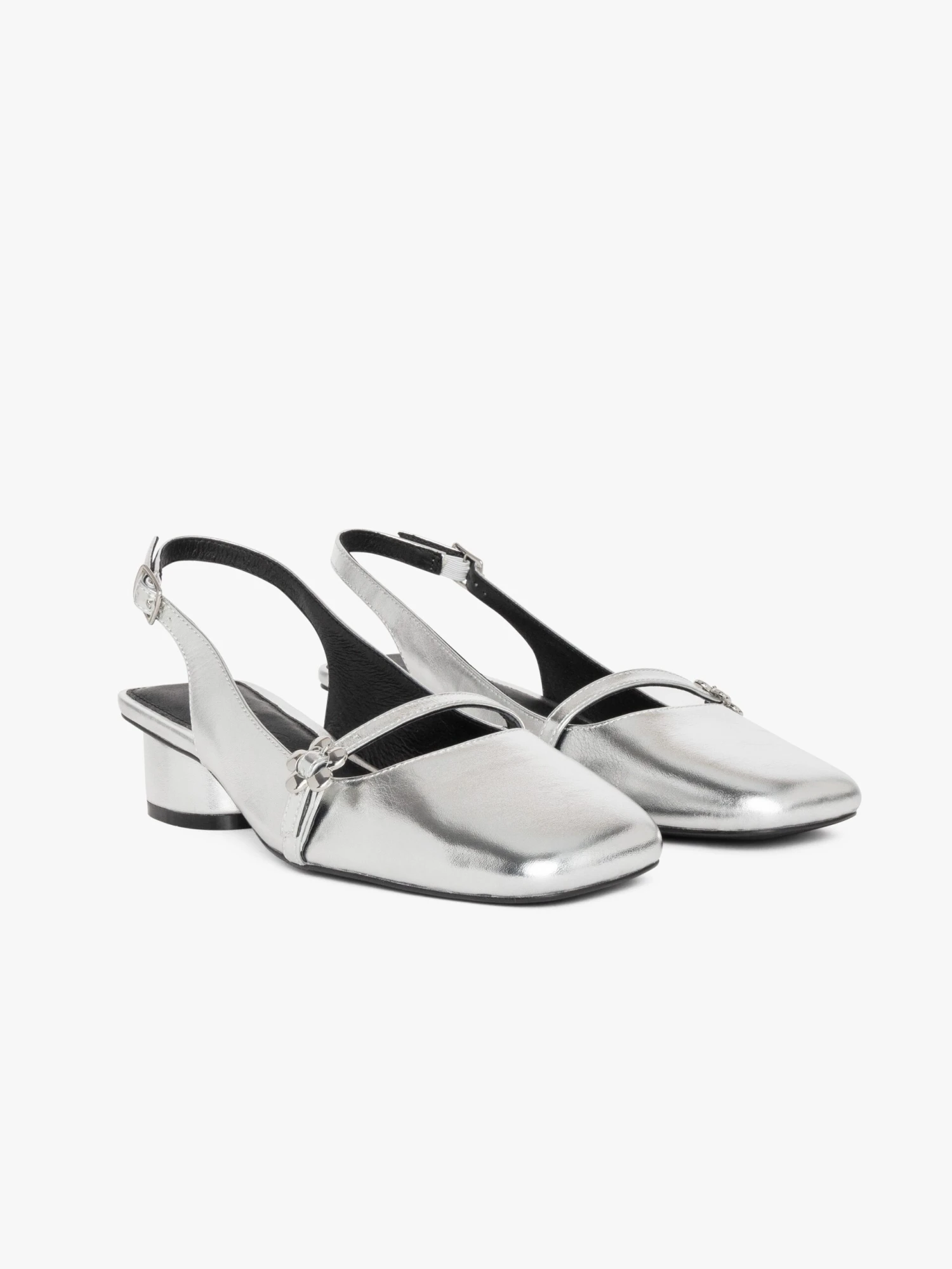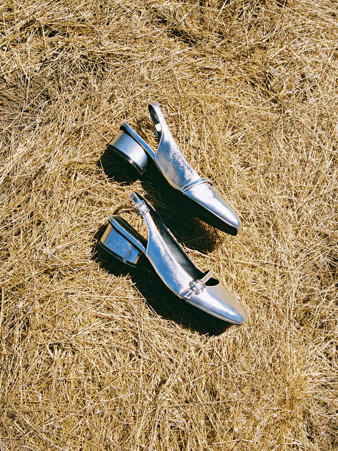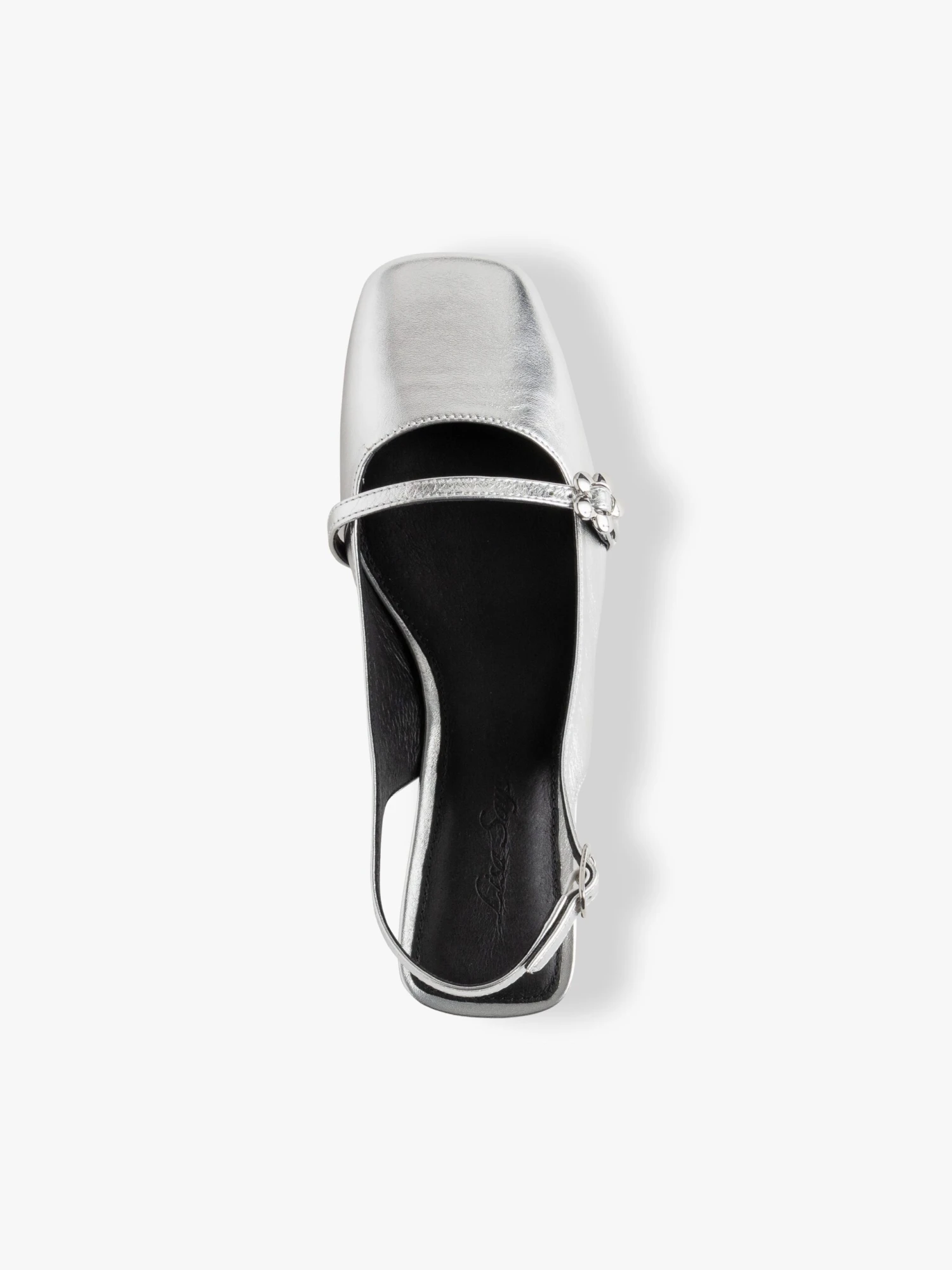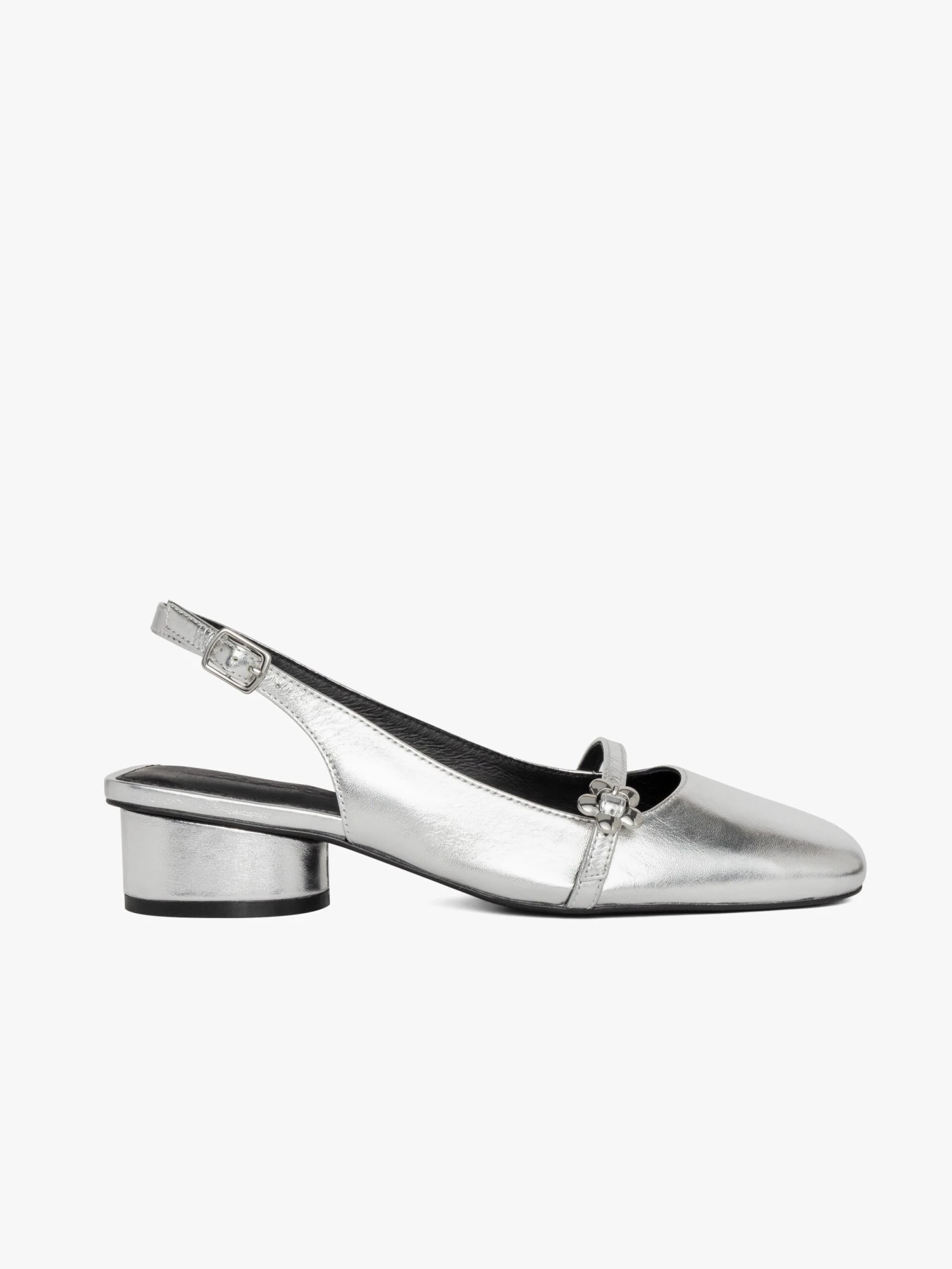 A silver closed-toe slingback heel with a square toe box and low heel, featuring a strap and silver flower detail across the top of the foot. Suggest to size up if you are in between sizes or have a wider foot.