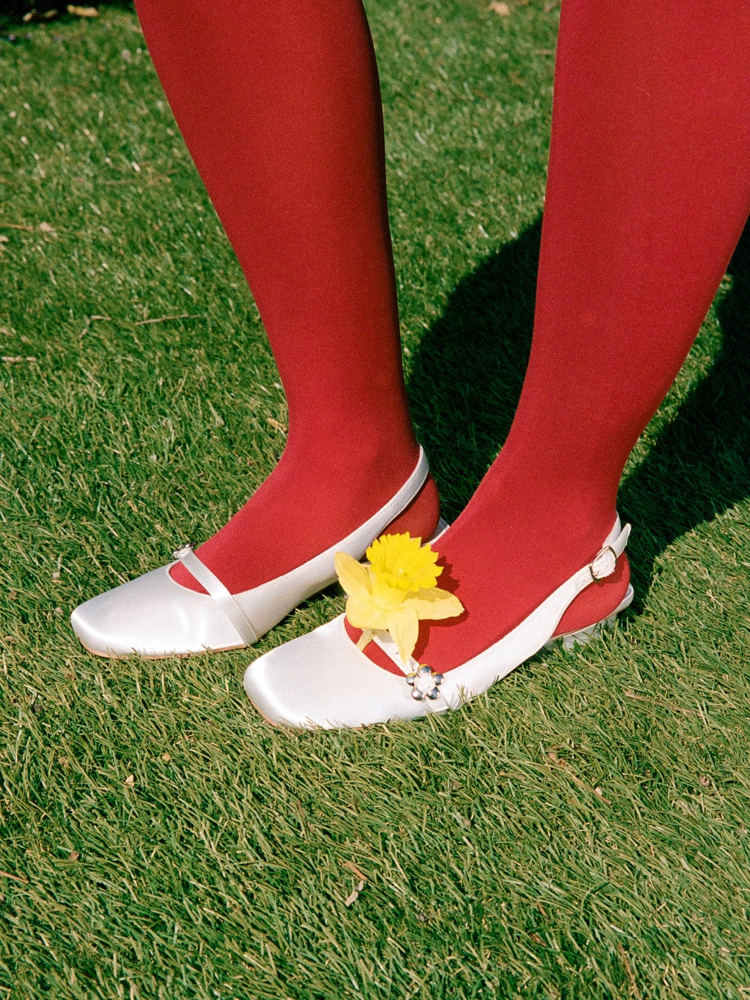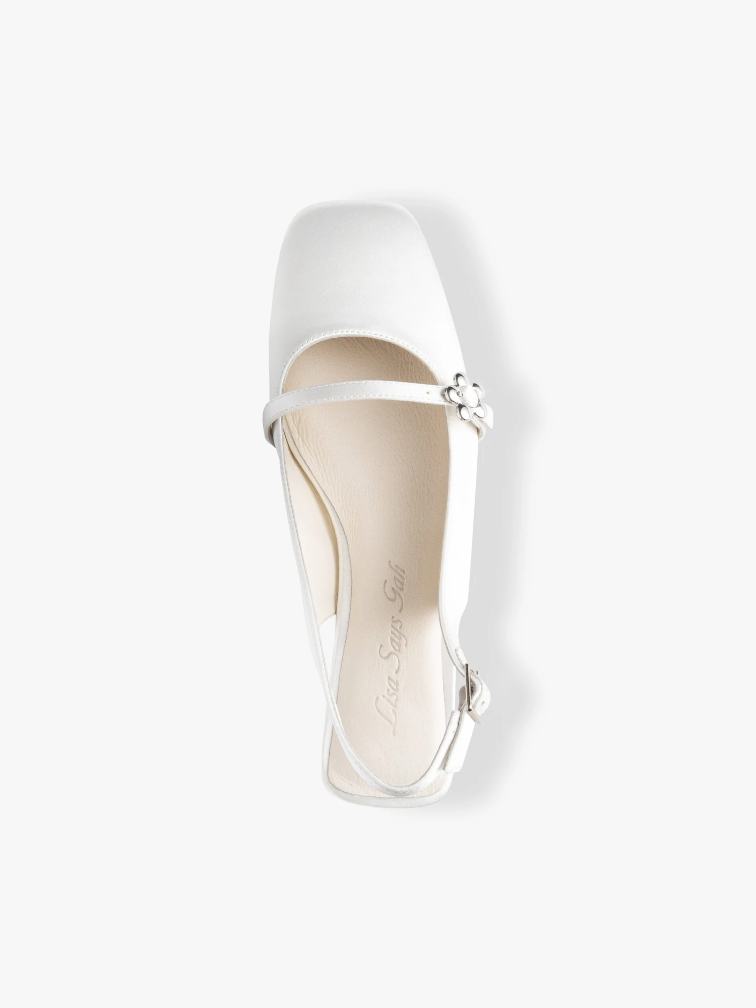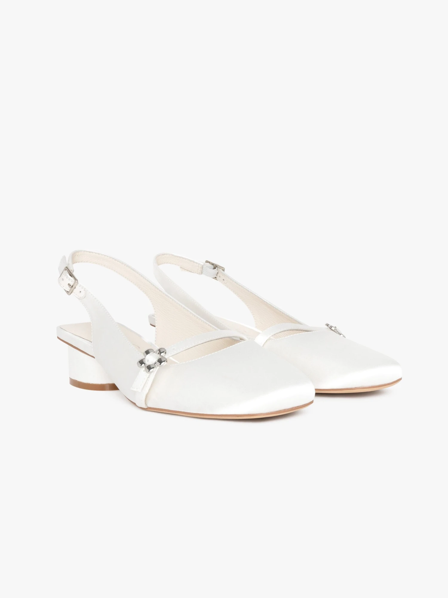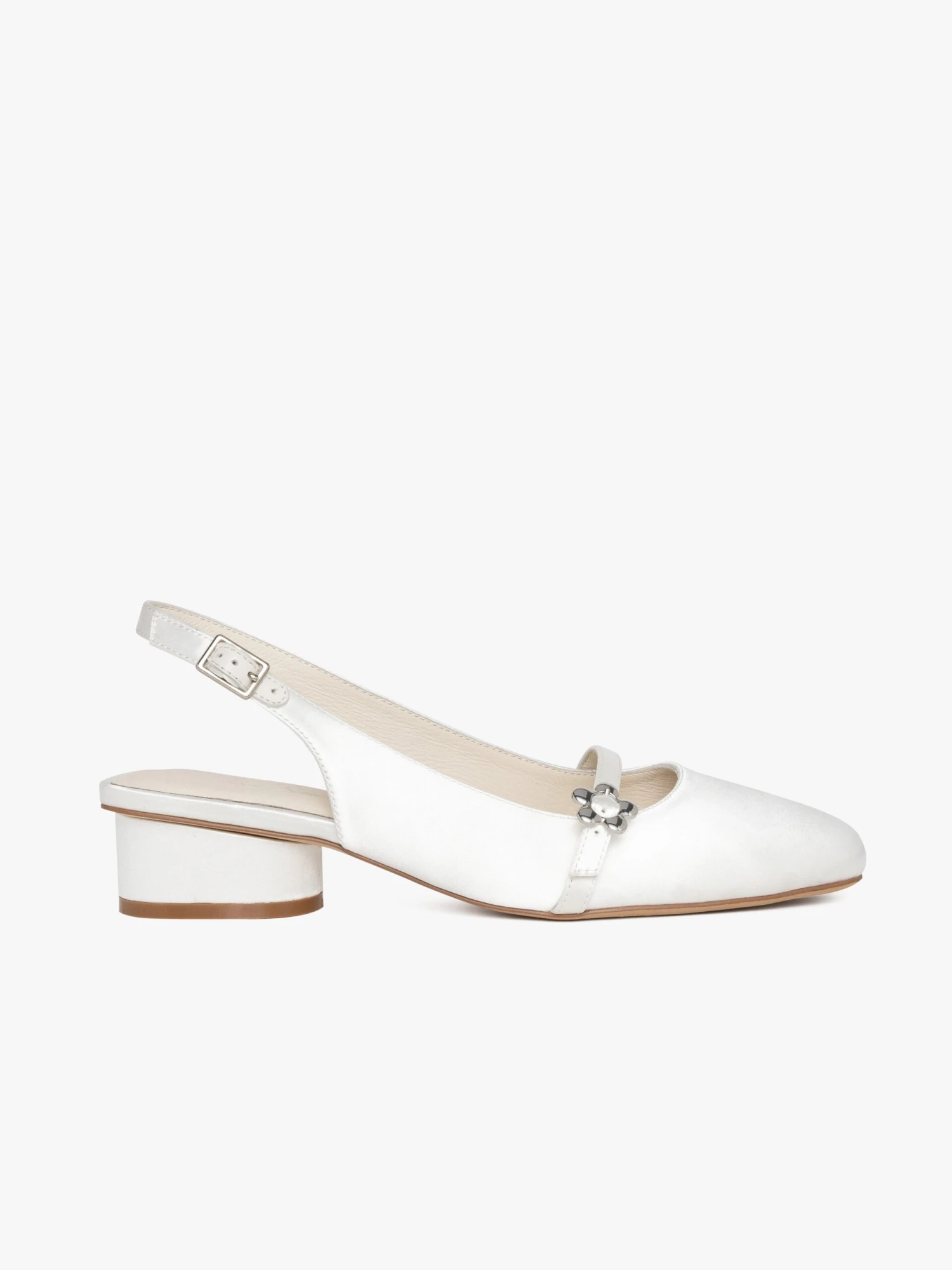 A soft white satin closed-toe slingback heel with a square toe box and low heel, featuring a strap and silver flower detail across the top of the foot. Suggest to size up if you are in between sizes or have a wider foot.