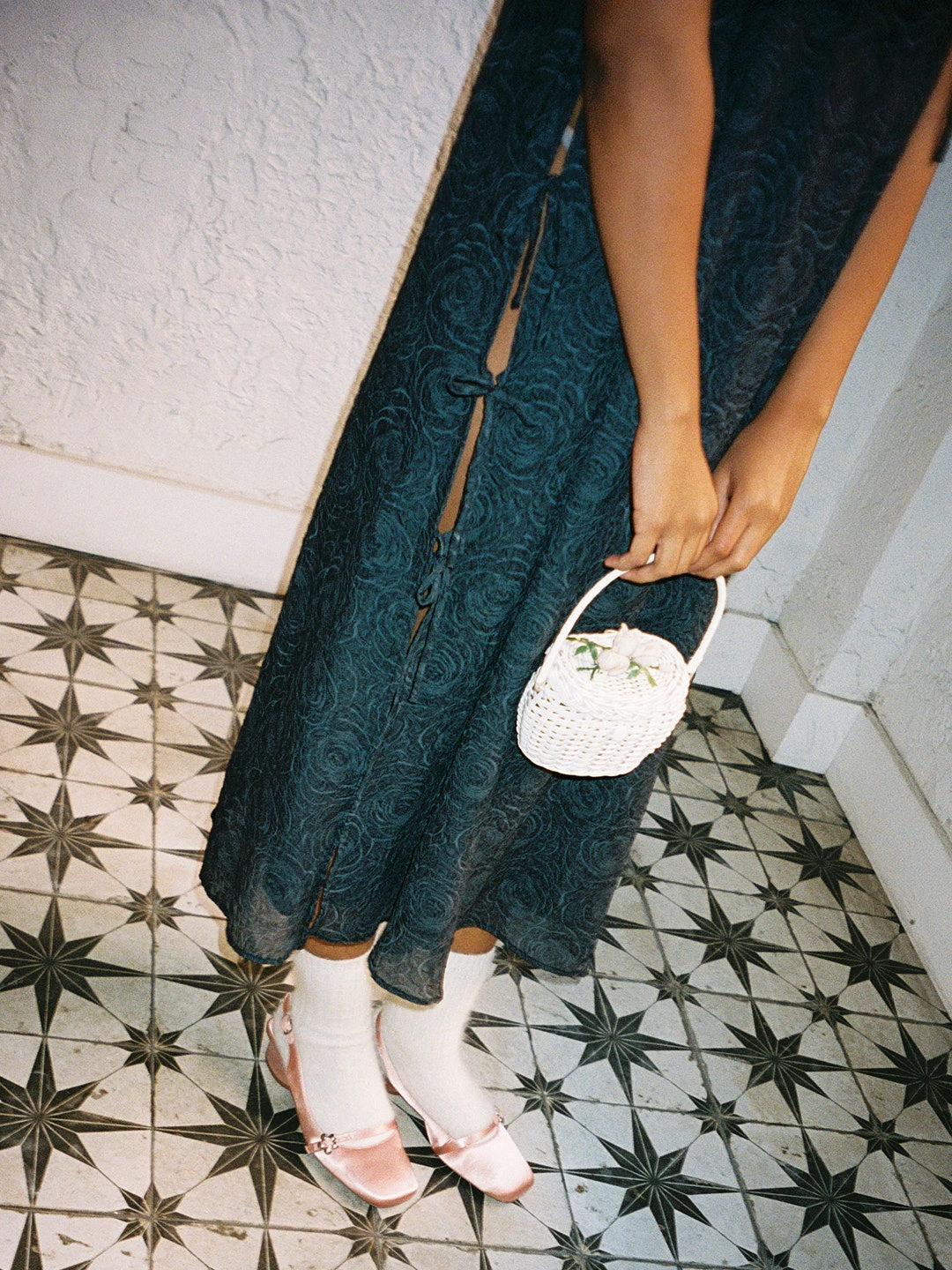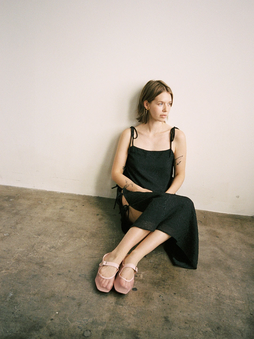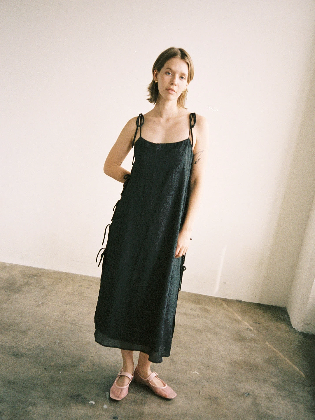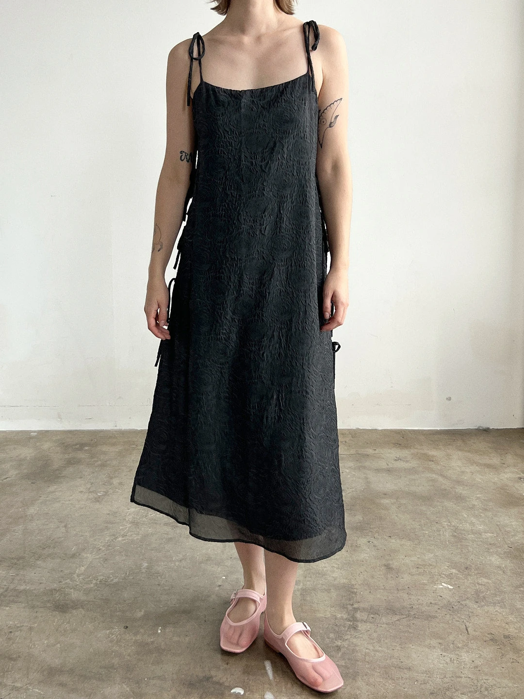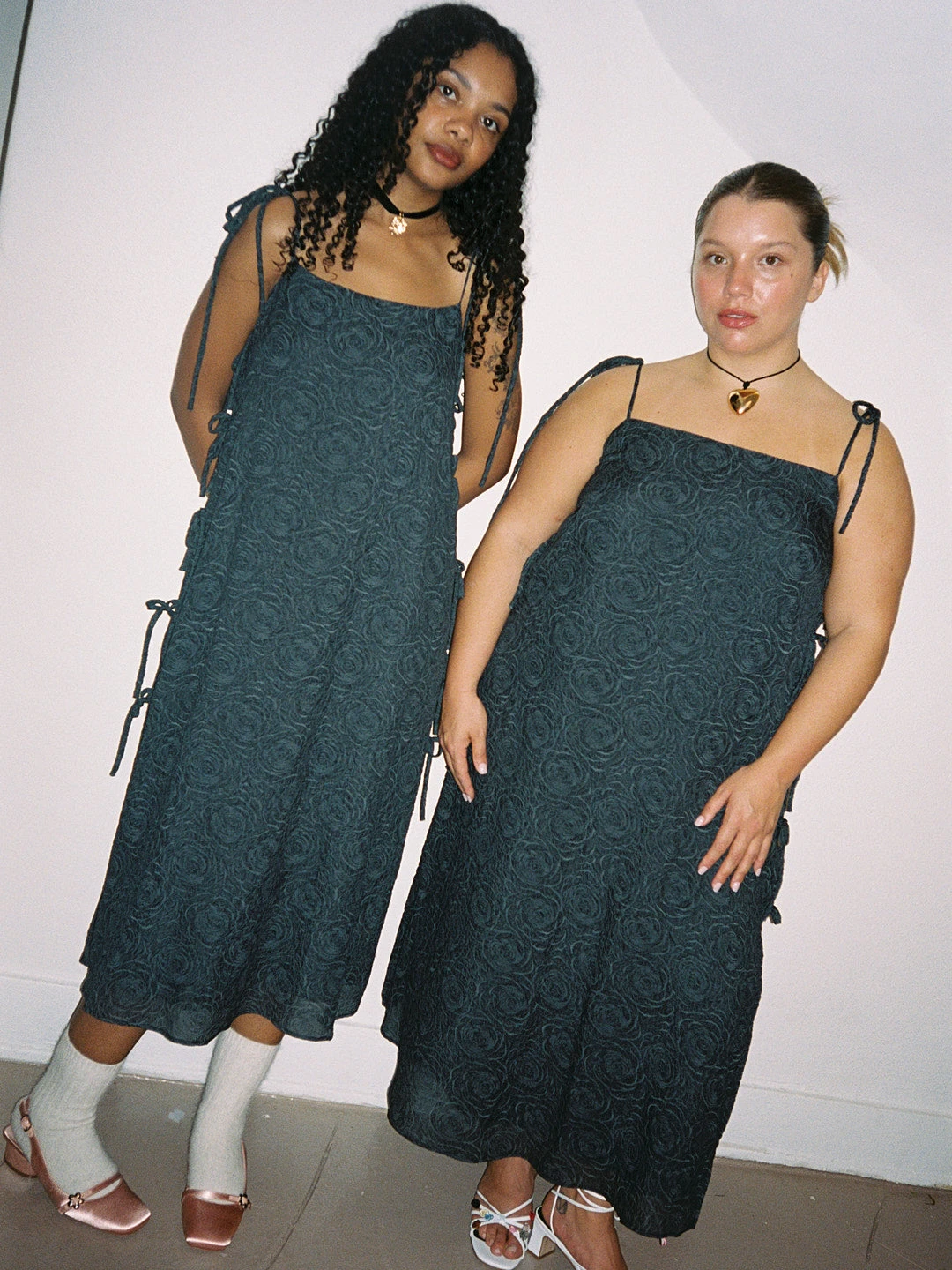 The playful Mar Tie Midi Dress in Black Rosette has got you covered with its fully lined rosette print. Keep things adjustable with bow ties on both side seams and tie straps.