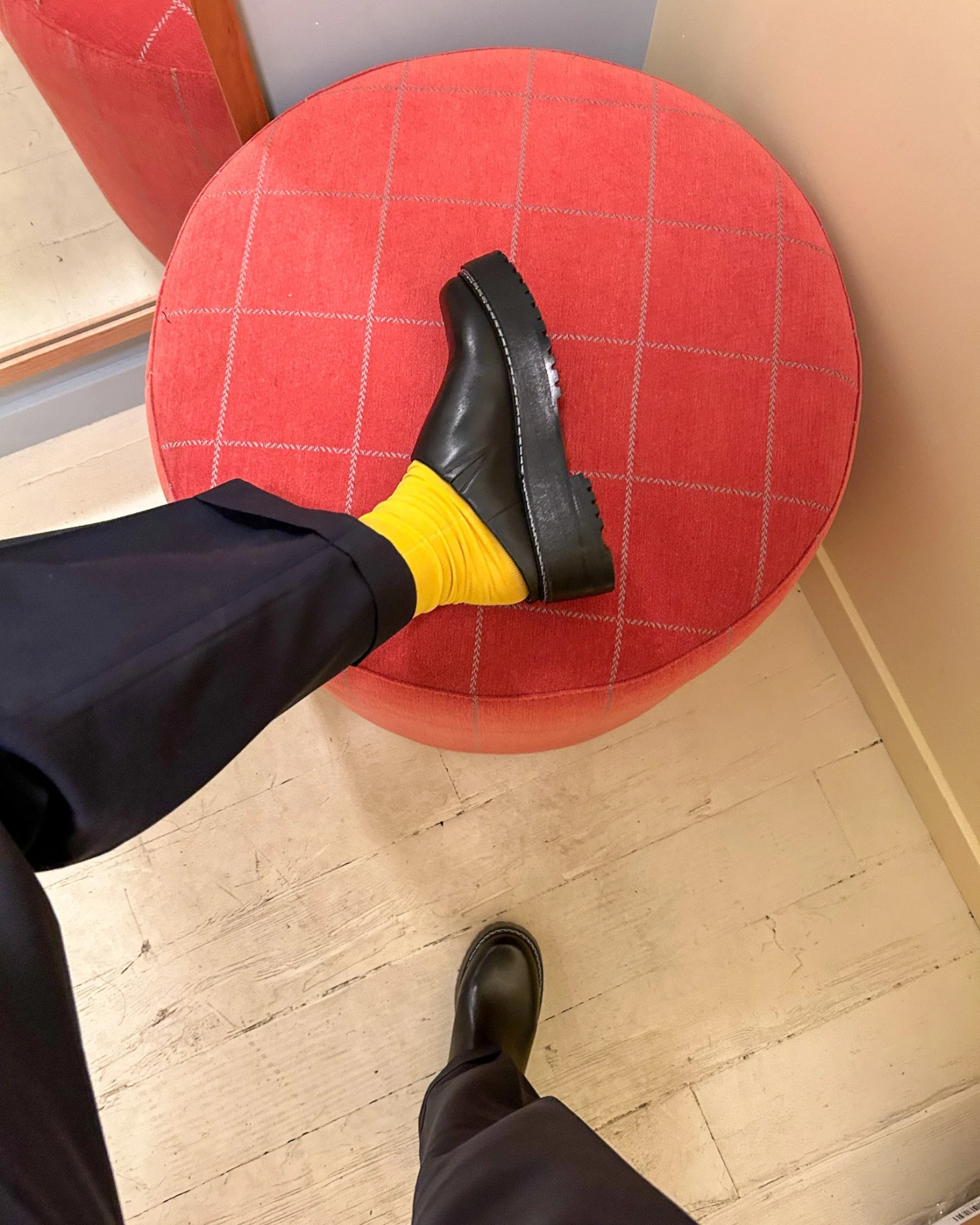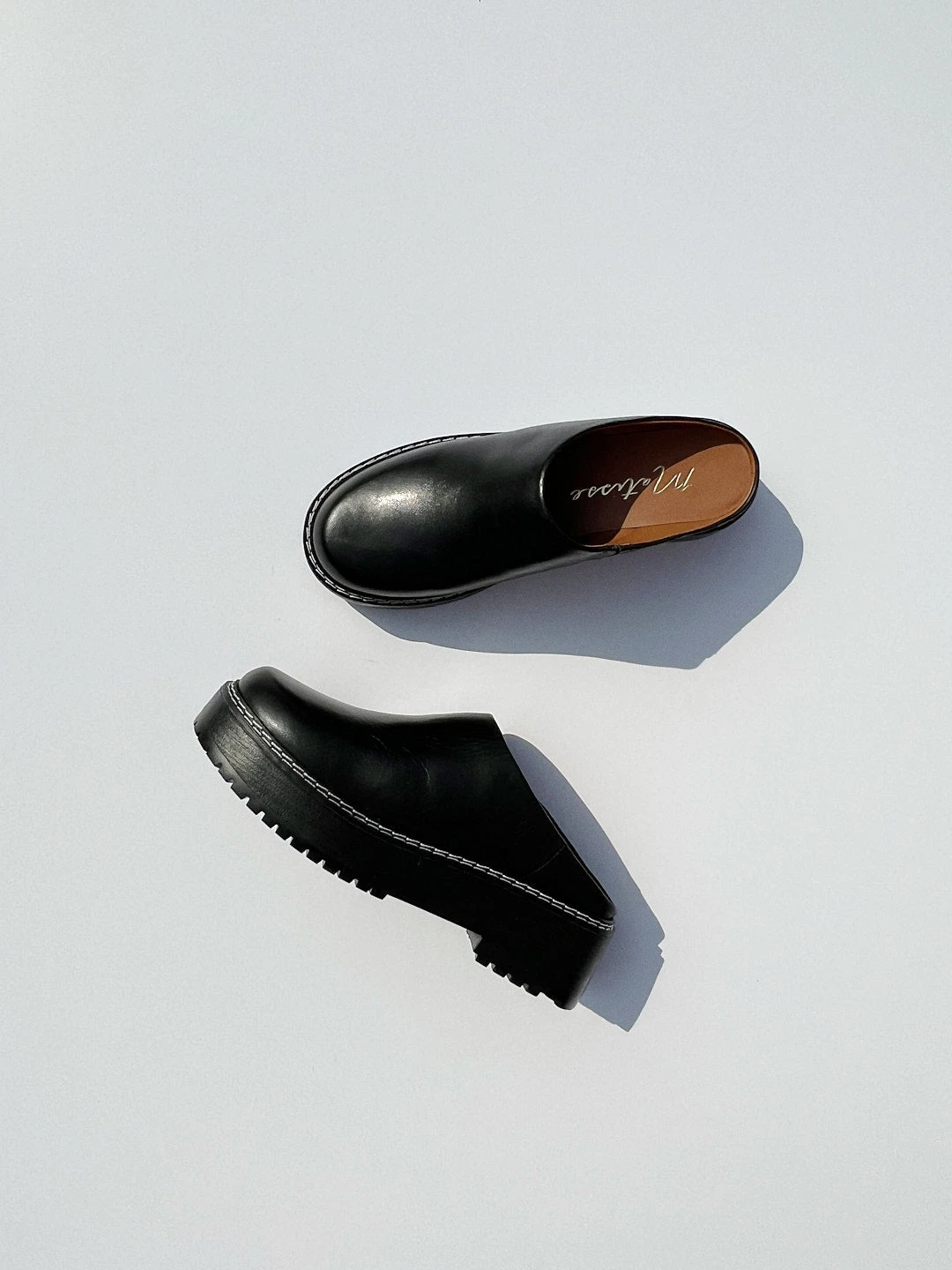 *runs about a 1/2 size small* A super comfy chunky black platform mule slide. Made with a smooth leather upper and lightweight bottom with white contrast stitching. Wear it with socks for cooler weather!