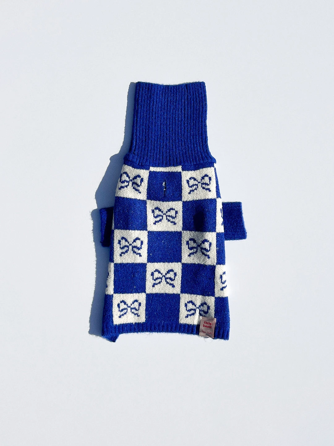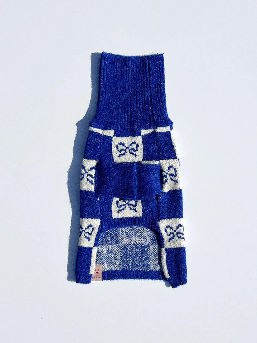A dark blue and ivory check roll turtleneck sweater with two front leg sleeves and an open back. Stretchy and super soft for your beloved pet!