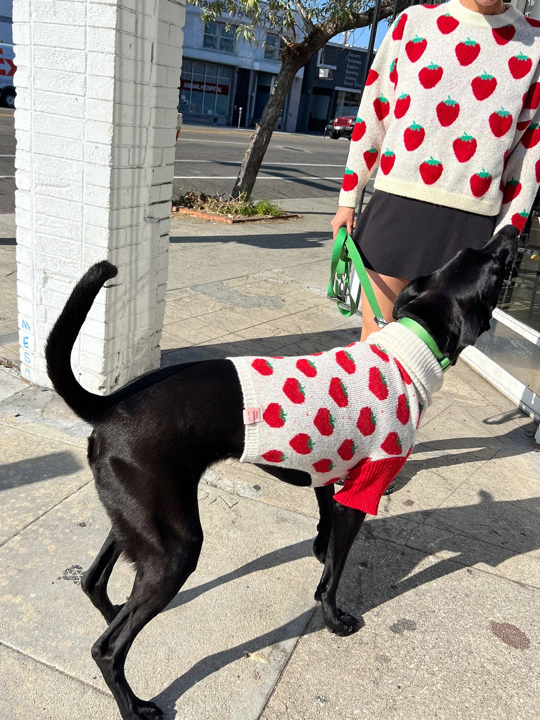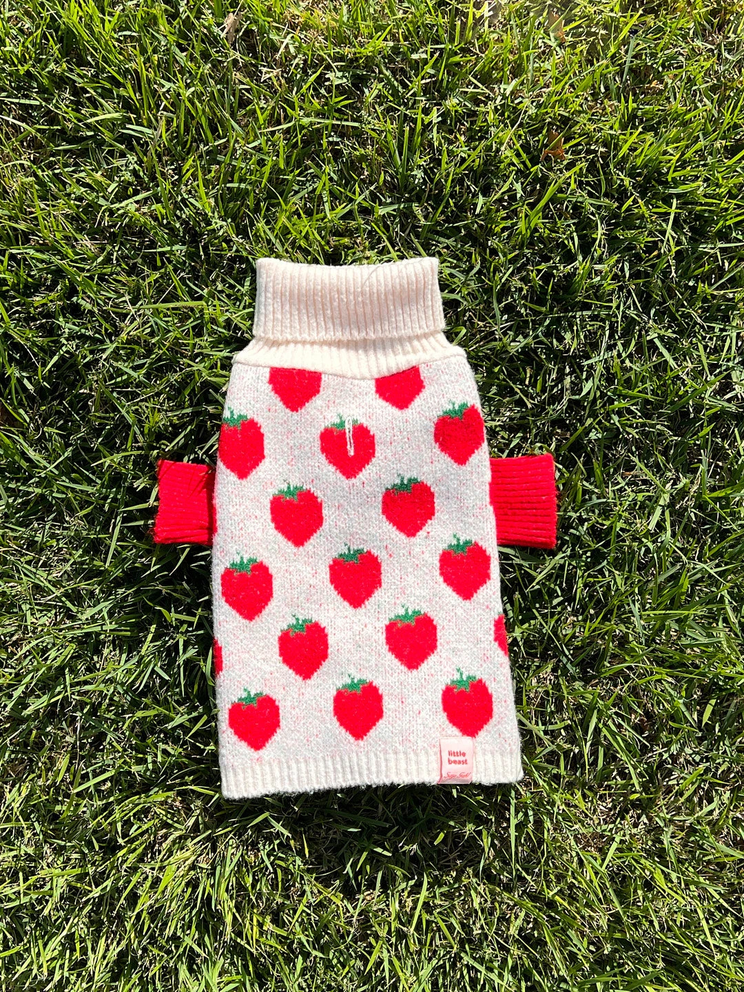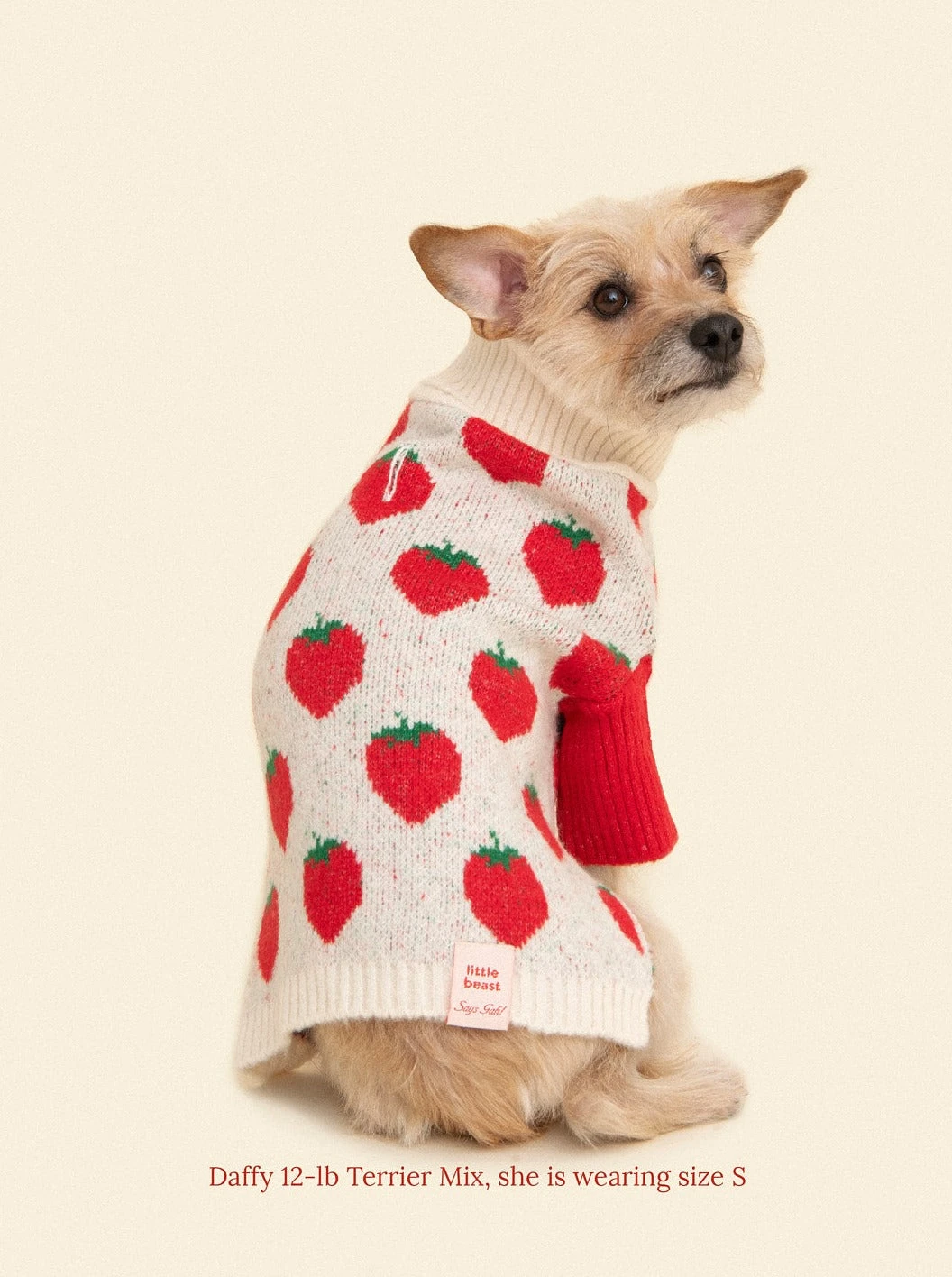 A strawberry design roll turtleneck sweater with two front leg sleeves and an open back. Stretchy and super soft for your beloved pet!