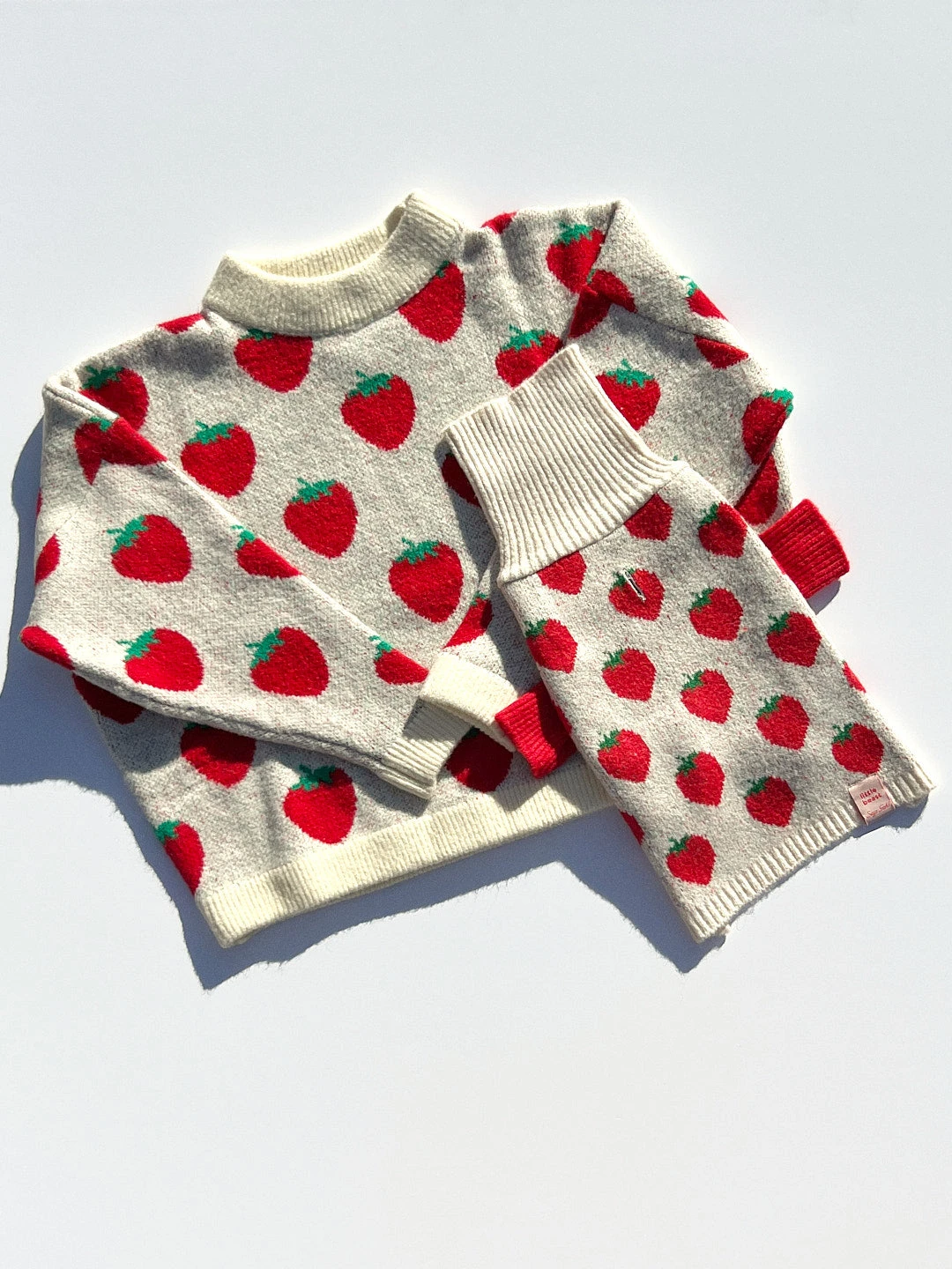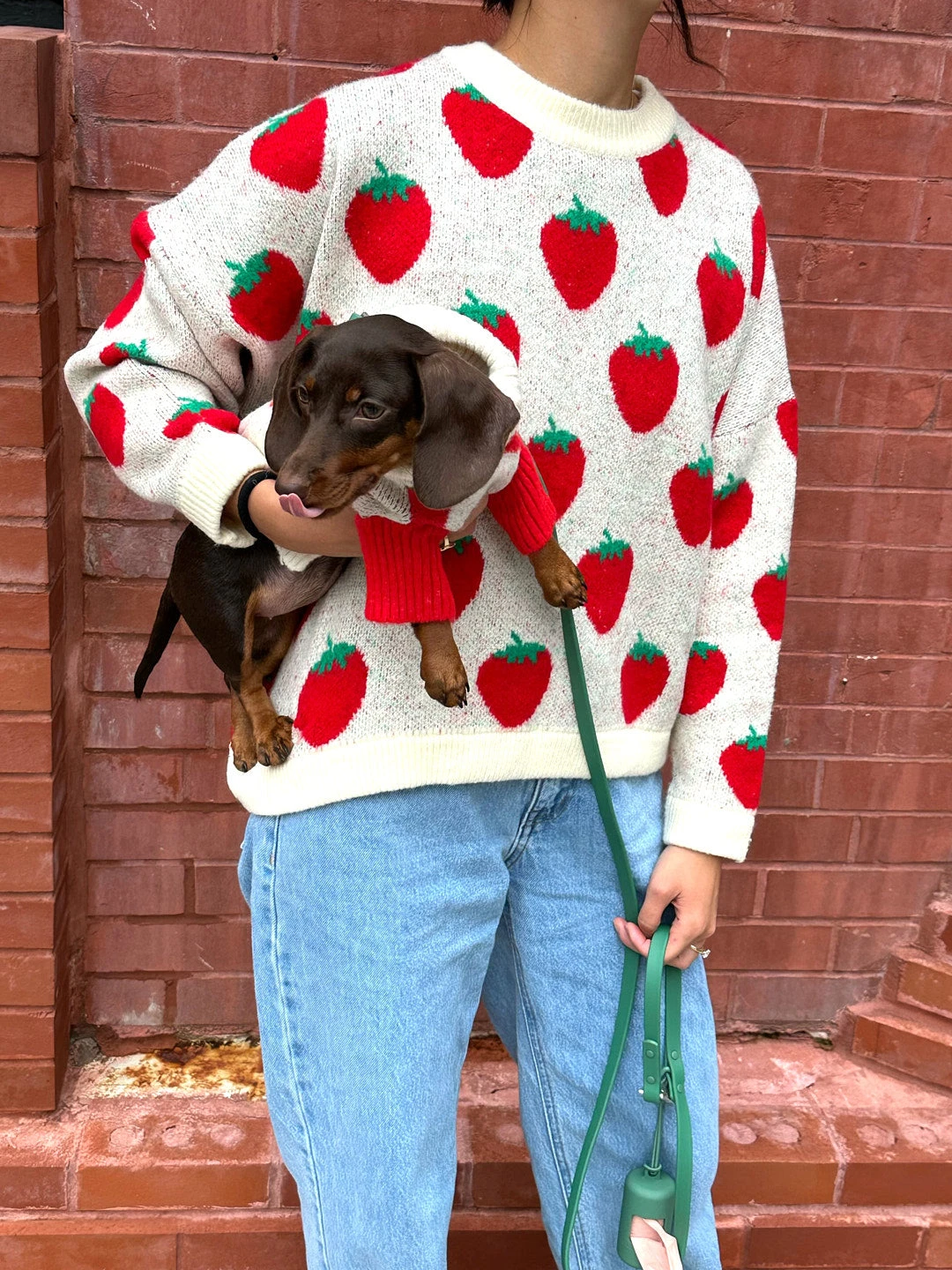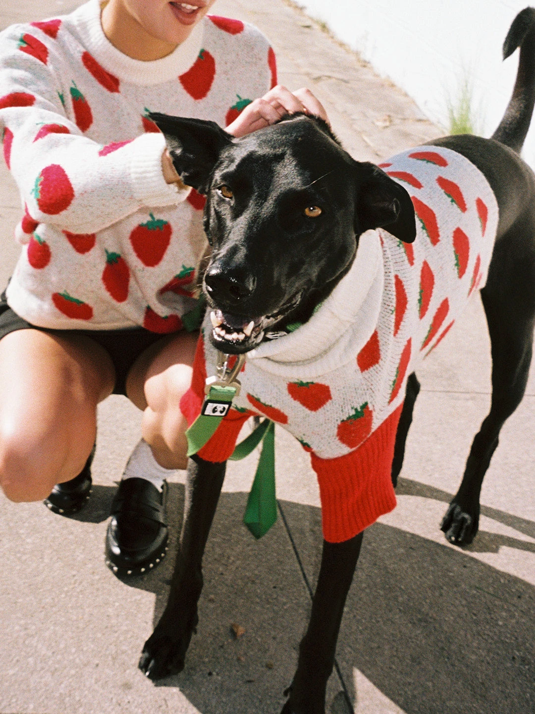 A strawberry design roll turtleneck sweater with two front leg sleeves and an open back. Stretchy and super soft for your beloved pet!