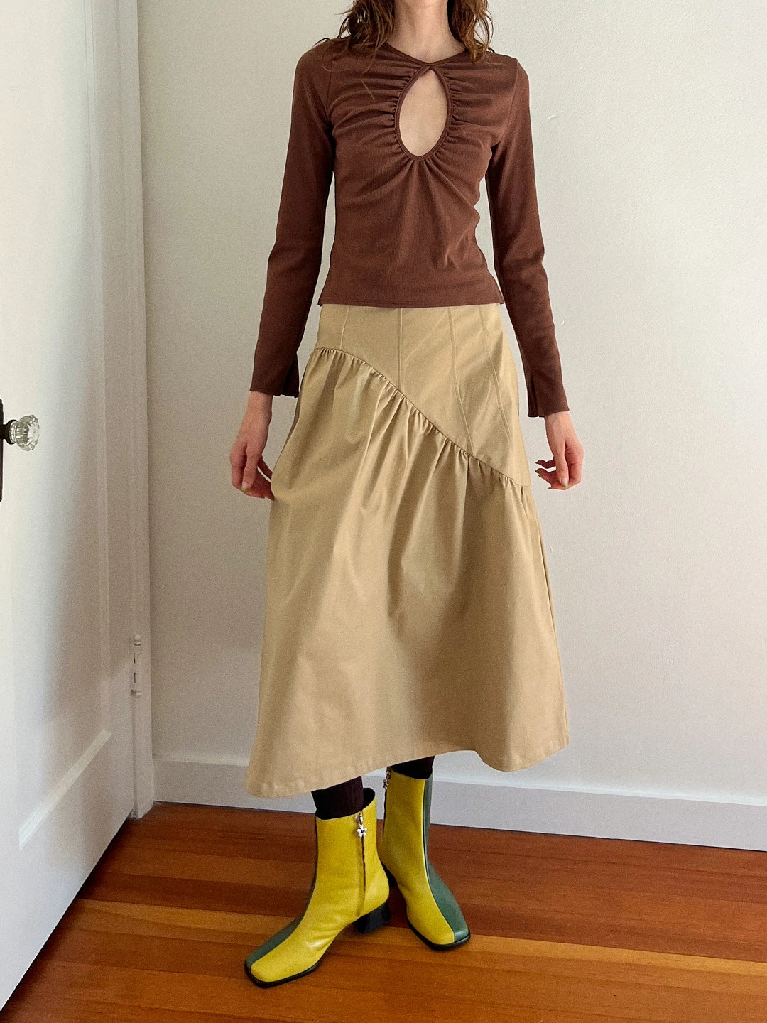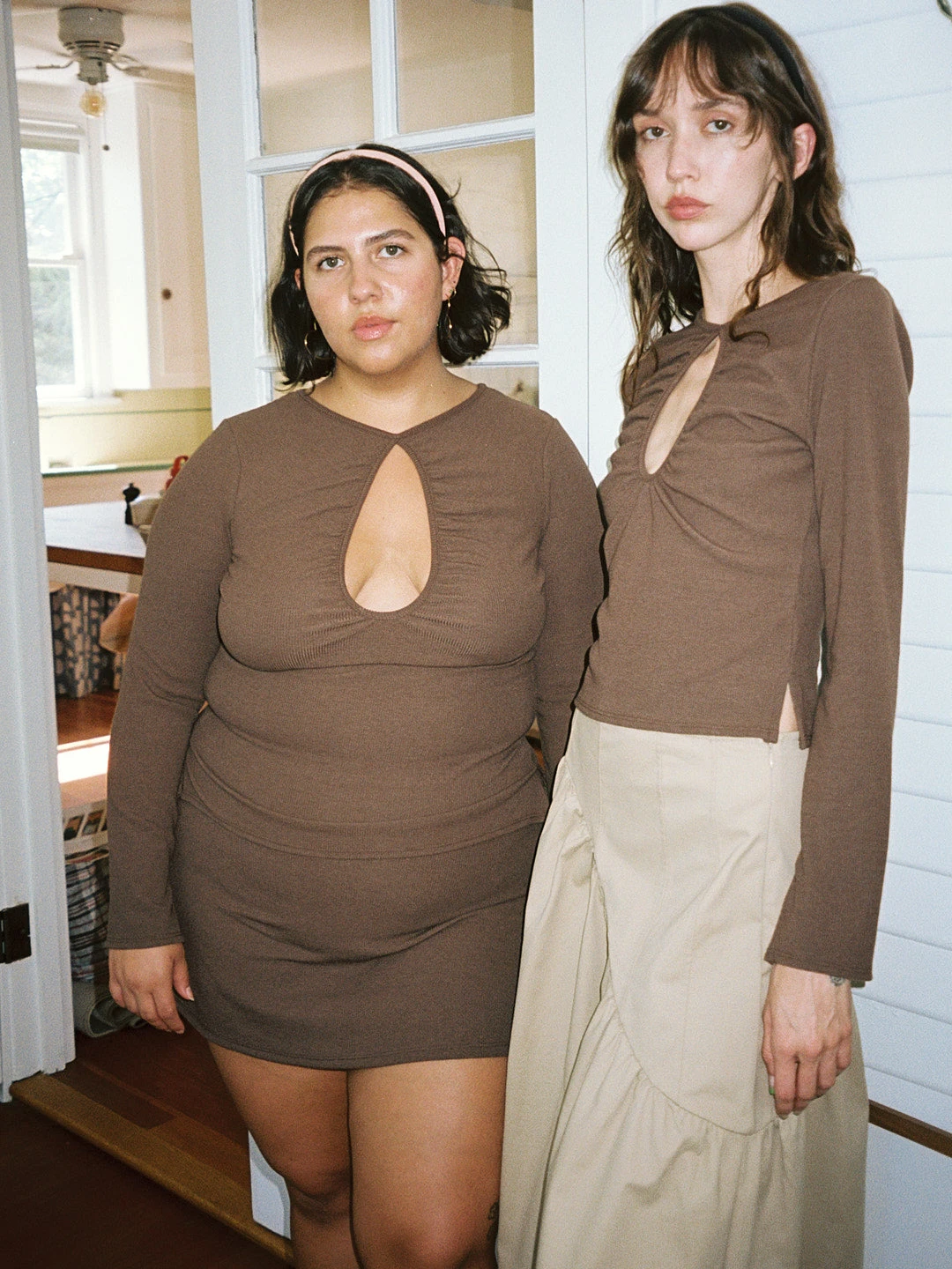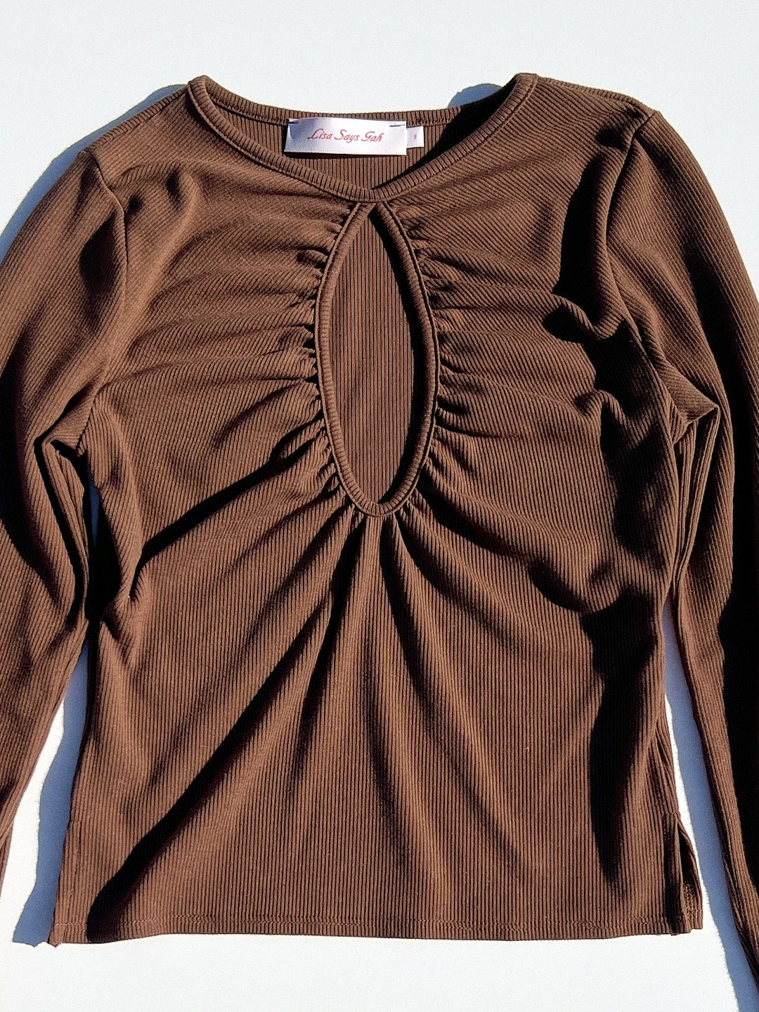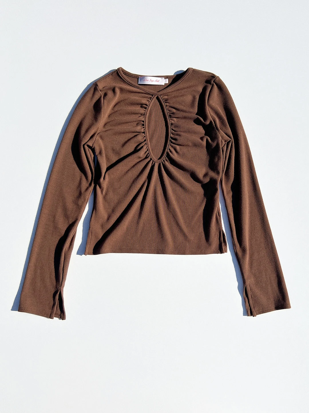 Soft brown long sleeve top with large keyhole detail and split seam detail at sleeves and the sides of the waist.