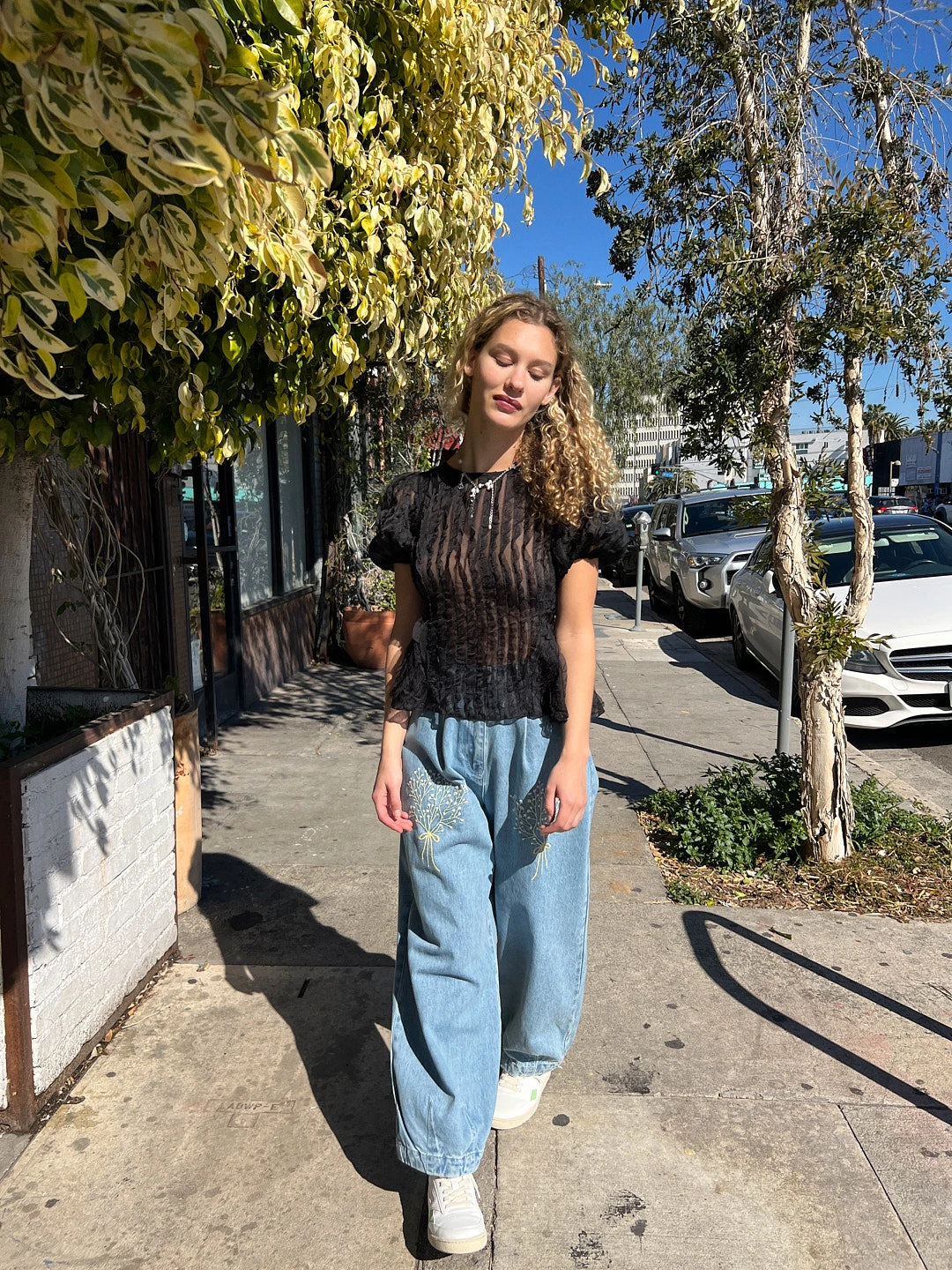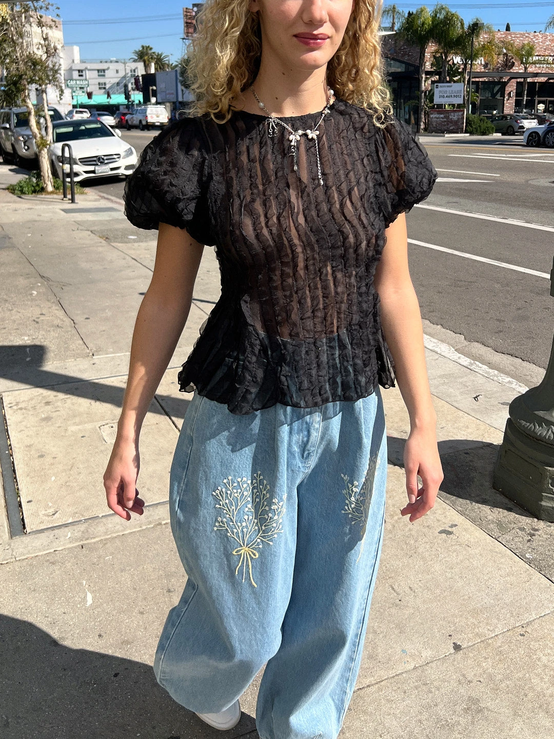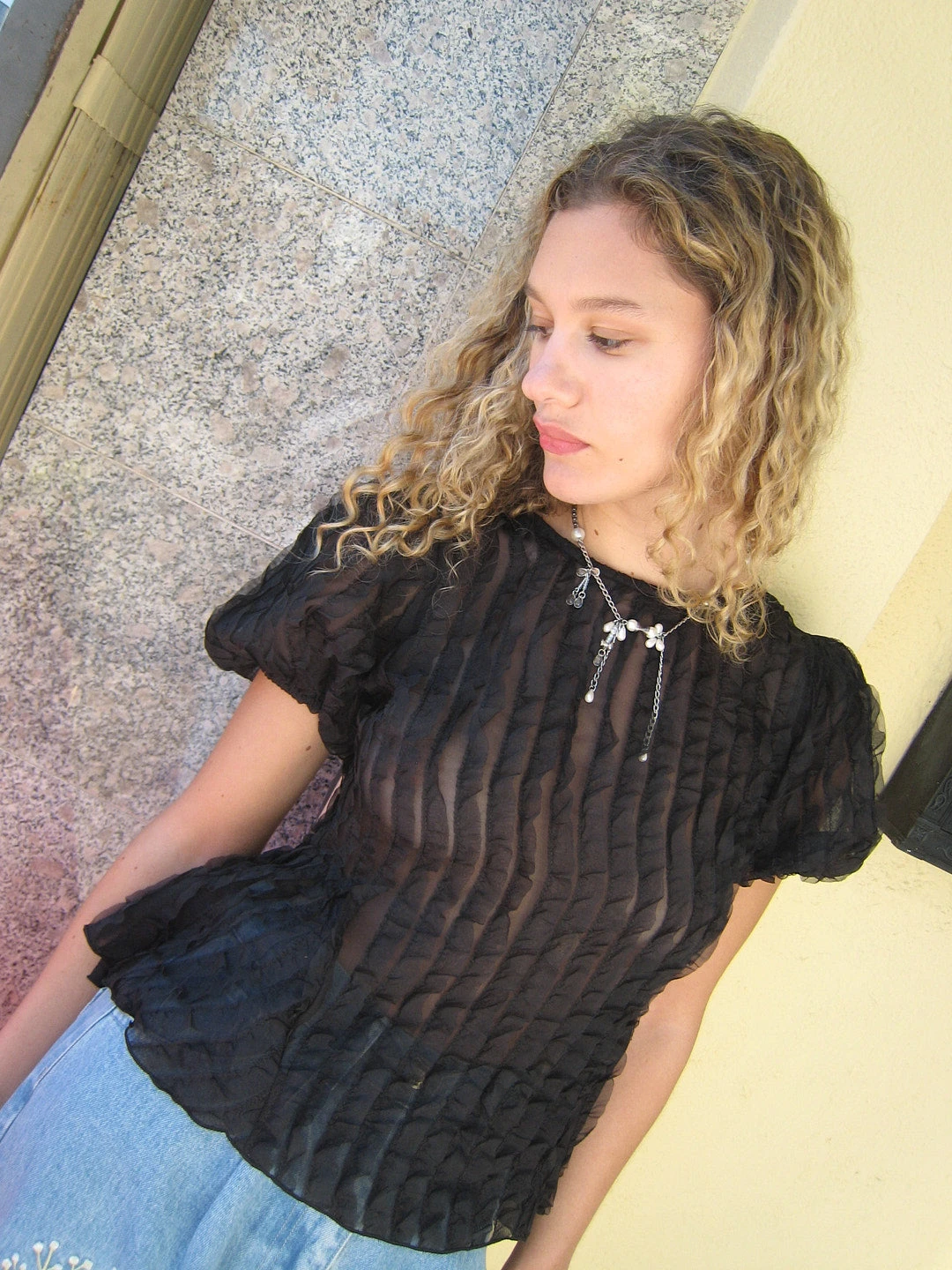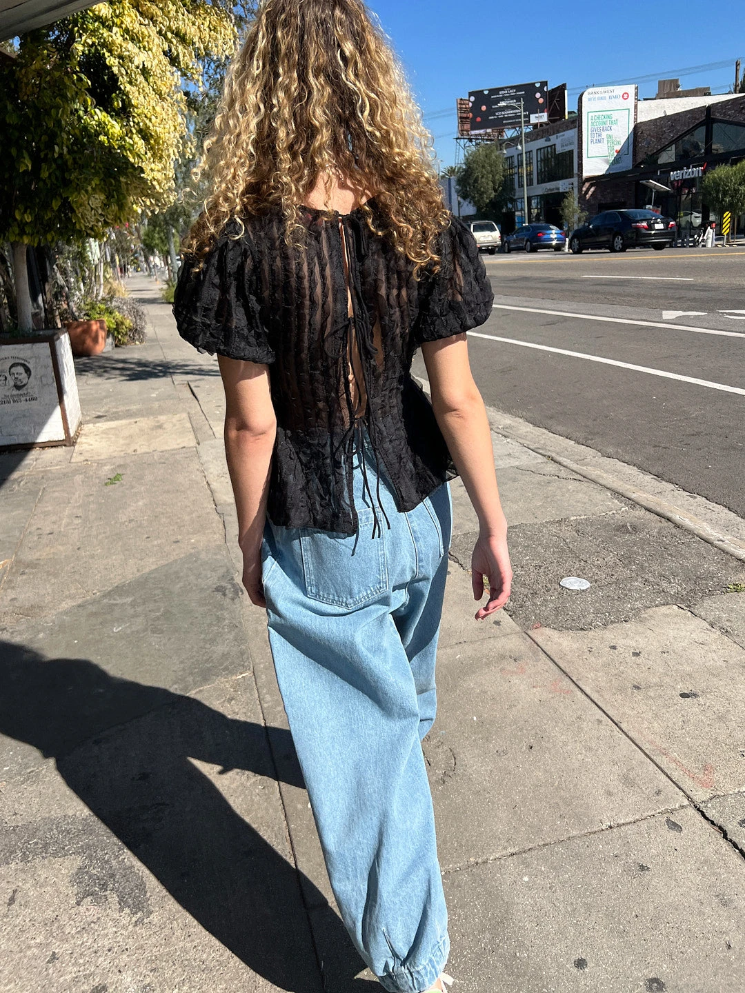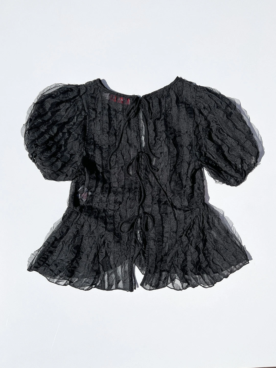Feel and looks like a dream in Petra Blouse. Featuring puff sleeves and a flutter peplum waist with delicate adjustable ties in the back details. Sheer.
