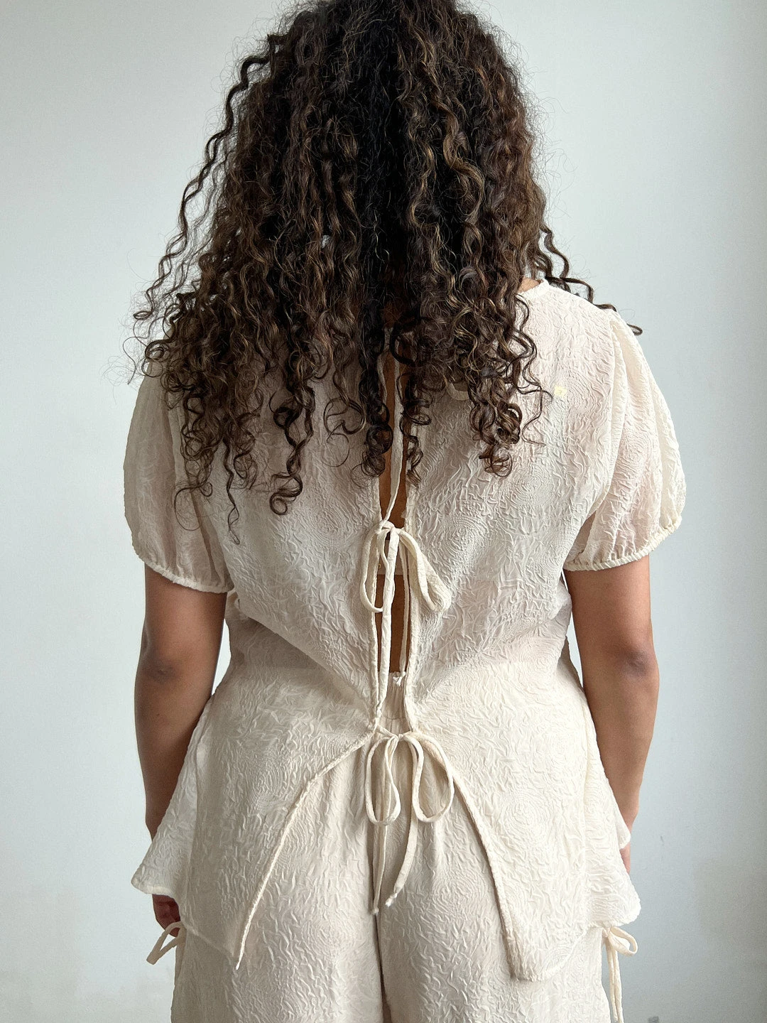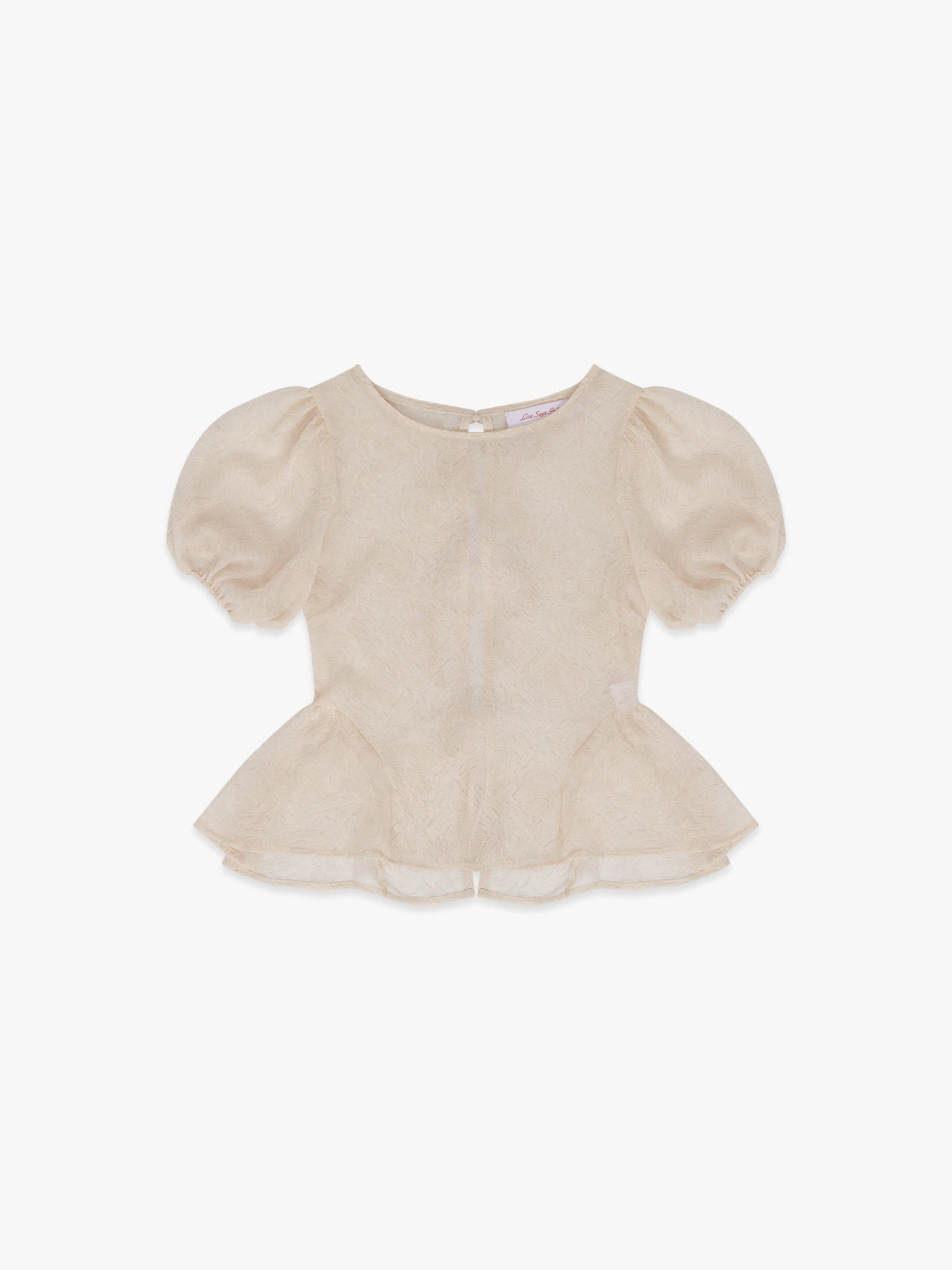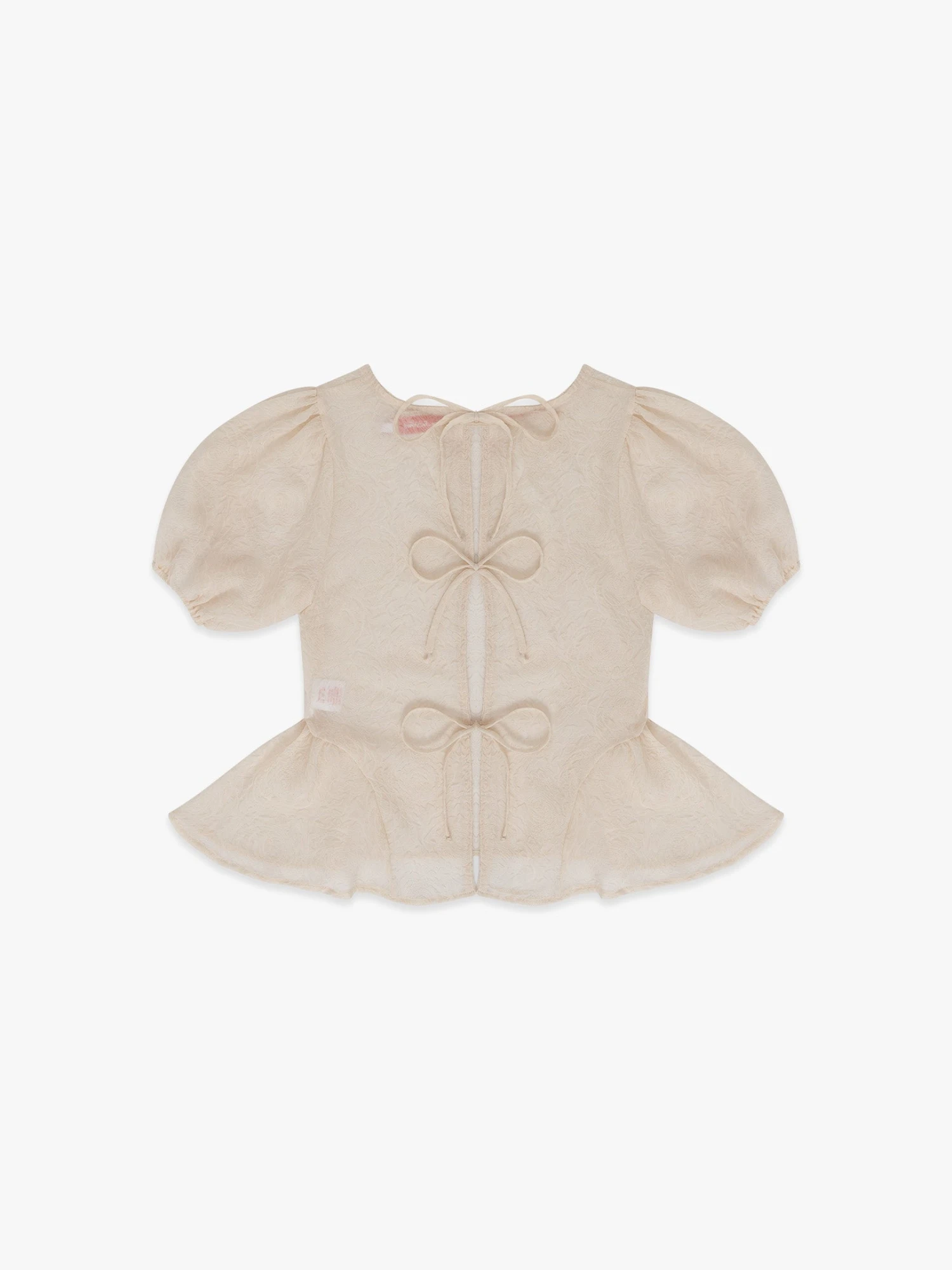 Sheer, unlined, cream colored, rosette-printed blouse, that features puff sleeves, and open back with three bow tie closures, and a peplum.