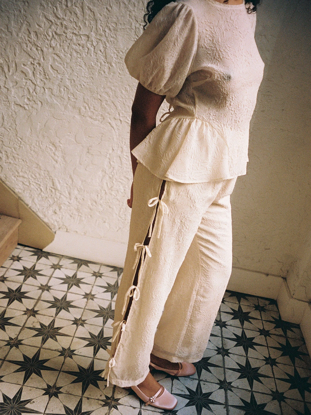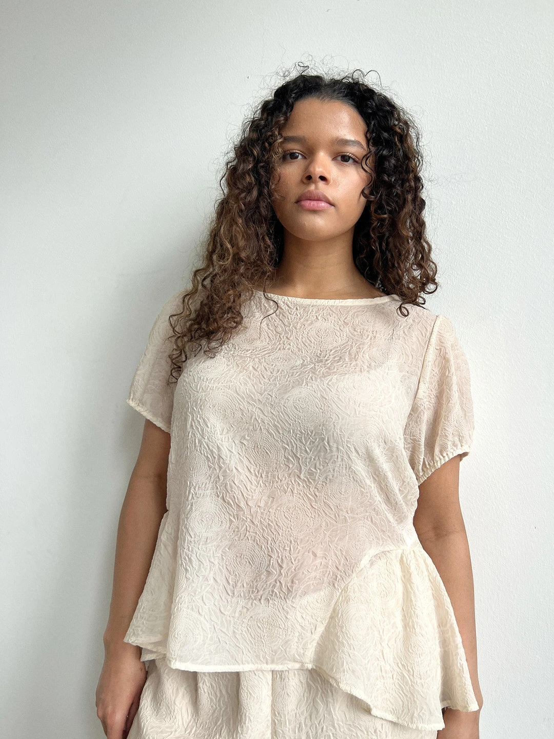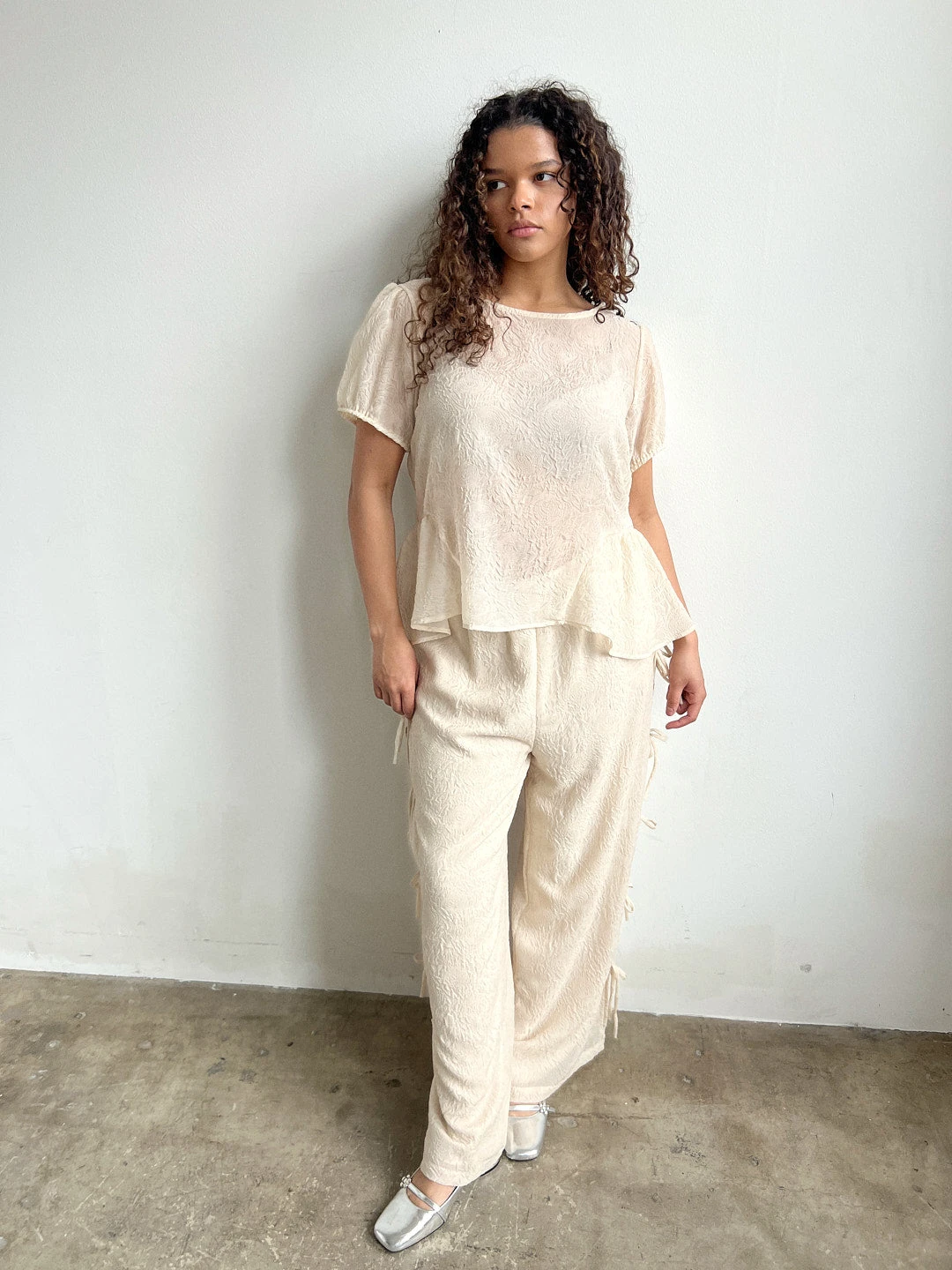 Sheer, unlined, cream colored, rosette-printed blouse, that features puff sleeves, and open back with three bow tie closures, and a peplum.