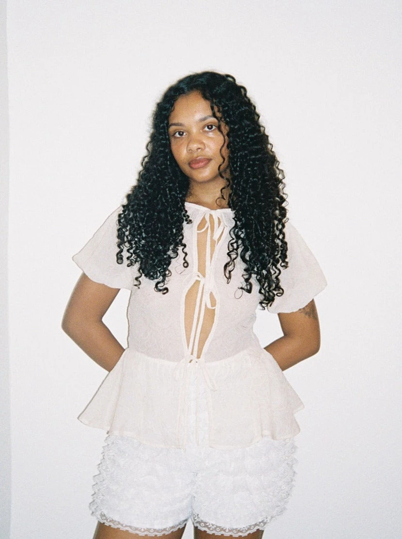 Whimsical yet stylish, this cashew rosette Petra Blouse is a must-have for those who want to make a statement. With sheer material, puffed sleeves, and an open back adorned with three bow tie closures, this cream-colored blouse also features a peplum for a playful touch.