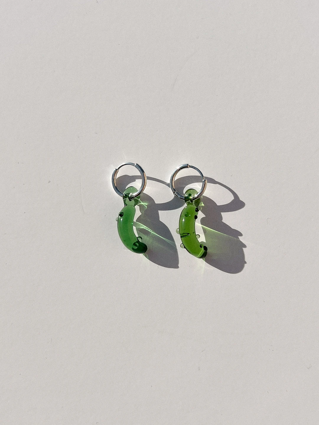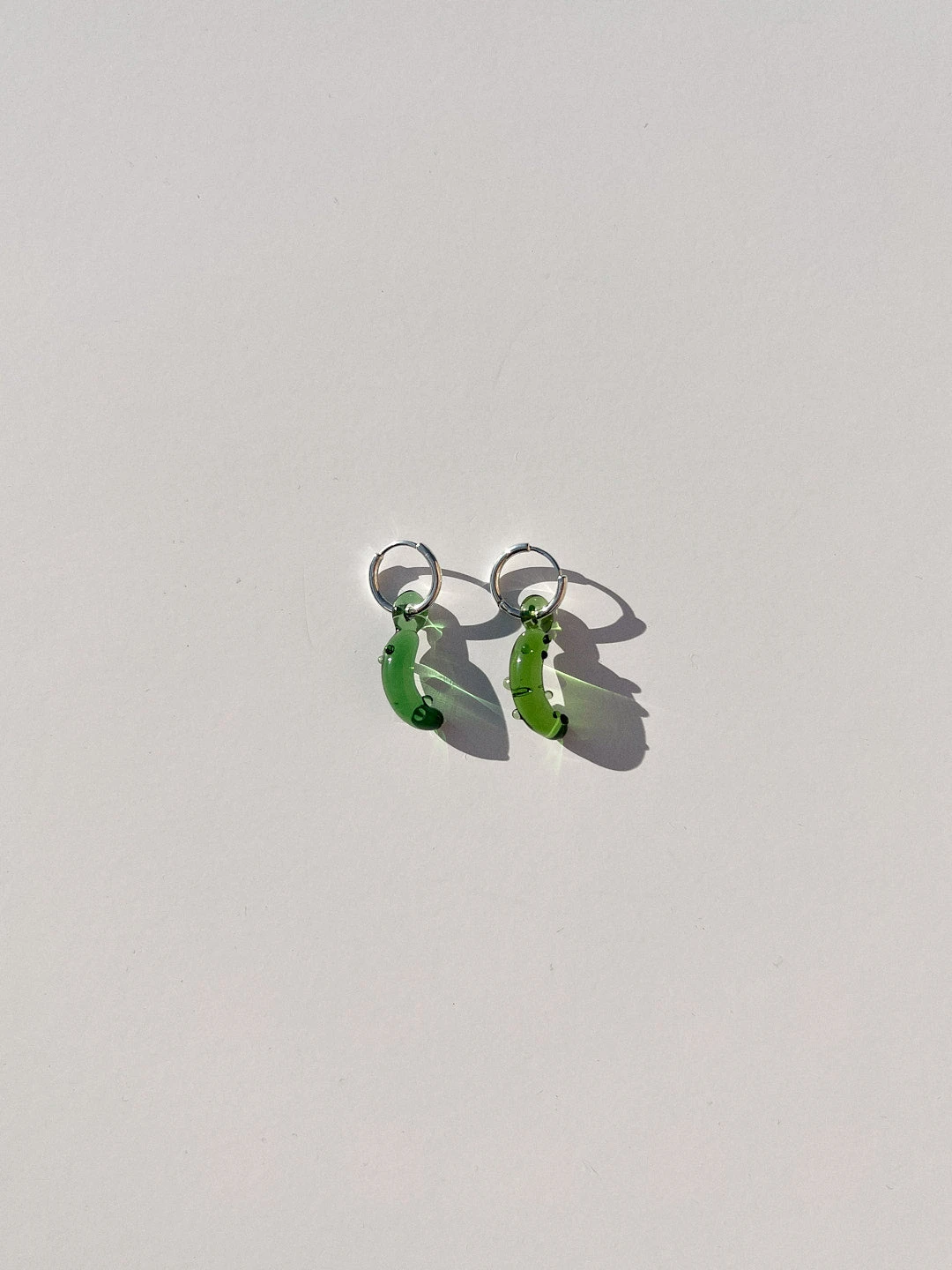 Handblown glass green pickle charms on thin silver hoops. Sold as a set of two.