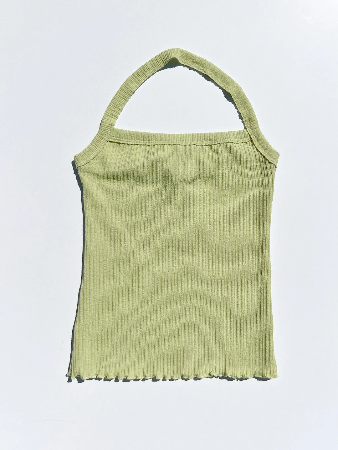 A light green Japanese rib knit halter knit tank top. Fitted.