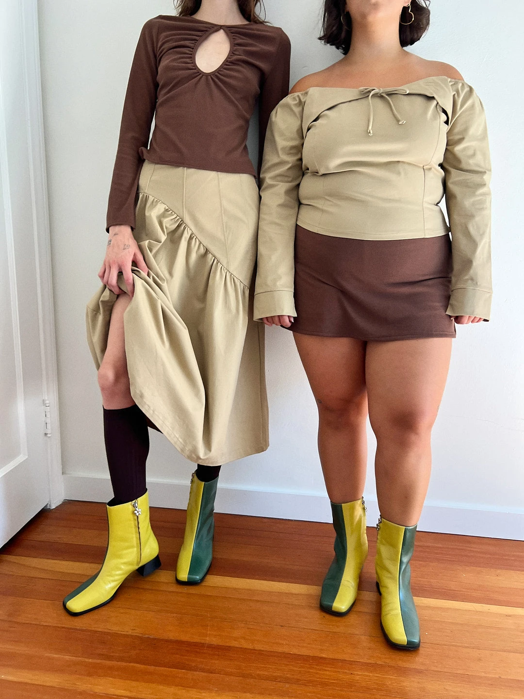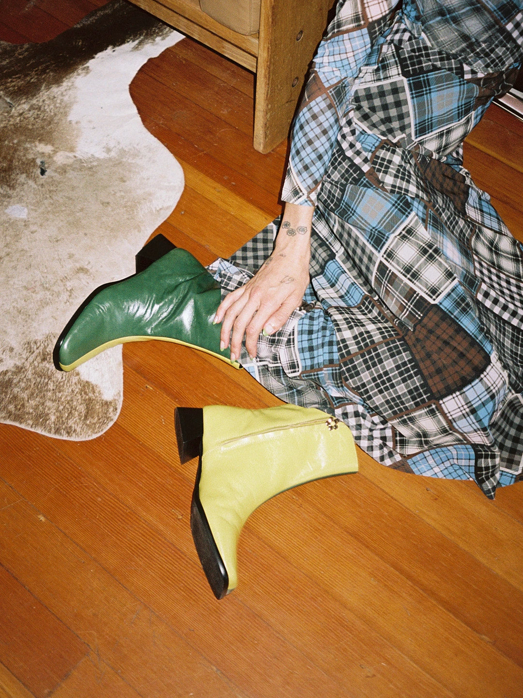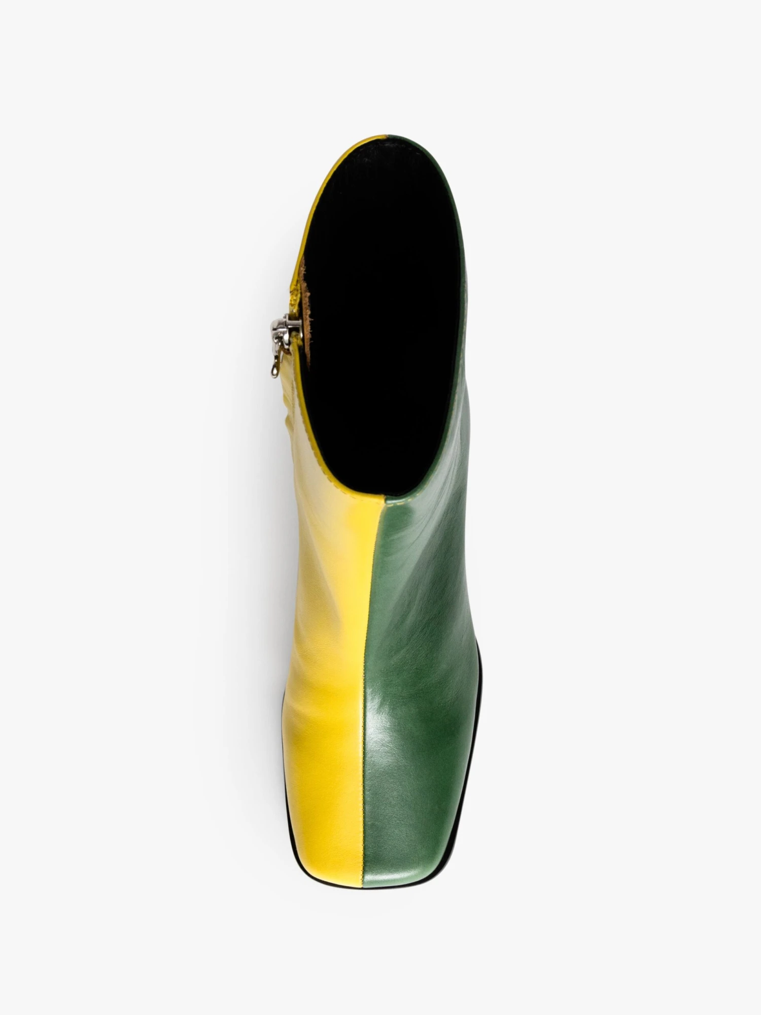 A green and yellow color block ankle boot with a square toe and zipper, featuring a silver flower detail and black sole.